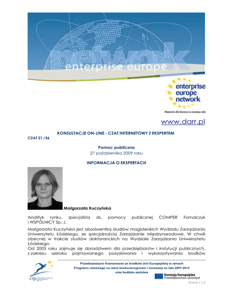 www.darr.pl KONSULTACJE ON-LINE - CZAT INTERNETOWY Z EKSPERTEM CZAT 21 /36 Pomoc publiczna 27 października 2009 roku INFORMACJA O EKSPERTACH Małgorzata Kuczyńska Analityk rynku, specjalista i WSPÓLNICY Sp. J. ds. pomocy publicznej COMPER Fornalczyk Małgorzata Kuczyńska jest absolwentką studiów magisterskich Wydziału Zarządzania Uniwersytetu Łódzkiego, ze specjalnością Zarządzanie Międzynarodowe. W chwili obecnej w trakcie studiów doktoranckich na Wydziale Zarządzania Uniwersytetu Łódzkiego. Od 2003 roku zajmuje się doradztwem dla przedsiębiorstw i instytucji publicznych, z zakresu szeroko pojmowanego pozyskiwania i wykorzystywania środków Przedsięwzięcie finansowane ze środków Unii Europejskiej w ramach Programu ramowego na rzecz konkurencyjności i innowacji na lata 2007-2013 oraz budŜetu państwa strona 1 z 2 publicznych, ze szczególnym uwzględnieniem Funduszy Strukturalnych UE. Ponadto posiada dobrą znajomość polskiego i europejskiego prawa pomocy publicznej z uwzględnieniem orzecznictwa ETS związanego z tematyką pomocy publicznej. Pracowała przy wielu projektach doradczych z zakresu pomocy publicznej, realizowanych zarówno dla dawców jak i beneficjantów pomocy publicznej. Małgorzata Kuczyńska posiada doświadczenie w prowadzeniu szkoleń z tematyki związanej z pomocą publiczną. Łukasz Grzejdziak Specjalista ds. pomocy publicznej COMPER Fornalczyk i WSPÓLNICY Sp. J. Łukasz Grzejdziak jest absolwentem Wydziału Prawa i Administracji Uniwersytetu Łódzkiego. Obecnie, w Katedrze Prawa Gospodarczego Publicznego tego Wydziału pracuje nad rozprawą doktorską na temat "Pomoc państwa dla przedsiębiorstw świadczących usługi w ogólnym interesie gospodarczym". W latach 2007-2008 był stypendystą Fundacji Kościuszkowskiej jako Visiting Scholar w Chicago-Kent College of Law, Illinois Institute of Technology a w 2008 roku członkiem Centrum Prawa Europejskiego Vrije Universiteit Brussel w Brukseli gdzie odbył staŜ naukowy. Od 2003 roku zajmuje się doradztwem z zakresu prawa pomocy publicznej i prawa antymonopolowego na rzecz przedsiębiorców i organów administracji publicznej. Brał udział jako doradca w licznych postępowaniach w sprawach z zakresu pomocy państwa oraz antymonopolowych. Jest autorem licznych opinii prawnych z zakresu prawa pomocy państwa, między innymi w sektorach: elektoenergetycznym, stoczniowym, transportu kolejowego i chemicznym. Prowadził liczne szkolenia z zakresu zasad udzielania pomocy państwa dla podmiotów publicznych i przedsiębiorców. Strona 2 z 2