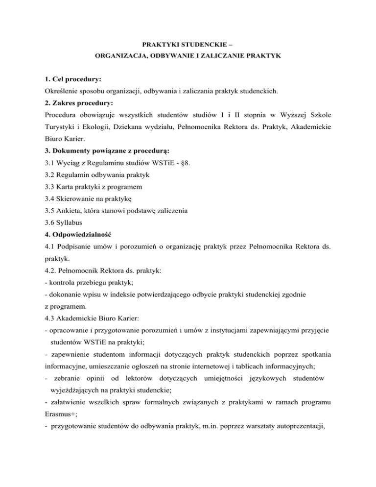 PRAKTYKI STUDENCKIE – ORGANIZACJA, ODBYWANIE I ZALICZANIE PRAKTYK 1. Cel procedury: Określenie sposobu organizacji, odbywania i zaliczania praktyk studenckich. 2. Zakres procedury: Procedura obowiązuje wszystkich studentów studiów I i II stopnia w Wyższej Szkole Turystyki i Ekologii, Dziekana wydziału, Pełnomocnika Rektora ds. Praktyk, Akademickie Biuro Karier. 3. Dokumenty powiązane z procedurą: 3.1 Wyciąg z Regulaminu studiów WSTiE - §8. 3.2 Regulamin odbywania praktyk 3.3 Karta praktyki z programem 3.4 Skierowanie na praktykę 3.5 Ankieta, która stanowi podstawę zaliczenia 3.6 Syllabus 4. Odpowiedzialność 4.1 Podpisanie umów i porozumień o organizację praktyk przez Pełnomocnika Rektora ds. praktyk. 4.2. Pełnomocnik Rektora ds. praktyk: - kontrola przebiegu praktyk; - dokonanie wpisu w indeksie potwierdzającego odbycie praktyki studenckiej zgodnie z programem. 4.3 Akademickie Biuro Karier: - opracowanie i przygotowanie porozumień i umów z instytucjami zapewniającymi przyjęcie studentów WSTiE na praktyki; - zapewnienie studentom informacji dotyczących praktyk studenckich poprzez spotkania informacyjne, umieszczanie ogłoszeń na stronie internetowej i tablicach informacyjnych; - zebranie opinii od lektorów dotyczących umiejętności językowych studentów wyjeżdżających na praktyki studenckie; - załatwienie wszelkich spraw formalnych związanych z praktykami w ramach programu Erasmus+; - przygotowanie studentów do odbywania praktyk, m.in. poprzez warsztaty autoprezentacji, informacje o miejscu i zasadach odbywania praktyki, organizację pierwszego kontaktu studenta z przedstawicielem zakładu pracy, informacje o obowiązkach studenta, związanych z przygotowaniem, odbywaniem i zaliczeniem praktyki, - prowadzenie bieżącej dokumentacji związanej z przygotowaniem i przebiegiem praktyk (programy i plany praktyk, umowy i skierowania na praktyki, sprawozdania z praktyk, zaświadczenie-opinie z zakładu pracy, sprawozdanie z praktyki). 5. Schemat postępowania: 5.1 Akademickie Biuro Karier w porozumieniu z Pełnomocnikiem Rektora ds. praktyk i staży przygotowuje ofertę praktyk krajowych i zagranicznych na dany rok akademicki. Oferta zostaje przedstawiona na spotkaniach informacyjnych ze studentami na każdym kierunku i roku studiów, zobowiązanych do odbywania praktyki. 5.2 Student po zapoznaniu się z ofertą zgłasza swoją propozycję dotyczącą wyboru miejsca praktyki otrzymuje ramowy program praktyk oraz kartę praktyki i ankietę stanowiącą podstawę zaliczenia praktyki. 5.3 Student może również zgłosić własną propozycję podmiotu gospodarki, gdzie chciałby zostać skierowany na praktyki. Pełnomocnik Rektora ds. praktyk wraz z Akademickim Biurem Karier dokonuje analizy z punktu przydatności zawodowej, na podstawie której podejmuje decyzję. 5.4 Studenci studiów niestacjonarnych również mogą korzystać z oferty praktyk przygotowanej przez Akademickie Biuro Karier. 5.5 W przypadku wyjazdu na praktyki zagraniczne dokonywany jest proces rekrutacji, w którym kluczową rolę odgrywa znajomość języka obcego potwierdzona przez lektora danego języka oraz wynik rozmowy kwalifikacyjnej z praktykodawcą. Dodatkowymi kryteriami są: wyniki w nauce oraz zaangażowanie na rzecz uczelni. Po uzyskaniu wyników rekrutacji osoby otrzymują szczegółowe dane dotyczące wyjazdu oraz osoby, która ze strony praktykodawcą będzie za nie odpowiedzialna. 5.6 Praktykę odbywa się od drugiego do siódmego semestru, w zależności od kierunku studiów. Student-praktykant w czasie praktyki realizuje program zgodny ze specjalnością studiów i uzyskuje potwierdzenie realizacji programu od praktykodawcą, u którego odbywał praktykę. Z chwilą rozpoczęcia odbywania praktyki student zobowiązany jest o powiadomienia o tym fakcie Akademickiego Biura Karier WSTiE – nie dotyczy to praktyk zagranicznych. Student zobowiązany jest do konieczności osiągnięcia w trakcie praktyki odpowiednich efektów kształcenia ujętych w sylabusie praktyki. 5.7 W przypadku odbywania praktyk za granicami kraju student zobowiązany jest do poinformowania Akademickiego Biura Karier o dotarciu na miejsce za pomocą poczty elektronicznej lub SMS i przesyłaniu raz na dwa tygodnie sprawozdań z pobytu w danym ośrodku. 5.8 Akademickie Biuro Karier odpowiedzialne jest do utrzymywania kontaktu z instytucjami przyjmującymi i przynajmniej raz w miesiącu kontaktowanie się z nią w celu dokonania monitoringu postępów studenta. Po każdy tego typu kontakcie zostaje sporządzona notatka umieszczana w dokumentacji praktyk. 5.9 Po powrocie z praktyk w ciągu 14 dni student zobowiązany jest do złożenia w Akademickim Biurze Karier sprawozdania z praktyki (według załączonego schematu), karty praktyki, opinii pracodawcy wraz z oceną oraz wypełnionej ankiety. Pełnomocnik Rektora ds. praktyk po dokonaniu weryfikacji, stwierdzeniu zrealizowania założonego programu praktyki, zapoznaniu się z odpowiedziami w ankiecie i krótkim spotkaniu ze studentem potwierdzającym osiągnięcie efektów kształcenia dokonuje wpis do indeksu. Ocena końcowa praktyki (ocena uzyskana przez opiekuna praktyki/pracodawcę, karta praktyk, sprawozdanie). 5.10 Dziekan dokonując zaliczenia semestru sprawdza również wpis dotyczący praktyki studenckiej dokonany przez Pełnomocnika Rektora ds. praktyk i zalicza praktykę. Zaliczenie praktyki możliwe jest jedynie pod warunkiem osiągnięcia przez studenta pozytywnych efektów kształcenia ujętych w sylabusie przedmiotowym. Załącznik nr 5 ANKIETA – PRAKTYKI ZAWODOWE/STAŻ Nazwisko i imię: …………………………………………………………………………….…. Kierunek studiów:……………………..………………… rok studiów………………….… Tryb stacjonarny/ niestacjonarny…………..………. nr albumu:……………….…………… Data odbywania praktyki/ stażu : od…………………
