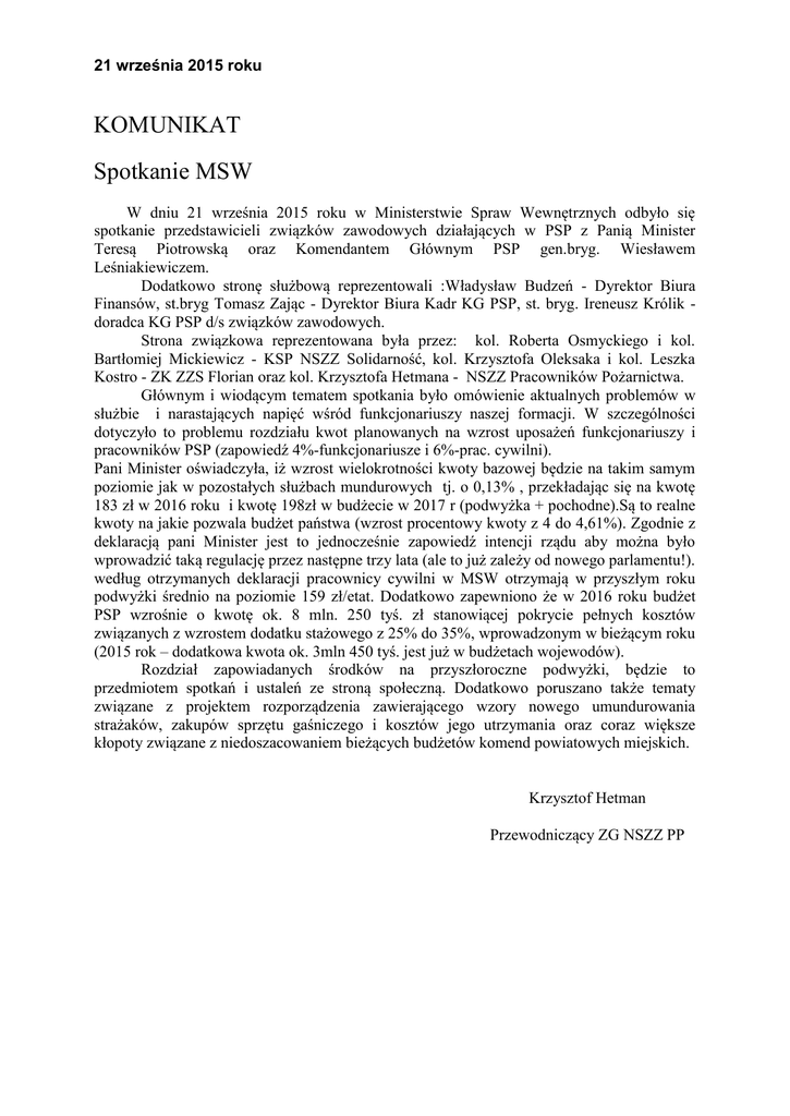 21 września 2015 roku KOMUNIKAT Spotkanie MSW W dniu 21 września 2015 roku w Ministerstwie Spraw Wewnętrznych odbyło się spotkanie przedstawicieli związków zawodowych działających w PSP z Panią Minister Teresą Piotrowską oraz Komendantem Głównym PSP gen.bryg. Wiesławem Leśniakiewiczem. Dodatkowo stronę służbową reprezentowali :Władysław Budzeń - Dyrektor Biura Finansów, st.bryg Tomasz Zając - Dyrektor Biura Kadr KG PSP, st. bryg. Ireneusz Królik doradca KG PSP d/s związków zawodowych. Strona związkowa reprezentowana była przez: kol. Roberta Osmyckiego i kol. Bartłomiej Mickiewicz - KSP NSZZ Solidarność, kol. Krzysztofa Oleksaka i kol. Leszka Kostro - ZK ZZS Florian oraz kol. Krzysztofa Hetmana - NSZZ Pracowników Pożarnictwa. Głównym i wiodącym tematem spotkania było omówienie aktualnych problemów w służbie i narastających napięć wśród funkcjonariuszy naszej formacji. W szczególności dotyczyło to problemu rozdziału kwot planowanych na wzrost uposażeń funkcjonariuszy i pracowników PSP (zapowiedź 4%-funkcjonariusze i 6%-prac. cywilni). Pani Minister oświadczyła, iż wzrost wielokrotności kwoty bazowej będzie na takim samym poziomie jak w pozostałych służbach mundurowych tj. o 0,13% , przekładając się na kwotę 183 zł w 2016 roku i kwotę 198zł w budżecie w 2017 r (podwyżka + pochodne).Są to realne kwoty na jakie pozwala budżet państwa (wzrost procentowy kwoty z 4 do 4,61%). Zgodnie z deklaracją pani Minister jest to jednocześnie zapowiedź intencji rządu aby można było wprowadzić taką regulację przez następne trzy lata (ale to już zależy od nowego parlamentu!). według otrzymanych deklaracji pracownicy cywilni w MSW otrzymają w przyszłym roku podwyżki średnio na poziomie 159 zł/etat. Dodatkowo zapewniono że w 2016 roku budżet PSP wzrośnie o kwotę ok. 8 mln. 250 tyś. zł stanowiącej pokrycie pełnych kosztów związanych z wzrostem dodatku stażowego z 25% do 35%, wprowadzonym w bieżącym roku (2015 rok – dodatkowa kwota ok. 3mln 450 tyś. jest już w budżetach wojewodów). Rozdział zapowiadanych środków na przyszłoroczne podwyżki, będzie to przedmiotem spotkań i ustaleń ze stroną społeczną. Dodatkowo poruszano także tematy związane z projektem rozporządzenia zawierającego wzory nowego umundurowania strażaków, zakupów sprzętu gaśniczego i kosztów jego utrzymania oraz coraz większe kłopoty związane z niedoszacowaniem bieżących budżetów komend powiatowych miejskich. Krzysztof Hetman Przewodniczący ZG NSZZ PP
