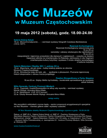 Noc Muzeów w Muzeum Czêstochowskim 19 maja 2012 (sobota), godz. 18.00-24.00 Galeria Dobrej Sztuki 18.oo Monochromatycznie… – wernisa¿ wystawy fotografii Czes³awa Bankiewicza (1912–1977) Rezerwat Archeologiczny Rezerwat Archeologiczny wieczorow¹ por¹ 18.oo-20.oo warsztaty i zabawy edukacyjne dla najm³odszych 18.oo-24.oo niespodzianki i tajemnice przesz³oœci dla starszych i najstarszych – czaszka ze œladami trepanacji odkryta na cmentarzysku na Rakowie, zachowany in situ fragment cmentarzyska kultury ³u¿yckiej i wystawa Z mroku dziejów opowiadaj¹ca o kulturze ³u¿yckiej Galeria Malarstwa i RzeŸby XIX i 1. po³owy XX w. 19.oo Wypchane, ale jak ¿ywe – kulisy kolekcji ptaków ze zbiorów Muzeum Czêstochowskiego 20.oo Dinozaurów tutaj nie by³o, ale... spotkanie z pliozaurem. Poznanie tajemniczej historii eksponatów z okresu morza jurajskiego Pawilon Etnograficzny w Parku Staszica 18.oo-22.oo Gdyby Nikifor by³ kobiet¹ – kuratorskie oprowadzanie po wystawie sztuki ludowej Willa Genera³a, Centrum Promocji M³odych 20.oo Trupiciele i trupiki/Rozwiesi³em te w³osy aby wysch³y – wernisa¿ wystawy Moniki Wy³ogi i Anouara Abou-Hilala 21.15 NiedŸwiecki LIVE 2012 koncert 22.3o Etiudy filmowe Moniki Wy³ogi i Anouara Abou-Hilala wstêp wolny We wszystkich oddzia³ach czynne bêd¹ – oprócz propozycji przygotowanych specjalnie na Noc Muzeów – równie¿ galerie sta³e i wystawy czasowe. W Noc Muzeów obiekty Muzeum Czêstochowskiego czynne w godz. 18.00-24.00 Ratusz, al. NMP 45 A · Galeria Dobrej Sztuki, al. NMP 47 · Pawilony Wystawowe w Parku Stanis³awa Staszica: Pawilon Wystawowy, Pawilon Etnograficzny, Muzeum Górnictwa Rud ¯elaza, Multicentrum „Zodiak” · Galeria Malarstwa i RzeŸby XIX i XX wieku, ul. Katedralna 8 · Dom Poezji – Muzeum Haliny Poœwiatowskiej, ul. Jasnogórska 23 · Centrum Promocji M³odych, Willa Genera³a, al. Wolnoœci 30 www.muzeumczestochowa.pl Zbieramy piecz¹tki OdwiedŸ co najmniej 6 oddzia³ów Muzeum Czêstochowskiego i zbierz minimum 6 piecz¹tek na ulotce Nocy Muzeów. Do koñca roku bêdzie mo¿liwoœæ darmowego wejœcia dla dwóch osób przy zwiedzaniu wybranej wystawy. Aby skorzystaæ z promocji, podczas zwiedzania obiektu poka¿ w kasie opieczêtowan¹ ulotkê. Promocja obowi¹zuje do 30 grudnia 2012 roku. Przypominamy, ¿e w ka¿d¹ œrodê wstêp na wiêkszoœæ wystaw jest wolny. Losowanie z nagrodami Osoby, które w Noc Muzeów oka¿¹ opieczêtowan¹ ulotkê w Ratuszu otrzymaj¹ do wype³nienia kupon. Wœród nich o godz. 23.30 zostanie rozlosowana nagroda – 4-tomowa monografia Dzieje miasta Czêstochowy o wartoœci 400 z³. Zapraszamy na imprezy i wystawy! Janusz Jadczyk Dyrektor Muzuem Czêstochowskiego miejsce na piecz¹tki w ó m i e k s z w o u h c o t M s ê z c C o m u N uze wM
