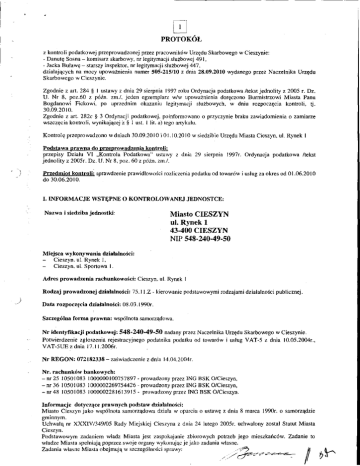 1 PROTOKOL z kontroli podatkowej przeprowadzonej przez pracownik6w Urzgdu Skarbowego w Cieszynie: - Danute Sosna — komisarz skarbowy, nr legitymacji stu2bowej 491, - Jacka Butawg — starszy inspektor, nr legitymacji slu2bowej 447, dzialajacych na mocy upowa2nienia numer 505-215/10 z dnia 28.09.2010 wydanego przez Naczelnika Urzedu Skarbowego w Cieszynie. Zgodnie z art. 284 § I ustawy z dnia 29 sierpnia 1997 roku Ordynacja podatkowa /tekst jednolity z 2005 r. Dz. U. Nr 8, poz.60 z pain. zm./, jeden egzemplarz w/w upowa2nienia doreczono Burmistrzowi Miasta Panu Bogdanowi Fickowi, po uprzednim okazaniu legitymacji sluthowych, w dniu rozpoczecia kontroli, tj. 30.09.2010. Zgodnie z art. 282c § 3 Ordynacji podatkowej, poinformowano o przyczyn e braku zawiadomienia o zamiarze wszczecia kontroli, wynikajacej z § 1 ust. 1 lit. a) tego artykutu. Kontrolc przeprowadzono w dniach 30.09.2010 i 01.10.20 10 w siedzibie Urzedu Miasta Cieszyn, ul. Rynek I Podstawa prawna do orzenrowadzenia kontroli: przepisy Dzialu VI „Kontrola Podatkowa" ustawy z dnia 29 sierpnia I 997r. Ordynacja podatkowa /tekst jednolity z 2005r. Dz. U. Nr 8. poz. 60 z pO2n. zm./. Przedmiot kontroli: sprawdzenie prawidlowoki rozliczenia podatku od towarOw i ustug za okres od 01.06.2010 do 30.06.2010. I. INFORMACJE WSTkPNE 0 KONTROLOWANEJ JEDNOSTCE: Nazwa i siedziba jednostki: Miasto CIESZYN ul. Rynek 1 43-400 CIESZYN NIP 548-240-49-50 Miejsca wykonywania dziablnokh — Cieszyn. ul. Rynek I, Cieszyn, ul. Sportowa I. Adres prowadzenia rachunkowokb Cieszyn, ul. Rynek I Rodzaj prowadzonej 75.11.Z - kierowanie podstawowymi rodzajami dzialalnoSci publicznej. Data rozpoczycia dzialalnotch 08.03.1990r. SzczegOlna forma prawna: wspOlnota samorzadowa. Nr identyfikacji podatkowej: 548-240-49-50 nadany przez Naczelnika Urzedu Skarbowego w Cieszynie. Potwierdzenie zgtoszenia rejestracyjnego podatnika podatku od towarOw i uslug VAT-5 z dnia 10.05.2004r., VAT-5UE z dnia 17.11.2006r. Nr REGON: 072182338 — za gwiadczenie z dnia 14.04.2004r. Nr. rachunkliw bankowych: — nr 25 10501083 1000000100757897 - prowadzony przez ING BSK 0/Cieszyn, — nr 36 10501083 1000002269754426 - prowadzony przez ING BSK 0/Cieszyn, — nr 48 10501083 1000002281613915 - prowadzony przez ING BSK 0/Cieszyn. Informacje dotycz4ce prawnych podstaw Miasto Cieszyn jako wspOlnota samorzadowa dziala w oparciu o ustawe z dnia 8 marca 1990r. o samorzkdzie gminnym. Uchwaia nr XXXIV/349/05 Rady Miejskiej Cieszyna z dnia 24 lutego 2005r. uchwalony zostal Statut Miasta Cieszyn. Podstawowym zadaniem wladz Miasta jest zaspokajanie zbiorowych potrzeb jego mieszkaficOw. Zadanie to wladze Miasta speiniaja poprzez swoje organy wykonujac je jako zadania wiasne. Zadania wlasne Miasta obejmuja w szczegOlnoSci sprawy: -1Yr, fl-• 2 1/ ladu przestrzennego, gospodarki nieruchomo§ciani, ochrony arodowiska i przyrody oraz gospodarki wodnej, 2/ miejskich dr6g, ulic, mostOw, placOw oraz organizacji ruchu drogowego, 3/ wodociagOw i zaopatrzenia w wodc, kanalizacji, usuwania i oczyszczania §ciekOw komunalnych, utrzymania czystoaci i porzadku oraz urzadzeti sanitarnych, wysypisk i unieszkodliwiania odpad6w komunalnych, zaopatrzenia w energic elektryczna i ciepink oraz gaz, 4/ lokalnego transportu zbiorowego, 5/ ochrony zdrowia, 6/ pomocy spolecznej, w tym o grodkOw i zakladOw opiekunczych, 7/ komunalnego budownictwa mieszkaniowego, 8/ edukacji publicznej, 9/ kultury, w tym bibliotek komunalnych i innych placOwek upowszechniania kultury, 10/ kultury fizycznej i turystyki, w tym terenOw rekreacyjnych i urzadzefi sportowych, 11/ targowisk i hal targowych, 12/ zieleni gminnej i zadrzewien, 13/ cmentarzy komunalnych, 14/ porzkdku publicznego i bezpieczenstwa obywateli oraz ochrony przeciwpotarowej i przeciw powodziowej, 15/ utrzymania miejskich obiektOw i urzadzen uZytecznoSci publicznej oraz obiektOw administracyjnych, 16/ polityki prorodzinnej, w tym zapewnienie kobietom w ciny opieki socjalnej, medycznej i prawnej, 17/ wspieranie i upowszechnianie idei samorzadowej, 18/ promocji miasta, 20/ wspOlpracy z organizacjami pozarzadowymi, 21/ wspOlpracy ze spolecznoaciami lokalnym i regionalnymi innych paristw. Zgodnie z zagwiadczeniem Miejskiej Komisji Wyborczej w Cieszynie z dnia 30.11.2006r. w wyborach, ktdre odbyty sic 12 listopada 2006r. Burmistrzem Miasta Cieszyna zostal wybrany Bogdan Ficek. Zgodnie z art. 285 § I Ordynacji podatkowej, czynnoci kontrolnych dokonano w obecnoki Burmistrza Miasta oraz Pani Ruty Kaczmarczyk - Naczelnika Wydziatu Finansowego - upowahilenie stanowi zatqcznik nr 1 do protokolu. Podczas kontroli Miasto Cieszyn reprezentowane byto przez w/w, ktOrzy udzielali wyjaanieii do protokolu. Kontrolujacy dokonali wpisu w ksia2ce kontroli pod nr. 8/2010. H USTALENIA SZCZEGOLOWE Do kontroli przedlotono: rejestry sprzedaty i zakup6w za czerwiec 2010r., dowody trOdtowe berlace podstawat zapisOw w w/w rejestrach, kopic deklaracji VAT-7 za w/w okres. dokumenty rejestracyjne, 1.1 Podstawa prawna zakresu przedmiotowego kontroli podatkowej: ustawa z dnia 11.03.2004r. o podatku od towarow i uslug (Dz. U. Nr 54 z dnia 05.04.2004r. poz. 535 z pOin. zm.), rozporzadzenie Ministra FinansOw z dnia 24.12.2009r. w sprawie wykonania niektOrych przepis6w ustawy o podatku od towar6w i uslug (Dz. U. Nr 224 poz. 1799 z p6in. zm .), rozporzadzenie Ministra FinansOw z dnia 28.11.2008r. w sprawie zwrotu podatku niektOrym podatnikom, wystawiania faktur, sposobu ich przechowywania oraz listy towarOw i uslug, do ktOrych nie maja zastosowania zwolnienia od podatku od towarOw i uslug (Dz. U. Nr 212 poz.1337 z p62n. zm .). 1.2 Czynnoici kontrolne obejmowaly: sprawdzenie zgodnoki dowoclOw sprzeda2y i zakupOw z wymogami wynikaj4cymi z cyt. rozporzadzenia, porOwnanie zapisOw dokonanych w rejestrach prowadzonych dla potrzeb podatku od towarOw i uslug z przedlo±onymi dowodami irOdlowymi. porOwnanie danych wynikajacych z w/w rejestrOw sprzeda4 i zakupu VAT z deklaracji VAT-7, sprawdzenie stosowania stawek preferen