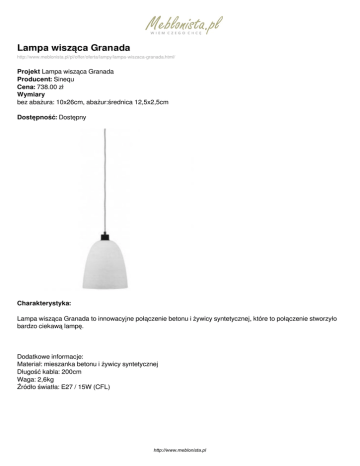 Lampa wisząca Granada http://www.meblonista.pl/pl/offer/oferta/lampy/lampa-wiszaca-granada.html/ Projekt Lampa wisząca Granada Producent: Sinequ Cena: 738.00 zł Wymiary bez abażura: 10x26cm, abażur:średnica 12,5x2,5cm Dostępność: Dostępny Charakterystyka: Lampa wisząca Granada to innowacyjne połączenie betonu i żywicy syntetycznej, które to połączenie stworzyło bardzo ciekawą lampę. Dodatkowe informacje: Materiał: mieszanka betonu i żywicy syntetycznej Długość kabla: 200cm Waga: 2,6kg Źródło światła: E27 / 15W (CFL) http://www.meblonista.pl http://www.meblonista.pl Zdjęcia produktu: http://www.meblonista.pl Powered by TCPDF (www.tcpdf.org)