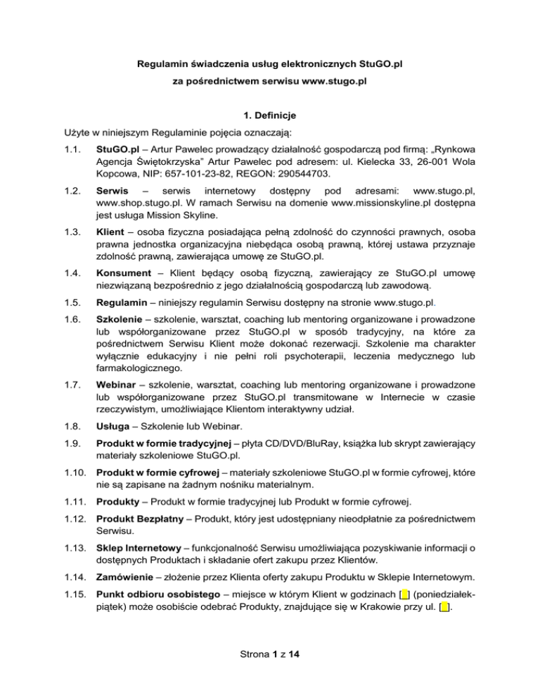 Regulamin świadczenia usług elektronicznych StuGO.pl za pośrednictwem serwisu www.stugo.pl 1. Definicje Użyte w niniejszym Regulaminie pojęcia oznaczają: 1.1. StuGO.pl – Artur Pawelec prowadzący działalność gospodarczą pod firmą: „Rynkowa Agencja Świętokrzyska” Artur Pawelec pod adresem: ul. Kielecka 33, 26-001 Wola Kopcowa, NIP: 657-101-23-82, REGON: 290544703. 1.2. Serwis – serwis internetowy dostępny pod adresami: www.stugo.pl, www.shop.stugo.pl. W ramach Serwisu na domenie www.missionskyline.pl dostępna jest usługa Mission Skyline. 1.3. Klient – osoba fizyczna posiadająca pełną zdolność do czynności prawnych, osoba prawna jednostka organizacyjna niebędąca osobą prawną, której ustawa przyznaje zdolność prawną, zawierająca umowę ze StuGO.pl. 1.4. Konsument – Klient będący osobą fizyczną, zawierający ze StuGO.pl umowę niezwiązaną bezpośrednio z jego działalnością gospodarczą lub zawodową. 1.5. Regulamin – niniejszy regulamin Serwisu dostępny na stronie www.stugo.pl. 1.6. Szkolenie – szkolenie, warsztat, coaching lub mentoring organizowane i prowadzone lub współorganizowane przez StuGO.pl w sposób tradycyjny, na które za pośrednictwem Serwisu Klient może dokonać rezerwacji. Szkolenie ma charakter wyłącznie edukacyjny i nie pełni roli psychoterapii, leczenia medycznego lub farmakologicznego. 1.7. Webinar – szkolenie, warsztat, coaching lub mentoring organizowane i prowadzone lub współorganizowane przez StuGO.pl transmitowane w Internecie w czasie rzeczywistym, umożliwiające Klientom interaktywny udział. 1.8. Usługa – Szkolenie lub Webinar. 1.9. Produkt w formie tradycyjnej – płyta CD/DVD/BluRay, książka lub skrypt zawierający materiały szkoleniowe StuGO.pl. 1.10. Produkt w formie cyfrowej – materiały szkoleniowe StuGO.pl w formie cyfrowej, które nie są zapisane na żadnym nośniku materialnym. 1.11. Produkty – Produkt w formie tradycyjnej lub Produkt w formie cyfrowej. 1.12. Produkt Bezpłatny – Produkt, który jest udostępniany nieodpłatnie za pośrednictwem Serwisu. 1.13. Sklep Internetowy – funkcjonalność Serwisu umożliwiająca pozyskiwanie informacji o dostępnych Produktach i składanie ofert zakupu przez Klientów. 1.14. Zamówienie – złożenie przez Klienta oferty zakupu Produktu w Sklepie Internetowym. 1.15. Punkt odbioru osobistego – miejsce w którym Klient w godzinach [_] (poniedziałekpiątek) może osobiście odebrać Produkty, znajdujące się w Krakowie przy ul. [_]. Strona 1 z 14 1.16. Newsletter – elektroniczna forma biuletynu informacyjnego StuGO.pl przeznaczonego dla wszystkich osób zainteresowanych [_] i wysyłana do nich przez StuGO.pl, za ich zgodą, za pośrednictwem poczty elektronicznej. 1.17. Ustawa o prawach konsumenta – Ustawa o prawach konsumenta z dnia 30 maja 2014 r. (Dz.U. z 2014 r. poz. 827). 1.18. Ustawa o świadczeniu usług drogą elektroniczną – Ustawa z dnia 18 lipca 2002 roku o świadczeniu usług drogą elektroniczną (Dz. U. z 2002 roku, Nr 144, poz. 1204 ze zm.). 1.19. Ustawa o ochronie danych osobowych – Ustawa z dnia 29 sierpnia 1997 roku o ochronie danych osobowych (tekst jedn.: Dz.U. z 2002 roku, nr 101, poz. 926 ze zm). 1.20. Kodeks Cywilny – Ustawa z dnia 23 kwietnia 1964 roku – Kodeks cywilny (Dz.U. z 1964 roku, nr 16, poz. 93 z późn. zm.). 2. Postanowienia ogólne 2.1. Regulamin jest regulaminem, o którym mowa w art. 8. Ustawy o świadczeniu usług drogą elektroniczną. 2.2. StuGO.pl świadczy drogą elektroniczną (za pośrednictwem Serwisu) następujące usługi: 2.2.1. Newsletter, 2.2.2. sprzedaż Produktów w Sklepie Internetowym 2.2.3. dostawę Produktów w formie cyfrowej, 2.2.4. zawarcia umowy o udział w Szkoleniu, 2.2.5. Webinarów. 2.3. StuGO.pl za pośrednictwem Serwisu prowadzi także Sklep Internetowy. 2.4. Dane kontaktowe, pod którymi Klienci szybko i efektywnie mogą kontaktować się z StuGO.pl to: 2.4.1. adres poczty elektronicznej: [email protected], 2.4.2. telefon: 604 220 795, 2.4.3. adresy: ul. Świętokrzyska 4 lok. 1 (30-015 Kraków) lub ul. Kielecka 33 (26-001 Wola Kopcowa). 2.5. StuGO.pl kontaktuje się z Klientami za pośrednictwem Serwisu, poczty elektronicznej lub przy wykorzystaniu Newslettera. 2.6. Zakazane jest dostarczanie treści o charakterze bezprawnym w jakikolwiek sposób w ramach korzystania z Serwisu przez Klientów. 2.7. Dla prawidłowej współpracy z systemem teleinformatycznym StuGo.pl, system teleinformatyczny, z którego korzysta Klient powinien spełniać następujące minimalne wymagania techniczne: 2.7.1. Zapewniać dostęp do sieci Internet. Strona 2 z 14 2.7.2. Posiadać zainstalowaną przeglądarkę internetową (np. Internet Explorer, Google Chrome, Mozilla Firefox, Opera, Safari) w najnowszej stabilnej wersji dostarczanej przez producenta. 2.7.3. Przeglądarka internetowa musi mieć uruchomioną obsługę Java Script i Cookies. 2.7.4. Posiadać minimalną rozdzielczość ekranu 1024x768 pikseli, przy czym zalecana rozdzielczość ekranu to 1280x800 pikseli. 2.8. StuGO.pl, w najszerszym dopuszczalnym przez prawo zakresie, nie ponosi odpowiedzialności za zakłócenia, w tym przerwy, w funkcjonowaniu Serwisu spowodowane siłą wyższą, niedozwolonym działaniem osoby lub osób trzecich bądź niekompatybilnością Serwisu z infrastrukturą techniczną osób korzystających lub próbujących korzystać z Serwisu. 2.9. W najszerszym dopuszczalnym przez prawo zakresie StuGO.pl nie ponosi odpowiedzialności za blokowanie przesyłania wiadomości e-mail (lub usuwanie wiadomości e-mail) przez administratorów serwerów pocztowych lub przez oprogramowanie zainstalowane na komputerze osoby korzystającej z Serwisu, w tym przez filtry antyspamowe. 2.10. Każda umowa o świadczenie usług drogą elektroniczną zawarta na podstawie Regulaminu może zostać rozwiązana na zasadach określonych w obowiązujących przepisach prawa, jak również – w zakresie, w jakim jes