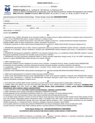 UMOWA AGENCYJNA Nr ............... Zawarta w Katowicach dnia ............................................. pomiędzy: OŚWIATA Spółka z o. o. z siedzibą 40 - 092 Katowice, ul. Mickiewicza 28/7 wpisaną do Rejestru Przedsiębiorców prowadzonego przez Sąd Rejonowy Katowice, Wydział VIII Gospodarczy pod numerem KRS 0000349017, REGON 241504952, NIP 6342738597, tel. 32 258 71 72 wew. 27 i 28 fax. 32 258 71 72 wew. 29 reprezentowaną przez Stanisława Pawłowskiego - Prezesa Zarządu zwaną dalej ORGANIZATOREM a ............................................................................................................................................................................................... z siedzibą ..........................................................................., ul. ............................................................................................... reprezentowanym przez ............................................................................................................................................................ NIP..............................................; REGON .............................................; tel. ........................................................................., fax ....................................................... adres e - mail ............................................................................................................, nazwa banku i nr rachunku ....................................................................................................................................................... zwanym dalej AGENTEM. §1 1. Organizator zleca, a AGENT zobowiązuje się na warunkach określonych niniejszą umową do stałego pośredniczenia w sprzedaży imprez turystycznych w imieniu i na rzecz ORGANIZATORA zgodnie z zasadami ustalonymi w niniejszej umowie. 2. Organizator oświadcza, że spełnia wymogi Ustawy z dnia 29.08.1997 o usługach turystycznych i posiada Zaświadczenie Marszałka Województwa Śląskiego nr 875 o wpisie do rejestru Organizatorów Turystyki i pośredników Turystycznych. 3. Organizator zaświadcza, że zawarł Umowę Gwarancji Ubezpieczeniowej Turystycznej w SIGNAL IDUNA POLSKA Towarzystwo Ubezpieczeń S.A. §2 1. ORGANIZATOR odpowiedzialny jest za solidne i fachowe przygotowanie imprez oraz przekazanie AGENTOWI wszelkich informacji i materiałów, formularzy niezbędnych do ich sprzedaży. „Warunki uczestnictwa”’ określone przez ORGANIZATORA stanowią integralna część umowy i są załącznikiem do niniejszej umowy. 2. ORGANIZATOR zobowiązuje się współdziałać z AGENTEM w celu wykonania niniejszej umowy, a w szczególności udzielać AGENTOWI wyjaśnień i instrukcji dotyczących prawidłowego zawierania umów sprzedaży imprez turystycznych z Klientami. 3. ORGANIZATOR ma prawo kontrolowania działalności AGENTA w zakresie sprzedaży regulowanej niniejszą umową. W tym celu AGENT zobowiązuje się okazywać na żądanie ORGANIZATORA wszelkie dokumenty oraz udzielać wyjaśnień. §3 1. AGENT zobowiązany jest do: a) dokonywania wszelkich czynności niezbędnych do zawarcia umowy z Klientami - prowadzenia akwizycji, reklamy i sprzedaży imprez ORGANIZATORA b) zapoznania się przed sprzedażą z imprezami, programami jak również instrukcjami sprzedaży, warunkami uczestnictwa oraz płatności. c) szczegółowego i rzetelnego informowania każdego Klienta o warunkach umowy, rodzaju imprezy, aktualnego programu i jej standardu oraz warunkach uczestnictwa w imprezie d) sprzedaży imprez ORGANIZATORA według aktualnie obowiązujących cen i warunków sprzedaży BEZ PRAWA DOLICZANIA PROWIZJI (marży). §4 1. AGENT ponosi odpowiedzialność za nienależyte i błędne informacje udzielane Klientowi. 2. AGENT ponosi odpowiedzialność finansową wobec ORGANIZATORA za skutki umów zawartych niezgodnie z ustalonymi przez ORGANIZATORA zasadami zawierania umów, zamówieniami, z uzyskanymi od ORGANIZATORA informacjami dotyczącymi danych imprez turystycznych, jak również za nienależyte wykonanie obowiązków wynikających z niniejszej umowy. §5 1. Przed dokonaniem sprzedaży AGENT powinien sprawdzić czy są wolne miejsca na dana imprezę (jeśli nie posiada miejsc w allotmencie). 2. Sprzedaż miejsc przez AGENTA musi mieć formę pisemnego zgłoszenia na druku „UMOWA UDZIAŁU W IMPREZIE” zawierającym kompletne dane dotyczące imprezy, którą klient wybrał oraz imię i nazwisko klienta, adres zamieszkania z kodem, numer telefonu kontaktowego (komórkowy), datę urodzenia, miejsce wsiadania Klienta. 3. Każdy niepełnoletni uczestnik musi oddać wypełnioną kartę kolonijno - obozową z numerem PESEL 4. AGENT zobowiązany jest do ścisłego przestrzegania następujących WARUNKÓW PŁATNOŚCI: a) każde zgłoszenie musi być potwierdzone przekazaniem zaliczki (min. 30%) w przeciągu 3 dni od daty zgłoszenia klienta. b) najpóźniej na 30 dni przed rozpoczęciem imprezy należy wpłacić pozostałą kwotę stanowiącą pełną jej wartość c) o ile sprzedaży imprezy dokonano w terminie na 30 dni lub krótszym od jej rozpoczęcia, kwotę stanowiącą 100% wartości imprezy należy przesłać na konto biura oraz przekazać faxem/mailem bankowe potwierdzenie wpłaty. W przypadku braku 100% wpłaty wartości imprezy na konto ORGANIZATORA przed rozpoczęciem imprezy, ORGANIZATOR zastrzega sobie prawo nieprzyjęcia klientów (skreślenia z listy) i niezrealizowania zamówionych dla nich świadczeń. Wszelkie konsekwencje, a w szczególności prawne i finansowe, wynikające z tego tytułu obciążają w całości AGENTA. d) W przypadku opóźnienia w przekazywaniu należności ORGANIZATOR może naliczyć obowiązujące odsetki umowne za każdy dzień zwłoki. e) Kwoty uzyskane ze sprzedaży miejsc AGENT przekazuje zgodnie z warunkami płatności na rachunek bankowy ORGANIZATORA: Fortis Bank Polska S.A. 69160010550002321768340001 na przelewach należy z