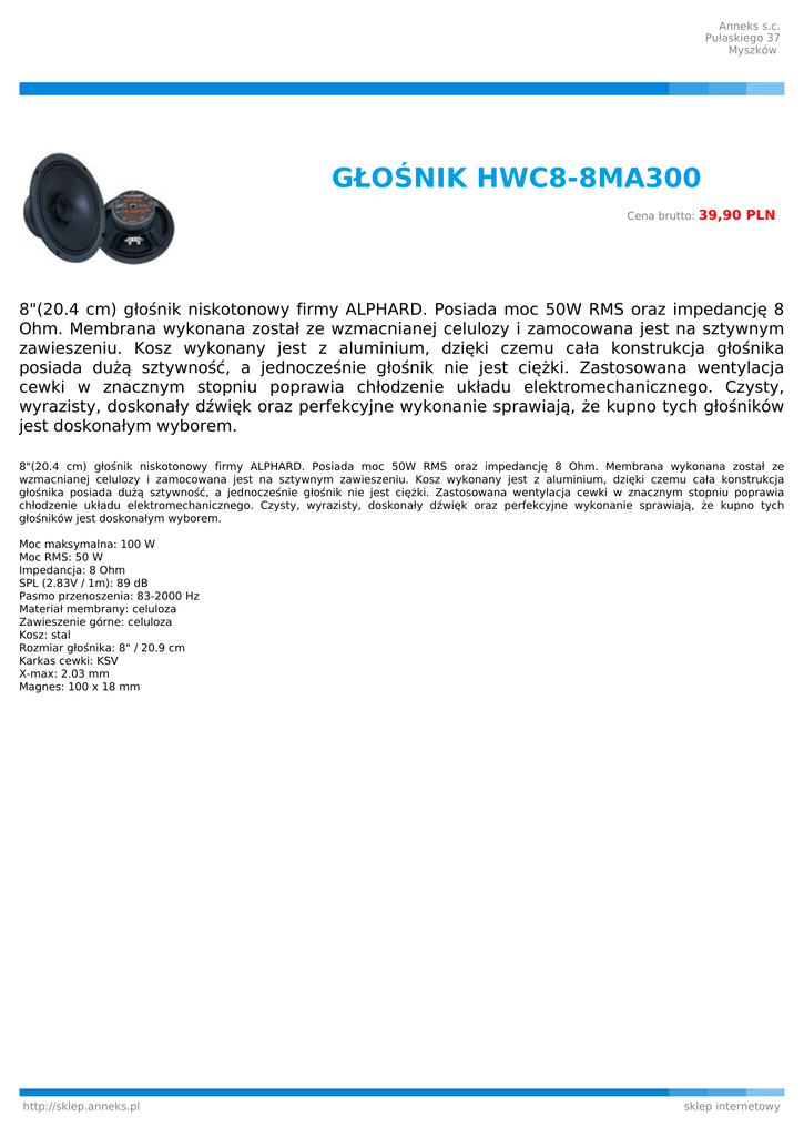 Anneks s.c. Pułaskiego 37 Myszków GŁOŚNIK HWC8-8MA300 Cena brutto: 39,90 PLN 8"(20.4 cm) głośnik niskotonowy firmy ALPHARD. Posiada moc 50W RMS oraz impedancję 8 Ohm. Membrana wykonana został ze wzmacnianej celulozy i zamocowana jest na sztywnym zawieszeniu. Kosz wykonany jest z aluminium, dzięki czemu cała konstrukcja głośnika posiada dużą sztywność, a jednocześnie głośnik nie jest ciężki. Zastosowana wentylacja cewki w znacznym stopniu poprawia chłodzenie układu elektromechanicznego. Czysty, wyrazisty, doskonały dźwięk oraz perfekcyjne wykonanie sprawiają, że kupno tych głośników jest doskonałym wyborem. 8"(20.4 cm) głośnik niskotonowy firmy ALPHARD. Posiada moc 50W RMS oraz impedancję 8 Ohm. Membrana wykonana został ze wzmacnianej celulozy i zamocowana jest na sztywnym zawieszeniu. Kosz wykonany jest z aluminium, dzięki czemu cała konstrukcja głośnika posiada dużą sztywność, a jednocześnie głośnik nie jest ciężki. Zastosowana wentylacja cewki w znacznym stopniu poprawia chłodzenie układu elektromechanicznego. Czysty, wyrazisty, doskonały dźwięk oraz perfekcyjne wykonanie sprawiają, że kupno tych głośników jest doskonałym wyborem. Moc maksymalna: 100 W Moc RMS: 50 W Impedancja: 8 Ohm SPL (2.83V / 1m): 89 dB Pasmo przenoszenia: 83-2000 Hz Materiał membrany: celuloza Zawieszenie górne: celuloza Kosz: stal Rozmiar głośnika: 8" / 20.9 cm Karkas cewki: KSV X-max: 2.03 mm Magnes: 100 x 18 mm http://sklep.anneks.pl sklep internetowy