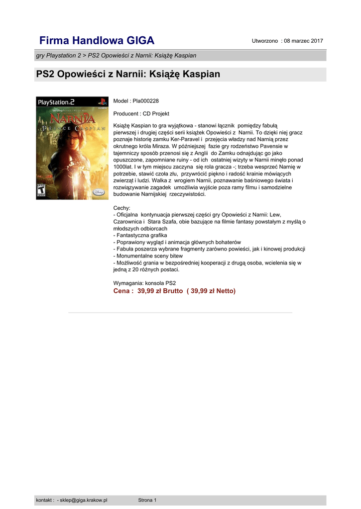 Firma Handlowa GIGA Utworzono : 08 marzec 2017 gry Playstation 2 > PS2 Opowieści z Narnii: Książę Kaspian PS2 Opowieści z Narnii: Książę Kaspian Model : Pla000228 Producent : CD Projekt Książę Kaspian to gra wyjątkowa - stanowi łącznik pomiędzy fabułą pierwszej i drugiej części serii książek Opowieści z Narnii. To dzięki niej gracz poznaje historię zamku Ker-Paravel i przejęcia władzy nad Narnią przez okrutnego króla Miraza. W późniejszej fazie gry rodzeństwo Pavensie w tajemniczy sposób przenosi się z Anglii do Zamku odnajdując go jako opuszczone, zapomniane ruiny - od ich ostatniej wizyty w Narnii minęło ponad 1000lat. I w tym miejscu zaczyna się rola gracza -; trzeba wesprzeć Narnię w potrzebie, stawić czoła złu, przywrócić piękno i radość krainie mówiących zwierząt i ludzi. Walka z wrogiem Narnii, poznawanie baśniowego świata i rozwiązywanie zagadek umożliwia wyjście poza ramy filmu i samodzielne budowanie Narnijskiej rzeczywistości. Cechy: - Oficjalna kontynuacja pierwszej części gry Opowieści z Narnii: Lew, Czarownica i Stara Szafa, obie bazujące na filmie fantasy powstałym z myślą o młodszych odbiorcach - Fantastyczna grafika - Poprawiony wygląd i animacja głównych bohaterów - Fabuła poszerza wybrane fragmenty zarówno powieści, jak i kinowej produkcji - Monumentalne sceny bitew - Możliwość grania w bezpośredniej kooperacji z drugą osoba, wcielenia się w jedną z 20 różnych postaci. Wymagania: konsola PS2 Cena : 39,99 zł Brutto ( 39,99 zł Netto) kontakt : - [email protected] Strona 1