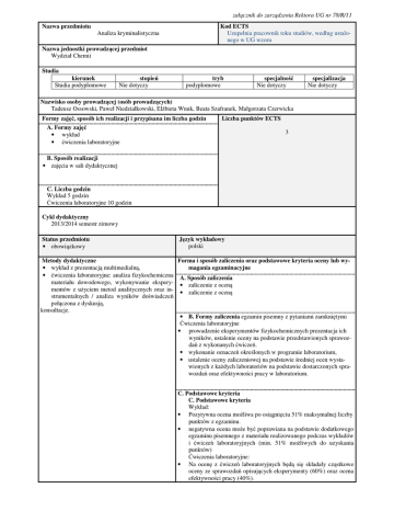 załącznik do zarządzenia Rektora UG nr 78/R/11 Nazwa przedmiotu Kod ECTS Uzupełnia pracownik toku studiów, według ustalonego w UG wzoru Analiza kryminalistyczna Nazwa jednostki prowadzącej przedmiot Wydział Chemii Studia kierunek Studia podyplomowe stopień Nie dotyczy tryb podyplomowe specjalność Nie dotyczy specjalizacja Nie dotyczy Nazwisko osoby prowadzącej (osób prowadzących) Tadeusz Ossowski, Paweł Niedziałkowski, Elżbieta Wnuk, Beata Szafranek, Małgorzata Czerwicka Formy zajęć, sposób ich realizacji i przypisana im liczba godzin Liczba punktów ECTS A. Formy zajęć • wykład • ćwiczenia laboratoryjne 3 B. Sposób realizacji • zajęcia w sali dydaktycznej C. Liczba godzin Wykład 5 godzin Ćwiczenia laboratoryjne 10 godzin Cykl dydaktyczny 2013/2014 semestr zimowy Status przedmiotu • obowiązkowy Język wykładowy polski Metody dydaktyczne Forma i sposób zaliczenia oraz podstawowe kryteria oceny lub wymagania egzaminacyjne • wykład z prezentacją multimedialną, • ćwiczenia laboratoryjne: analiza fizykochemiczna A. Sposób zaliczenia materiału dowodowego, wykonywanie ekspery- • zaliczenie z oceną mentów z użyciem metod analitycznych oraz in• zaliczenie z oceną strumentalnych / analiza wyników doświadczeń połączona z dyskusją, konsultacje. • B. Formy zaliczenia egzamin pisemny z pytaniami zamkniętymi Ćwiczenia laboratoryjne • prowadzenie eksperymentów fizykochemicznych prezentacja ich wyników, ustalenie oceny na podstawie przedstawionych sprawozdań z wykonanych ćwiczeń. • wykonanie oznaczeń określonych w programie laboratorium, • ustalenie oceny zaliczeniowej na podstawie średniej ocen wystawionych z każdych laboratoriów na podstawie dostarczonych sprawozdań oraz efektywności pracy w laboratorium. C. Podstawowe kryteria C. Podstawowe kryteria Wykład: • Pozytywna ocena możliwa po osiągnięciu 51% maksymalnej liczby punktów z egzaminu. • negatywna ocena może być poprawiana na podstawie dodatkowego egzaminu pisemnego z materiału realizowanego podczas wykładów i ćwiczeń laboratoryjnych (min. 51% możliwych do uzyskania punktów) Ćwiczenia laboratoryjne: • Na ocenę z ćwiczeń laboratoryjnych będą się składały cząstkowe oceny ze sprawozdań opisujących eksperymenty (60%) oraz ocena efektywności pracy (40%). negatywna ocena może być poprawiona na podstawie dodatkowego kolokwium z materiału obejmującego cały zakres ćwiczeń (min. 51% możliwych do uzyskania punktów). Określenie przedmiotów wprowadzających wraz z wymogami wstępnymi A. Wymagania formalne: brak B. Wymagania wstępne: stosowanie zasad bezpieczeństwa pracy w laboratorium chemicznym, posługiwanie się szkłem laboratoryjnym, znajomość reakcji chemicznych z uwzględnieniem ich efektów, posiadanie podstawowych wiadomości z zakresu technik chromatograficznych, spektroskopowych oraz podstawowych właściwości fizykochemicznych substancji organicznych Cele przedmiotu • zapoznanie z podstawowymi terminami prawnymi oraz definicjami występującymi w kryminalistyce • zaznajomienie z podstawowymi badaniami fizykochemicznymi wykorzystywanymi w kryminalistyce • zaznajomienie z podstawowymi metodami chemicznymi wykorzystywanymi w kryminalistyce • zaznajomienie z podstawowymi analizami i metodami ujawniania śladów kryminalistycznych • wyrobienie umiejętności samodzielnego przeprowadzania podstawowych czynności związanych z ujawnianiem i zabezpieczaniem śladów kryminalistycznych Treści programowe A. Problematyka wykładu: Kryminalistyka pojęcia podstawowe, zakres badań. Oględziny. Fizykochemia kryminalistyczna – pojęcia ogólne. Metodyka badań wykorzystywana w kryminalistyce: klasyczna analiza jakościowa, metody chromatograficzne (TLC, GC, HPLC), spektrofotometria (IR, UV VIS, MAS, NMR, INR), elektrochemia (CV, elektrografia itd), badania mikroskopowe. Zakres badań chemicznych w kryminalistyce: badania paliw, badania alkoholi, badania środków psychoaktywnych, badania leków, ustalanie przyczyn powstawania pożarów, wybuchy, badania powłok malarskich, badania mikrośladów, badania pozostałości po wystrzale z broni palnej, badania metali i ich stopów, badania środków kosmetycznych, badania środków chemicznych używanych w gospodarstwie domowym. Ślady daktyloskopowe i dermatoskopowe. Osmologia - pojęcia podstawowe, sposoby zabezpieczania śladów. B. Problematyka laboratorium Praktyczne wykorzystanie metod chromatograficznych (chromatografia gazowa lub chromatografia cieczowa – HPLC i TLC) w kryminalistyce polegające na oznaczaniu wybranych substancji chemicznych. Praktyczna nauka ujawniania śladów linii papilarnych metodami mechanicznymi i fizykochemicznymi oraz podstawy nauki identyfikowania człowieka na podstawie linii papilarnych złożonych na kartach daktyloskopijnych oraz ćwiczenia z zakresu traseologii. Wykaz literatury A. Literatura wymagana do ostatecznego zaliczenia zajęć: A.1. wykorzystywana podczas zajęć 1. Z. Ruszkowski, Fizykochemia kryminalistyczna, CLK KGP, Warszawa 1992 2. J. Moszczyński, Ślady w kryminalistyce, Difin, Warszawa 2007. 3. J. Mazepa, Vademecum techniki kryminalistyki, Oficyna, Warszawa 2009. 4. B. Hołdys, Kryminalistyka, Lexis Nexis, Warszawa 2006. 5. M. Małkiewicz, Kryminalistyczne badanie patologii pisma ręcznego, Wydawnictwo Akademickie i Profesjonalne, Warszawa 2009 6. J. Moszczyński, Daktyloskopia, CLK KGP, Warszawa 1997 7. Stepnowski P., Synak E., Szafranek B., Kaczyński Z. Techniki separacyjne. Wydawnictwo UG 2010 A.2. studiowana samodzielnie przez studenta 1. A. Mazurek, Badania mineralogiczne śladów kryminalistycznych, CLK KGP, Zeszyty Metodyczne nr 6, Warszawa 2000 2. Stepnowski P., Synak E., Szafranek B., Kaczyński Z. Techniki separacyjne. Wydawnictwo UG 2010 B. Literatura uzupełniająca 1. R. Zieliński, Badania instalacji elektrycznej na miejscu pożaru, CLK KGP, Warszawa 1992 2. L. Rodowicz, Kryminalistyczne badanie śla