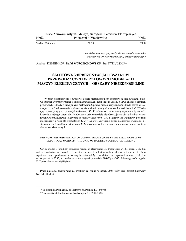 Nr 62 Prace Naukowe Instytutu Maszyn, Napędów i Pomiarów Elektrycznych Politechniki Wrocławskiej Nr 62 Studia i Materiały Nr 28 2008 pole elektromagnetyczne, prądy wirowe, metoda elementów skończonych, obwody magnetyczne, maszyny elektryczne Andrzej DEMENKO*, Rafał WOJCIECHOWSKI*, Jan SYKULSKI** SIATKOWA REPREZENTACJA OBSZARÓW PRZEWODZĄCYCH W POLOWYCH MODELACH MASZYN ELEKTRYCZNYCH – OBSZARY NIEJEDNOSPÓJNE W pracy przedstawiono obwodowe modele niejednospójnych obszarów ze środowiskami przewodzącymi w przetwornikach elektromagnetycznych. Rozpatrzono układy z uzwojeniami o cienkich przewodach i układy z uzwojeniami prętowymi. Opisano modele rezystancyjne układu cewek wielozwojnych, których równania oczkowe są równaniami metody elementów krawędziowych (MEK) dla ujęć wykorzystujących potencjał wektorowy T0. Przedstawiono obwodową reprezentację wartości krawędziowej tego potencjału. Omówiono siatkowe modele niejednospójnych obszarów dla sformułowań wykorzystujących elektryczne potencjały wektorowe T, T0, i skalarny lub wektorowy potencjał magnetyczny, a wiec dla sformułowań Ω-T-T0, A-T-T0. Zwrócono uwagę na korzyści wynikające ze stosowania potencjałów wektorowych T, T0 w obliczeniach rozpływu prądów indukowanych metodą elementów skończonych. NETWORK REPRESENTATION OF CONDUCTING REGIONS IN THE FIELD MODELS OF ELECTRICAL MCHINES – THE CASE OF MULTIPLY CONNECTED REGIONS Circuit models of multiply connected regions in electromagnetic transducers are discussed. Both thin and rod conductors are considered. Resistive models of multi-turn coils are described for which the loop equations form edge elements involving the potential T0. Formulations are expressed in terms of electric vector potentials T, T0, and scalar or vector magnetic potentials, Ω-T-T0, A-T-T0. Advantages of using the T, T0 formulation are highlighted. Praca naukowa finansowana ze środków na naukę w latach 2008–2010 jako projekt badawczy Nr N519 406134 __________ * Politechnika Poznańska, ul. Piotrowo 3a, Poznań, PL - 60 965 ** University of Southampton, Southampton SO17 1BJ, UK