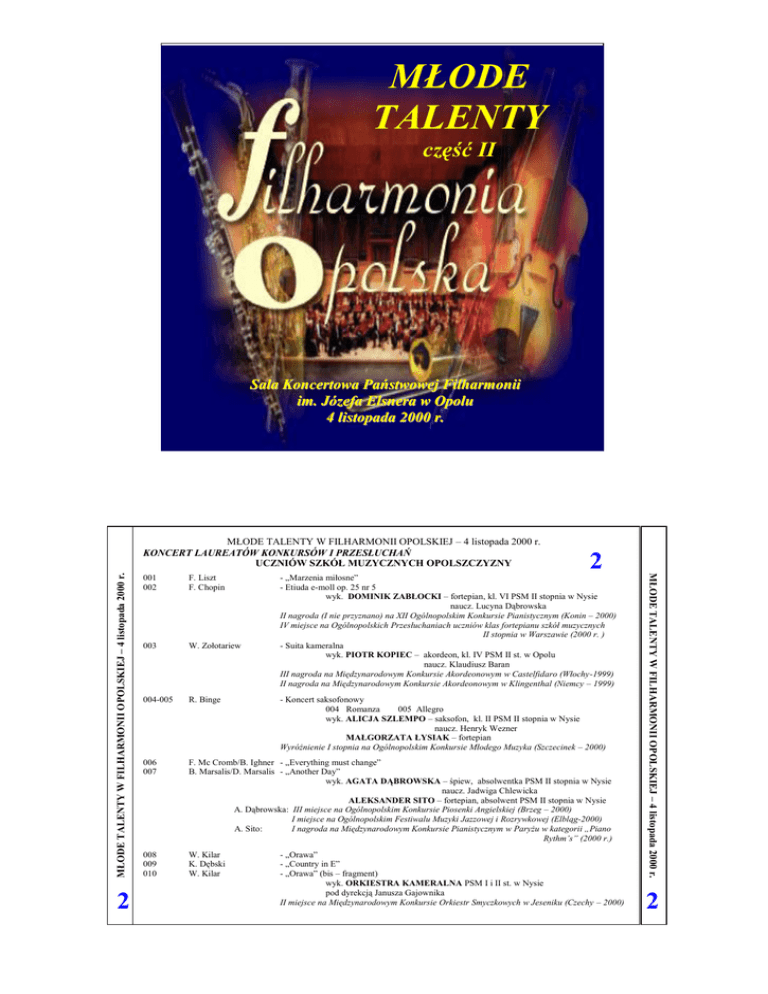 MŁODE TALENTY część II Sala Koncertowa Państwowej Filharmonii im. Józefa Elsnera w Opolu 4 listopada 2000 r. 2 2 - „Marzenia miłosne” - Etiuda e-moll op. 25 nr 5 wyk. DOMINIK ZABŁOCKI – fortepian, kl. VI PSM II stopnia w Nysie naucz. Lucyna Dąbrowska II nagroda (I nie przyznano) na XII Ogólnopolskim Konkursie Pianistycznym (Konin – 2000) IV miejsce na Ogólnopolskich Przesłuchaniach uczniów klas fortepianu szkół muzycznych II stopnia w Warszawie (2000 r. ) - Suita kameralna wyk. PIOTR KOPIEC – akordeon, kl. IV PSM II st. w Opolu naucz. Klaudiusz Baran III nagroda na Międzynarodowym Konkursie Akordeonowym w Castelfidaro (Włochy-1999) II nagroda na Międzynarodowym Konkursie Akordeonowym w Klingenthal (Niemcy – 1999) 001 002 F. Liszt F. Chopin 003 W. Zołotariew 004-005 R. Binge 006 007 F. Mc Cromb/B. Ighner - „Everything must change” B. Marsalis/D. Marsalis - „Another Day” wyk. AGATA DĄBROWSKA – śpiew, absolwentka PSM II stopnia w Nysie naucz. Jadwiga Chlewicka ALEKSANDER SITO – fortepian, absolwent PSM II stopnia w Nysie A. Dąbrowska: III miejsce na Ogólnopolskim Konkursie Piosenki Angielskiej (Brzeg – 2000) I miejsce na Ogólnopolskim Festiwalu Muzyki Jazzowej i Rozrywkowej (Elbląg-2000) A. Sito: I nagroda na Międzynarodowym Konkursie Pianistycznym w Paryżu w kategorii „Piano Rythm’s” (2000 r.) 008 009 010 W. Kilar K. Dębski W. Kilar - Koncert saksofonowy 004 Romanza 005 Allegro wyk. ALICJA SZLEMPO – saksofon, kl. II PSM II stopnia w Nysie naucz. Henryk Wezner MAŁGORZATA ŁYSIAK – fortepian Wyróżnienie I stopnia na Ogólnopolskim Konkursie Młodego Muzyka (Szczecinek – 2000) - „Orawa” - „Country in E” - „Orawa” (bis – fragment) wyk. ORKIESTRA KAMERALNA PSM I i II st. w Nysie pod dyrekcją Janusza Gajownika II miejsce na Międzynarodowym Konkursie Orkiestr Smyczkowych w Jeseniku (Czechy – 2000) MŁODE TALENTY W FILHARMONII OPOLSKIEJ – 4 listopada 2000 r. MŁODE TALENTY W FILHARMONII OPOLSKIEJ – 4 listopada 2000 r. MŁODE TALENTY W FILHARMONII OPOLSKIEJ – 4 listopada 2000 r. KONCERT LAUREATÓW KONKURSÓW I PRZESŁUCHAŃ UCZNIÓW SZKÓŁ MUZYCZNYCH OPOLSZCZYZNY 2