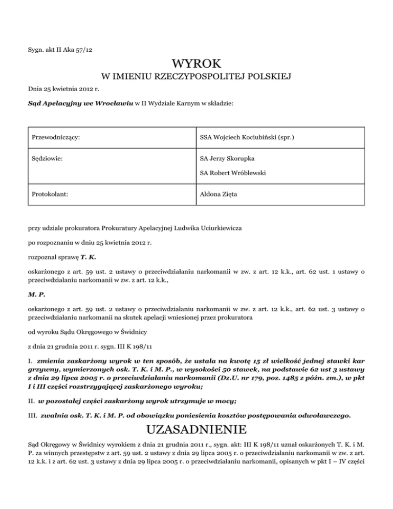 Sygn. akt II Aka 57/12 WYROK W IMIENIU RZECZYPOSPOLITEJ POLSKIEJ Dnia 25 kwietnia 2012 r. Sąd Apelacyjny we Wrocławiu w II Wydziale Karnym w składzie: Przewodniczący: SSA Wojciech Kociubiński (spr.) Sędziowie: SA Jerzy Skorupka SA Robert Wróblewski Protokolant: Aldona Zięta przy udziale prokuratora Prokuratury Apelacyjnej Ludwika Uciurkiewicza po rozpoznaniu w dniu 25 kwietnia 2012 r. rozpoznał sprawę T. K. oskarżonego z art. 59 ust. 2 ustawy o przeciwdziałaniu narkomanii w zw. z art. 12 k.k., art. 62 ust. 1 ustawy o przeciwdziałaniu narkomanii w zw. z art. 12 k.k., M. P. oskarżonego z art. 59 ust. 2 ustawy o przeciwdziałaniu narkomanii w zw. z art. 12 k.k., art. 62 ust. 3 ustawy o przeciwdziałaniu narkomanii na skutek apelacji wniesionej przez prokuratora od wyroku Sądu Okręgowego w Świdnicy z dnia 21 grudnia 2011 r. sygn. III K 198/11 I. zmienia zaskarżony wyrok w ten sposób, że ustala na kwotę 15 zł wielkość jednej stawki kar grzywny, wymierzonych osk. T. K. i M. P., w wysokości 50 stawek, na podstawie 62 ust 3 ustawy z dnia 29 lipca 2005 r. o przeciwdziałaniu narkomanii (Dz.U. nr 179, poz. 1485 z późn. zm.), w pkt I i III części rozstrzygającej zaskarżonego wyroku; II. w pozostałej części zaskarżony wyrok utrzymuje w mocy; III. zwalnia osk. T. K. i M. P. od obowiązku poniesienia kosztów postępowania odwoławczego. UZASADNIENIE Sąd Okręgowy w Świdnicy wyrokiem z dnia 21 grudnia 2011 r., sygn. akt: III K 198/11 uznał oskarżonych T. K. i M. P. za winnych przestępstw z art. 59 ust. 2 ustawy z dnia 29 lipca 2005 r. o przeciwdziałaniu narkomanii w zw. z art. 12 k.k. i z art. 62 ust. 3 ustawy z dnia 29 lipca 2005 r. o przeciwdziałaniu narkomanii, opisanych w pkt I – IV części wstępnej, i za każdy z tych czynów wymierzył im obok kar pozbawienia wolności także kary po 50 stawek dziennych grzywny, przy czym wysokość jednej stawki grzywny wymierzonej za czyny z art. 59 ust. 2 ustawy o przeciwdziałaniu narkomanii ustalił na 15 zł, a grzywny wymierzonej za czyny z art. 62 ust 3 ustawy o przeciwdziałaniu narkomani na 10 zł. Łącząc powyższe kary, Sąd Okręgowy ustalił wysokość jednej stawki na 15 zł. Apelację od tego wyroku, w stosunku do obu oskarżonych, w części dotyczącej wysokości stawek dziennych grzywny, wniósł prokurator, zarzucając: obrazę przepisów prawa karnego materialnego, a mianowicie art. 33 § 3 k.k. polegającą na zastosowaniu przez sąd różnych wysokości stawek dziennych grzywien orzeczonych wobec T. K. i M. P. za czyny opisane w pkt I, II, III i IV części wstępnej wyroku (pkt I i III części dyspozytywnej wyroku), podczas gdy orzekając w jednym postępowaniu, przy ściśle ustalonej, niezmienionej sytuacji majątkowej sprawców, sąd winien stosować jednolitą wysokość stawki dziennej grzywny i to zarówno w zakresie kar grzywny za czyny jednostkowe, jak i w zakresie kary łącznej, co warunkują okoliczności wymienione w tym przepisie. Podnosząc powyższy zarzut apelujący wniósł o zmianę zaskarżonego wyroku, przez ustalenie na poziomie 15 zł wysokości jednej stawki dziennej grzywny, w stosunku do każdej z kar grzywny wymierzonych oskarżonym T. K. i M. P. i utrzymanie w mocy wyroku w pozostałej części. Sąd Apelacyjny zważył, co następuje. Apelacja jest zasadna. Istota kary grzywny orzekanej w systemie stawkowym polega na tym, że kierując się dyrektywami zawartymi w art. 53 § 1 i 2 k.k. sąd wymierza karę grzywny (jej wysokość) przez określenie liczby stawek, a następnie, kierując się wskazaniami z art. 33 § 3 k.k., ustala wysokość jednej stawki dziennej. Biorąc pod uwagę, że miarodajna jest sytuacja oskarżonego w chwili wyrokowania, oczywistym staje się, że dla każdej z wymierzonych kar grzywny, ustalona przez sąd, jako właściwa, stawka dzienna grzywny musi być taka sama. Wielkością stawki dziennej nie można określać surowości kary grzywny, bo na tym etapie nie dokonuje się już „wymiaru kary”. Takie też stanowisko w tej kwestii zajmował Sąd Najwyższy (zobacz: wyrok Sądu Najwyższego z 3.02.2006 r., III KK 346/05, OSNKW 2006/3/30). Mając powyższe na uwadze, uwzględniając, że Sąd Okręgowy w części grzywien jednostkowych oraz w stosunku do wymierzonych obu oskarżonym kar łącznych grzywny ustalał wysokość jednej stawki na 15 zł, w takiej wysokości należało też ustalić wysokość jednej stawki grzywny, wymierzonej oskarżonym na podstawie art. 62 ust. 3 ustawy z dnia 29 lipca 2005 r. o przeciwdziałaniu narkomanii. Orzekając zgodnie w tej części z wnioskiem apelacji prokuratora, Sąd Apelacyjny nie znalazł wystarczających podstaw do uwzględnienia wniosku osk. M. P., zawartego w jego wystąpieniu na rozprawie odwoławczej, o zmianę zaskarżonego wyroku przez uniewinnienie go od przypisanych czynów. Sąd Okręgowy prawidłowo przeprowadził rozprawę główną, a dokonana przez ten Sąd ocena dowodów jest wszechstronna i nie można zarzucić jej dowolności. Z tych wszystkich powodów wyrokowano jak w wyroku. Oskarżonych zwolniono od obowiązku poniesienia kosztów za postępowanie odwoławcze, albowiem przemawiają za tym względy słuszności (art. 624 § 1 k.p.k.).