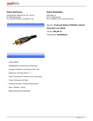 Salon Bemowo Salon Białołęka Powstańców Śląskich 87 lok. U10 B 01-466 Warszawa Tel. (22)427-89-95, (22)398-73-32 Kabrioletu 4 03-117 Warszawa Tel. (22)490-31-43, (22)243-36-05 Nazwa: Przewod Kabel COAXIAL Chinch RCA-RCA 5m GOLD Cena: 109,00 zł Producent: KraftMann - 100% NOWY - GWARANCJA Producenta 24 Miesiące - Paragon Fiskalny Lub Faktura VAT 23% - Najniższa Cena Na Rynku ! ! ! - Salon Firmowy Na Terenie M.St. Warszawy - Towar Dostępny Od Ręki - Fachowe Porady I Szeroki Asortyment - Kolor Modelu: Czarny - Najwyższej Klasy Podzepoły strona 1 / 2 O PRODUKCIE: . : W Naszej Ofercie Znajdziesz Także : . ekrany projekcyjne / projektory / mocowania AV Najtaniej W PL strona 2 / 2 Powered by TCPDF (www.tcpdf.org)
