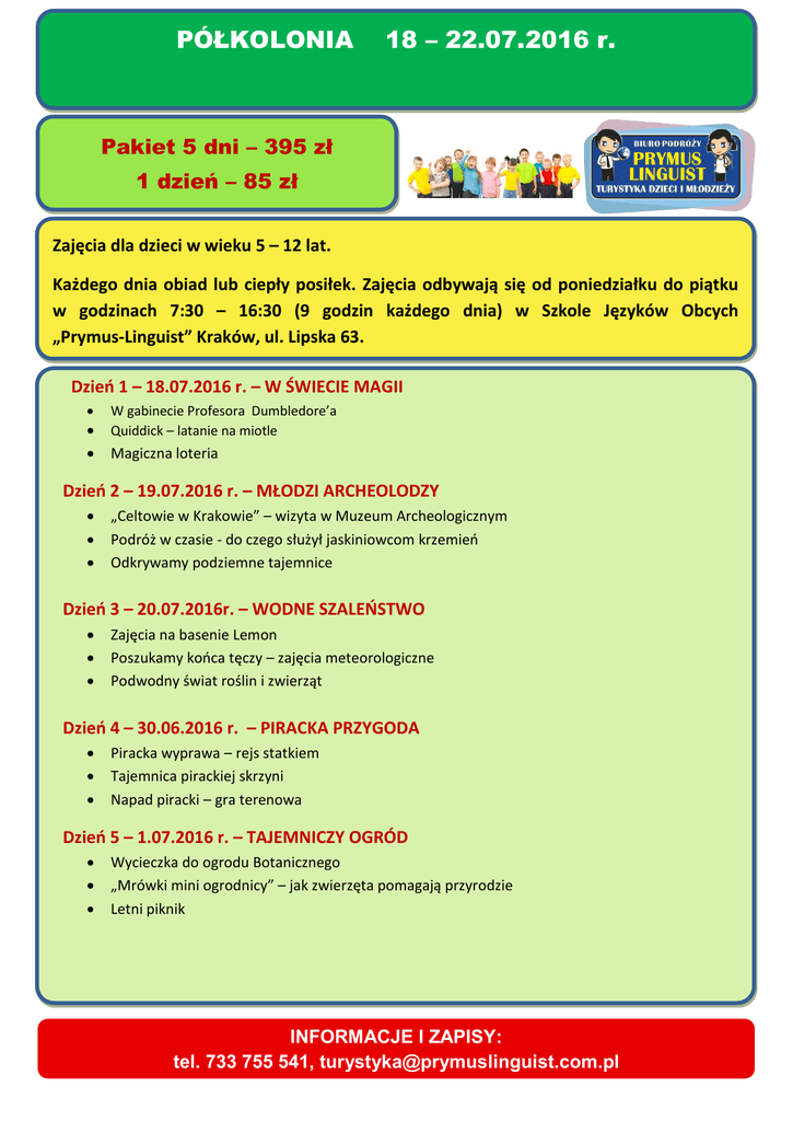 PÓŁKOLONIA 18 – 22.07.2016 r. Pakiet 5 dni – 395 zł 1 dzień – 85 zł Zajęcia dla dzieci w wieku 5 – 12 lat. Każdego dnia obiad lub ciepły posiłek. Zajęcia odbywają się od poniedziałku do piątku w godzinach 7:30 – 16:30 (9 godzin każdego dnia) w Szkole Języków Obcych „Prymus-Linguist” Kraków, ul. Lipska 63. Dzień 1 – 18.07.2016 r. – W ŚWIECIE MAGII W gabinecie Profesora Dumbledore’a Quiddick – latanie na miotle Magiczna loteria Dzień 2 – 19.07.2016 r. – MŁODZI ARCHEOLODZY „Celtowie w Krakowie” – wizyta w Muzeum Archeologicznym Podróż w czasie - do czego służył jaskiniowcom krzemień Odkrywamy podziemne tajemnice Dzień 3 – 20.07.2016r. – WODNE SZALEŃSTWO Zajęcia na basenie Lemon Poszukamy końca tęczy – zajęcia meteorologiczne Podwodny świat roślin i zwierząt Dzień 4 – 30.06.2016 r. – PIRACKA PRZYGODA Piracka wyprawa – rejs statkiem Tajemnica pirackiej skrzyni Napad piracki – gra terenowa Dzień 5 – 1.07.2016 r. – TAJEMNICZY OGRÓD Wycieczka do ogrodu Botanicznego „Mrówki mini ogrodnicy” – jak zwierzęta pomagają przyrodzie Letni piknik INFORMACJE I ZAPISY: tel. 733 755 541, [email protected] PÓŁKOLONIA 25 – 29.07.2016 r. Zajęcia odbywają się podczas Światowych Dni Młodzieży Pakiet 5 dni – 365 zł 1 dzień – 85 zł Zajęcia dla dzieci w wieku 5 – 12 lat. Każdego dnia obiad lub ciepły posiłek. Zajęcia odbywają się od poniedziałku do piątku w godzinach 7:30 – 16:30 (9 godzin każdego dnia) w Szkole Języków Obcych „Prymus-Linguist” Kraków, ul. Lipska 63. Dzień 1 – 25.07.2016 r. – SZTUKA ORIENTACJI W TERENIE Techniki wyznaczania kierunków świata Zgubiłem się … i co dalej? „Dżunga miejska” – Gra terenowa Dzień 2 – 26.07.2016 r. – LABORATORIUM EKSPERYMENTÓW Tęczowa kapusta, zabawa ze światłem, magiczny palec, atramentowe czary mary i wiele innych eksperymentów Turniej młodych naukowców Dzień 3 – 27.07.2016 r. – SPARTAKIADA Rozgrywki o puchar Mistrza GRA W KRYKIETA, Pe’tangue Mega kółko i krzyżyk Dzień 4 – 25.08.2016 r. – BIURO DETEKTYWISTYCZNE Wcielimy się w młodych detektywów Nauczymy się sztuczek kamuflażu „Detektywi w Akcji” – gra terenowa Dzień 5 – 25.08.2016 r. – BIBLIOTEKA MŁODEGO CZŁOWIEKA Poznamy dawne pismo i książki - spróbujemy sił w pisaniu Gęsim piórem Kto to jest Introligator? Zrobimy samodzielnie książkę INFORMACJE I ZAPISY: tel. 733 755 541, [email protected]