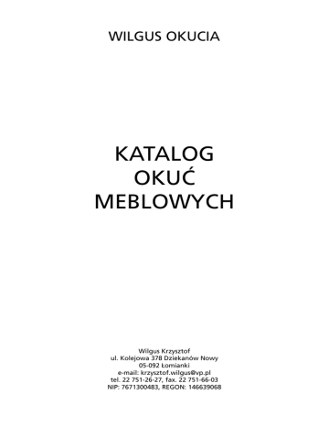 WILGUS OKUCIA KATALOG OKUĆ MEBLOWYCH Wilgus Krzysztof ul. Kolejowa 378 Dziekanów Nowy 05-092 Łomianki e-mail: [email protected] tel. 22 751-26-27, fax. 22 751-66-03 NIP: 7671300483, REGON: 146639068 Spis treści: ● Dział podnośników 1. Podnośnik obrotowy PO-1 2. Podnośnik obrotowy IG-5 3. Podnośnik bez sprężynowy IG-6 4. Podnośnik sprężynowy IG-7 5. Podnośnik bez sprężynowy IG-9 6. Podnośnik IG-11 7. Podnośnik IG-11 (Ital system) 8. Podnośnik IG-12 9. Podnośnik IG-13 10. Podnośnik bez spężynowy IG-14 11. Podnośnik obrotowy IG-16 12. Podnośnik sprężynowy IG-25 13. Podnośnik sprężynowy IG-26 14. Podnośnik bez sprężynowy IG-27 15. Podnośnik bez sprężynowy IG-30 16. Podnośnik sprężynowy IG-28 17. Podnośnik sprężynowy IG-29 18. Podnośnik obrotowy IG-36 z okuciami 19. Podnośnik sprężynowy Z 20. Podnośnik sprężynowy M 21. Podnośnik włazu dachowego 22. Podnośnik włazu dachowego mały ● Dział rolek 23. Rolka w ceowniku Ø 38 24. Rolka prowadząca Ø 43 25. Rolka prowadząca Ø 33 26. Rolka prowadząca Ø 25 27. Rolka prowadząca Ø 16 28. Rolka kątowa Ø 16 29. Rolka prowadząca Ø 28 30. Rolka prowadząca F 31. Rolka pozioma Ø 29 32. Rolka pozioma Ø 29 skrócona 33. Rolka pionowa Ø 43 z 3 otworami 34. Rolka prowadząca Ø 43 z 4 otworami 35. Rolka prowadząca Ø 43 z 5 otworami 36. Rolka pionowa Ø 43 z 3 otworami skrócona ● Dział zaczepów 37. Zaczep rolki Ø 30 38. Zaczep rolki Ø 30 puszta 39. Zaczep rolki długi 40. Zaczep rolki krótki 41. Zaczep rolki mały 42. Zaczep narożnika ● Dział nóg 43. Noga chromowana (trzy rodzaje) 44. Nóżka chromowana z rolką obrotową 45. Noga Naomi (trzy rodzaje) 46. Noga NC 12 47. Noga L 445 48. Noga L 140 49. Noga Amare ● Dział detali różnych 50. Kołek zaczepu 51. Mocowanie materaca z drutu Ø 6 52. Łącznik dwuczęściowy 53. Zawiasy 54. Ramię obrotowe 55. Zawias zagłówka 56. Ceownik z nakrętkami 57. Łącznik narożny Dział podnośników Dział rolek Dział zaczepów Dział nóg Dział detali różnych