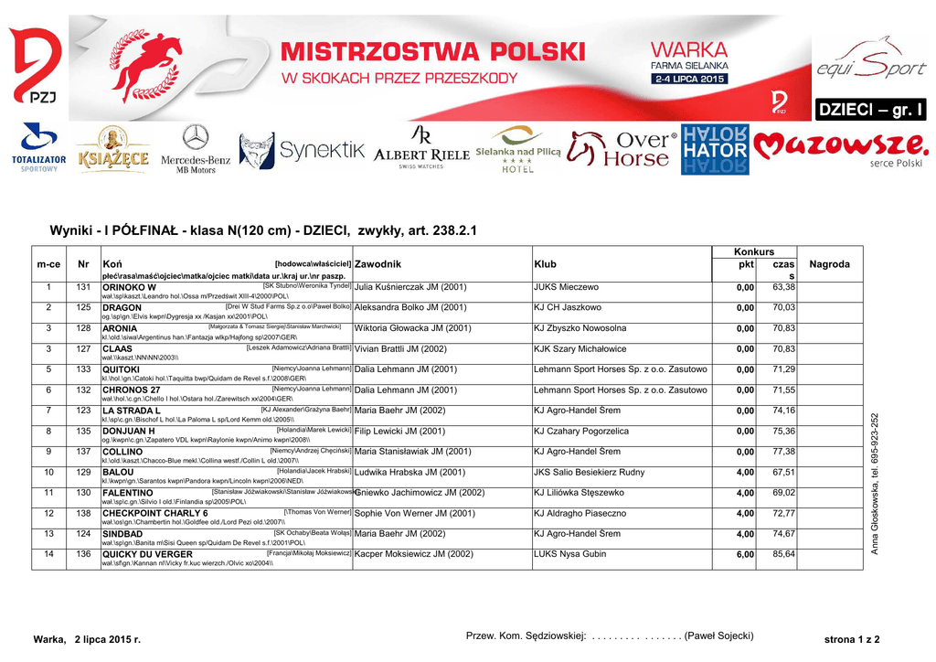 - I PÓŁFINAŁ - klasa N(120 cm) - DZIECI, zwykły, art. 238.2.1 Wyniki m-ce 1 Nr Koń 131 płeć\rasa\maść\ojciec\matka/ojciec matki\data ur.\kraj ur.\nr paszp. [hodowca\właściciel] [SK Stubno\Weronika Tyndel] ORINOKO W Konkurs pkt czas s Zawodnik Klub Julia Kuśnierczak JM (2001) JUKS Mieczewo 0,00 63,38 Aleksandra Bolko JM (2001) KJ CH Jaszkowo 0,00 70,03 Wiktoria Głowacka JM (2001) KJ Zbyszko Nowosolna 0,00 70,83 Vivian Brattli JM (2002) KJK Szary Michałowice 0,00 70,83 Dalia Lehmann JM (2001) Lehmann Sport Horses Sp. z o.o. Zasutowo 0,00 71,29 Dalia Lehmann JM (2001) Lehmann Sport Horses Sp. z o.o. Zasutowo 0,00 71,55 Maria Baehr JM (2002) KJ Agro-Handel Śrem 0,00 74,16 Filip Lewicki JM (2001) KJ Czahary Pogorzelica 0,00 75,36 Maria Stanisławiak JM (2001) KJ Agro-Handel Śrem 0,00 77,38 Ludwika Hrabska JM (2001) JKS Salio Besiekierz Rudny 4,00 67,51 KJ Liliówka Stęszewko 4,00 69,02 Sophie Von Werner JM (2001) KJ Aldragho Piaseczno 4,00 72,77 Maria Baehr JM (2002) KJ Agro-Handel Śrem 4,00 74,67 Kacper Moksiewicz JM (2002) LUKS Nysa Gubin 6,00 85,64 Nagroda wał.\sp\kaszt.\Leandro hol.\Ossa m/Przedświt XIII-4\2000\POL\ 2 3 125 128 DRAGON [Drei W Stud Farms Sp.z o.o\Paweł Bolko] og.\sp\gn.\Elvis kwpn\Dygresja xx /Kasjan xx\2001\POL\ ARONIA [Małgorzata & Tomasz Siergiej\Stanisław Marchwicki] kl.\old.\siwa\Argentinus han.\Fantazja wlkp/Hajfong sp\2007\GER\ 3 127 [Leszek Adamowicz\Adriana Brattli] CLAAS wał.\\kaszt.\NN\NN\2003\\ 5 133 [Niemcy\Joanna Lehmann] QUITOKI kl.\hol.\gn.\Catoki hol.\Taquitta bwp/Quidam de Revel s.f.\2008\GER\ 6 132 [Niemcy\Joanna Lehmann] CHRONOS 27 7 123 [KJ Alexander\Grażyna Baehr] LA STRADA L kl.\sp\c.gn.\Bischof L hol.\La Paloma L sp/Lord Kemm old.\2005\\ 8 135 [Holandia\Marek Lewicki] DONJUAN H og.\kwpn\c.gn.\Zapatero VDL kwpn\Raylonie kwpn/Animo kwpn\2008\\ 9 137 [Niemcy\Andrzej Chęciński] COLLINO kl.\old.\kaszt.\Chacco-Blue mekl.\Collina westf./Collin L old.\2007\\ 10 129 [Holandia\Jacek Hrabski] BALOU kl.\kwpn\gn.\Sarantos kwpn\Pandora kwpn/Lincoln kwpn\2006\NED\ 11 130 FALENTINO [Stanisław Jóźwiakowski\Stanisław Jóźwiakowski] Gniewko Jachimowicz JM (2002) wał.\sp\c.gn.\Silvio I old.\Finlandia sp\2005\POL\ 12 138 [\Thomas Von Werner] CHECKPOINT CHARLY 6 wał.\os\gn.\Chambertin hol.\Goldfee old./Lord Pezi old.\2007\\ 13 124 [SK Ochaby\Beata Wołąs] SINDBAD wał.\sp\gn.\Banita m\Sisi Queen sp/Quidam De Revel s.f.\2001\POL\ 14 136 QUICKY DU VERGER [Francja\Mikołaj Moksiewicz] Anna Głoskowska, tel. 695-923-252 wał.\hol.\c.gn.\Chello I hol.\Ostara hol./Zarewitsch xx\2004\GER\ wał.\sf\gn.\Kannan nl\Vicky fr.kuc wierzch./Olvic xo\2004\\ Warka, 2 lipca 2015 r. Przew. Kom. Sędziowskiej: . . . . . . . . . . . . . . . . (Paweł Sojecki) strona 1 z 2 m-ce Nr Koń [hodowca\właściciel] Zawodnik Klub Konkurs pkt czas s Aleksandra Bolko JM (2001) KJ CH Jaszkowo elim. Filip Lewicki JM (2001) KJ Czahary Pogorzelica płeć\rasa\maść\ojciec\matka/ojciec matki\data ur.\kraj ur.\nr paszp. 126 QUITY [Niemcy\Paweł Bolko] kl.\han.\gn.\Quidam's Rubin hol.\Fergie han./Fashion King han.\2006\GER\ 134 [\Józef Walat] CODETIA VDL wycof. Nagroda Anna Głoskowska, tel. 695-92 Wyniki - I PÓŁFINAŁ - klasa N(120 cm) - DZIECI, zwykły, art. 238.2.1 kl.\kwpn\c.gn.\Hold Up Premier kwpn\Godetia kwpn/ Jasper\2007\\ Warunki konkursu: przeszkód - skoków: dystans [m]: tempo [m/min]: norma czasu [s]: norma czasu [s]: startowało koni: ukończyło koni: 11 - 13 450 350 78 78 16 14 Przewodniczący Komisji Sędziowskiej ............................ Paweł Sojecki Gospodarz Toru: Szymon Tarant Komisja Orzekająca: Ewa Porębska-Gomółka, Jan Limanowski, Bogusława Długosz, Paweł Sojecki Warka, 2 lipca 2015 r. strona 2 z 2