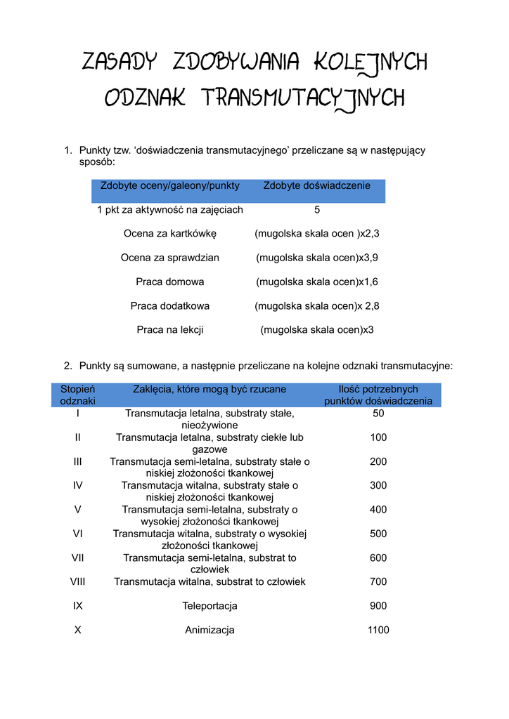 ZASADY ZDOBYWANIA KOLEJNYCH ODZNAK TRANSMUTACYJNYCH 1. Punkty tzw. ‘doświadczenia transmutacyjnego’ przeliczane są w następujący sposób: Zdobyte oceny/galeony/punkty Zdobyte doświadczenie 1 pkt za aktywność na zajęciach 5 Ocena za kartkówkę (mugolska skala ocen )x2,3 Ocena za sprawdzian (mugolska skala ocen)x3,9 Praca domowa (mugolska skala ocen)x1,6 Praca dodatkowa (mugolska skala ocen)x 2,8 Praca na lekcji (mugolska skala ocen)x3 2. Punkty są sumowane, a następnie przeliczane na kolejne odznaki transmutacyjne: Stopień odznaki I Zaklęcia, które mogą być rzucane Ilość potrzebnych punktów doświadczenia 50 VIII Transmutacja letalna, substraty stałe, nieożywione Transmutacja letalna, substraty ciekłe lub gazowe Transmutacja semi-letalna, substraty stałe o niskiej złożoności tkankowej Transmutacja witalna, substraty stałe o niskiej złożoności tkankowej Transmutacja semi-letalna, substraty o wysokiej złożoności tkankowej Transmutacja witalna, substraty o wysokiej złożoności tkankowej Transmutacja semi-letalna, substrat to człowiek Transmutacja witalna, substrat to człowiek IX Teleportacja 900 X Animizacja 1100 II III IV V VI VII 100 200 300 400 500 600 700 3. Uczeń, po zakończeniu nauki w I klasie automatycznie przepisywany ma stopień odznaki na klasę II. Odznaka podczas nauki obowiązuje jedynie w szkole, w której została zdobyta (punkty z dwóch szkół nie sumują się). 4. Uczeń ma prawo do wykonania dodatkowych zadań. Ich ilość oraz temat uzależnione są od brakujących punktów do osiągnięcia następnej odznaki, nie może ich być jednak więcej niż 6. 5. Nauczyciel może przyznać punkty doświadczenia również za inne osiągnięcia ucznia, nieujęte w tabeli. 6. Punkty doświadczenia nie mogą zostać odjęte. 7. Na koniec roku uczniowie z najwyższymi stopniami odznaki zostaną nagrodzeni, a wszyscy zostaną wpisani na tablicę Odznak Transmutacyjnych: http://smithowa.weebly.com/odznaki-transmutacyjne.html 8. Wszystkie nieścisłości, błędy czy problemy proszę kierować na e-mail: [email protected] Powyższy regulamin oraz pomysł są autorstwa Laury Smith oraz Stephana Rodrigueza Sancheza. Wszelkie kopiowanie oraz rozpowszechnianie bez zgody surowo zabronione.