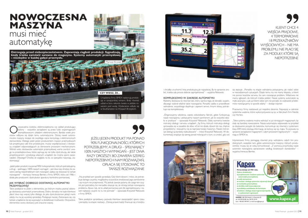 Nowoczesna maszyna musi mieć automatykę Klient chce 4 wejścia prądowe, 4 termoparowe i 8 przekaźników wyjściowych – nie ma problemu. Nie płaci się za moduły, które są niepotrzebne Ostrzegają przed niebezpieczeństwem. Zapewniają ciągłość produkcji. Sygnalizują, kiedy trzeba zamówić surowce do magazynu. Systemy automatyki przemysłowej – niezbędne w każdej gałęzi przemysłu. Mariusz Krysiak CZY WIESZ, ŻE... Urządzenia firmy SIMEX nadzorują produkcję w szwajcarskiej winiarni. Brały również udział w biciu rekordu świata w jeździe rowerem pod wodą. Wydarzenie odbyło się w Southampton na Wyspach Brytyjskcih. „Jeżeli jeden produkt ma ponad 90% funkcjonalności, których potrzebujemy, a drugi – spełniający 100% naszych wymagań – jest dwa razy droższy, bo zawiera szereg niepotrzebnych nam rozwiązań, opłaca się stosować to tańsze rozwiązanie” – tłumaczy Ireneusz Bemke z firmy SIMEX, która od 1986 r. działa jako producent i dystrybutor aparatury kontrolno-pomiarowej. Jak wybrać dobrego dostawcę automatyki przemysłowej? Takie podejście to jeden z elementów, po którym można poznać dobrego dostawcę automatyki przemysłowej. Dobry doradca nie każe klientowi płacić dwa razy więcej tylko dlatego, że jako dystrybutorowi jakiejś marki zależy mu na jej wysokiej sprzedaży. Postępuje inaczej. Zastanawia się, czy tańsze urządzenie da się wyposażyć w dodatkowe możliwości. Oczywiście, elementów oceny dostawcy jest znacznie więcej. 90 | Polski Przemysł – grudzień 2012 Kompleksowo w zakresie automatyki Rzetelny dostawca to również taki, który oprócz tego, że doradzi, wyjaśni, dlaczego wybrał właśnie takie rozwiązanie. Ponadto zadba o prawidłowe wdrożenie, wszystkiego dopilnuje i zapewni serwis. Innymi słowy, potraktuje nas kompleksowo. „Organizujemy szkolenia, często odwiedzamy fabryki, gdzie funkcjonują nasze rozwiązania, i pokazujemy naszym partnerom, jak to wszystko działa w praktyce” – opowiada Krzysztof Rekowski. Dalej wymienia kwestie instrukcji obsługi i serwisu urządzeń: „Są firmy, których instrukcja obsługi sprowadza się w zasadzie do słów: «Coś nie działa, dzwoń do nas, chętnie przyjedziemy i skasujemy cię za naprawę twojej maszyny». Nasze instrukcje obsługi są bardziej rozbudowane” – mówi Krzysztof Rekowski. W dokumentacji znajduje się szereg porad mówiących o tym, co zrobić, gdy coś O czyszczalnia ścieków, elektrociepłownia czy zakład produkujący batony – wszystkie zarządzane są przez ludzi wspomaganych skomplikowanymi układami elektronicznymi. Bardzo wiele procesów odbywa się dzięki temu automatycznie. Dzisiaj nawet autonomiczne maszyny służące do zwykłego cięcia korzystają z elektronicznych sterowników. Dlatego jeżeli jesteś producentem maszyn przemysłowych lub projektujesz całe linie produkcyjne, musisz współpracować z dostawcą urządzeń odpowiadających za sterowanie procesami mechanicznymi. Wśród wielu dostawców automatyki przemysłowej warto zwrócić uwagę na przedsiębiorstwa, które zajmują się nie tylko dystrybucją, ale także projektowaniem i produkcją własnych urządzeń, bo można sporo zaoszczędzić. Dlaczego? Choćby ze względu na to, co specjaliści nazywają „kastomizacją”. i chciałby uruchomić linię produkcyjną jak najszybciej. By to sprawnie zrobić, trzeba cały proces dobrze zaprojektować” – wyjaśnia Rekowski. Jeżeli jeden produkt ma ponad 90% funkcjonalności, których potrzebujemy, a drugi – spełniający 100% naszych wymagań – jest dwa razy droższy, bo zawiera szereg niepotrzebnych nam rozwiązań, opłaca się stosować to tańsze rozwiązanie „Na przykład sam sposób sprzedaży. Gdy klient dzwoni i mówi, że potrzebuje danego czujnika, moglibyśmy oczywiście zrealizować jego zamówienie i się niczym nie przejmować. My jednak zawsze pytamy, do czego ten czujnik jest potrzebny, bo nierzadko okazuje się, że istnieją tańsze rozwiązania problemu. Bywa i tak, że to układ pomiarowy jest źle zaprojektowany i nawet najlepszy czujnik nic tu nie pomoże” – opowiada Krzysztof Rekowski z firmy SIMEX. Takie podejście sprzedawcy pozwala klientowi zaoszczędzić sporo czasu i pieniędzy na etapie realizacji. „Dzisiaj prawie każdy finansuje się z kredytu się zepsuje. „Ponadto na etapie wdrożenia pokazujemy, jak radzić sobie w niecodziennych sytuacjach. Dzięki temu my nie mamy kłopotu, a klient nie ponosi kosztów serwisu, bo sam rozwiązuje problem. Właściwie nie mamy zgłoszeń, do których trzeba jeździć. Nasze systemy automatyki są mało awaryjne, a jak już klient sobie sam nie poradzi, to większość problemów rozwiązujemy w sposób zdalny” – dodaje inżynier. Pracownicy firmy realizowali już niejedno zlecenie. Najwięcej w zakresie systemów ważenia, które wykorzystywane są np. w fabrykach firm Nestle czy Hortex. „Takie systemy ważenia można wdrożyć w już istniejących magazynach, by stały się bardziej nowoczesne. Nasza automatyka odpowiada na przykład za dozowanie posypki do batonów, komunikuje się również z systemami klasy ERP, które dostają informację, że kończy się np. mąka. To pozwala na sprawne zarządzanie magazynem i całym procesem logistycznym” – wyjaśniają w SIMEX-ie. Inżynierowie firmy pomagają również przy wdrożeniu całych linii produkcyjnych, wszędzie tam, gdzie autonomiczne maszyny różnych producentów muszą się ze sobą komunikować. „Z pomocą przychodzą nasze autorskie rozwiązania opracowane według światowych standardów” – wyjaśnia Ireneusz Bemke. Firma istnieje od 1981 roku. Zakres działalności: ■ projektowanie i budowa systemów automatyki przemysłowej ■ szafy sterownicze ■ montaż i obsługa systemów rejestracji danych ■ mechanika przemysłowa ■ obróbka stali kwasoodpornej ■ produkcja autoklawów do bursztynu ■ budowa i obsługa stacji reg