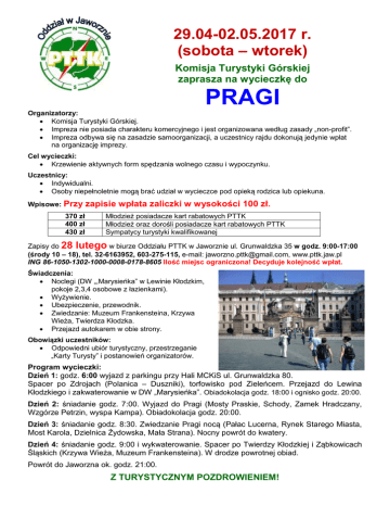 29.04-02.05.2017 r. (sobota – wtorek) Komisja Turystyki Górskiej zaprasza na wycieczkę do PRAGI Organizatorzy: Komisja Turystyki Górskiej. Impreza nie posiada charakteru komercyjnego i jest organizowana według zasady „non-profit”. Impreza odbywa się na zasadzie samoorganizacji, a uczestnicy rajdu dokonują jedynie wpłat na organizację imprezy. Cel wycieczki: Krzewienie aktywnych form spędzania wolnego czasu i wypoczynku. Uczestnicy: Indywidualni. Osoby niepełnoletnie mogą brać udział w wycieczce pod opieką rodzica lub opiekuna. Wpisowe: Przy 370 zł 400 zł 430 zł zapisie wpłata zaliczki w wysokości 100 zł. Młodzież posiadacze kart rabatowych PTTK Młodzież oraz dorośli posiadacze kart rabatowych PTTK Sympatycy turystyki kwalifikowanej Zapisy do 28 lutego w biurze Oddziału PTTK w Jaworznie ul. Grunwaldzka 35 w godz. 9:00-17:00 (środy 10 – 18), tel. 32-6163952, 603-275-115, e-mail: [email protected], www.pttk.jaw.pl ING 86-1050-1302-1000-0008-0178-8605 Ilość miejsc ograniczona! Decyduje kolejność wpłat. Świadczenia: Noclegi (DW „,Marysieńka” w Lewinie Kłodzkim, pokoje 2,3,4 osobowe z łazienkami). Wyżywienie. Ubezpieczenie, przewodnik. Zwiedzanie: Muzeum Frankensteina, Krzywa Wieża, Twierdza Kłodzka. Przejazd autokarem w obie strony. Obowiązki uczestników: Odpowiedni ubiór turystyczny, przestrzeganie „Karty Turysty” i postanowień organizatorów. Program wycieczki: Dzień 1: godz. 6:00 wyjazd z parkingu przy Hali MCKiS ul. Grunwaldzka 80. Spacer po Zdrojach (Polanica – Duszniki), torfowisko pod Zieleńcem. Przejazd do Lewina Kłodzkiego i zakwaterowanie w DW „Marysieńka”. Obiadokolacja godz. 18:00 i ognisko godz. 20:00. Dzień 2: śniadanie godz. 7:00. Wyjazd do Pragi (Mosty Praskie, Schody, Zamek Hradczany, Wzgórze Petrzin, wyspa Kampa). Obiadokolacja godz. 20:00. Dzień 3: śniadanie godz. 8:30. Zwiedzanie Pragi nocą (Pałac Lucerna, Rynek Starego Miasta, Most Karola, Dzielnica Żydowska, Mała Strana). Nocny powrót do kwatery. Dzień 4: śniadanie godz. 9:00 i wykwaterowanie. Spacer po Twierdzy Kłodzkiej i Ząbkowicach Śląskich (Krzywa Wieża, Muzeum Frankensteina). W drodze powrotnej obiad. Powrót do Jaworzna ok. godz. 21:00. Z TURYSTYCZNYM POZDROWIENIEM!