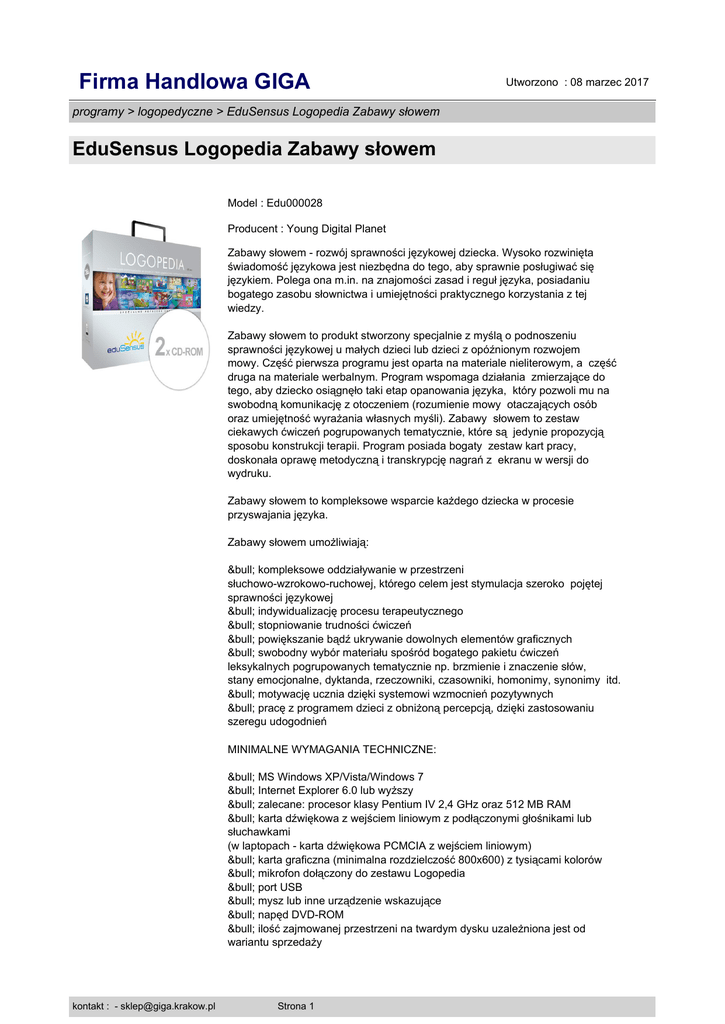 Firma Handlowa GIGA Utworzono : 08 marzec 2017 programy > logopedyczne > EduSensus Logopedia Zabawy słowem EduSensus Logopedia Zabawy słowem Model : Edu000028 Producent : Young Digital Planet Zabawy słowem - rozwój sprawności językowej dziecka. Wysoko rozwinięta świadomość językowa jest niezbędna do tego, aby sprawnie posługiwać się językiem. Polega ona m.in. na znajomości zasad i reguł języka, posiadaniu bogatego zasobu słownictwa i umiejętności praktycznego korzystania z tej wiedzy. Zabawy słowem to produkt stworzony specjalnie z myślą o podnoszeniu sprawności językowej u małych dzieci lub dzieci z opóźnionym rozwojem mowy. Część pierwsza programu jest oparta na materiale nieliterowym, a część druga na materiale werbalnym. Program wspomaga działania zmierzające do tego, aby dziecko osiągnęło taki etap opanowania języka, który pozwoli mu na swobodną komunikację z otoczeniem (rozumienie mowy otaczających osób oraz umiejętność wyrażania własnych myśli). Zabawy słowem to zestaw ciekawych ćwiczeń pogrupowanych tematycznie, które są jedynie propozycją sposobu konstrukcji terapii. Program posiada bogaty zestaw kart pracy, doskonała oprawę metodyczną i transkrypcję nagrań z ekranu w wersji do wydruku. Zabawy słowem to kompleksowe wsparcie każdego dziecka w procesie przyswajania języka. Zabawy słowem umożliwiają: • kompleksowe oddziaływanie w przestrzeni słuchowo-wzrokowo-ruchowej, którego celem jest stymulacja szeroko pojętej sprawności językowej • indywidualizację procesu terapeutycznego • stopniowanie trudności ćwiczeń • powiększanie bądź ukrywanie dowolnych elementów graficznych • swobodny wybór materiału spośród bogatego pakietu ćwiczeń leksykalnych pogrupowanych tematycznie np. brzmienie i znaczenie słów, stany emocjonalne, dyktanda, rzeczowniki, czasowniki, homonimy, synonimy itd. • motywację ucznia dzięki systemowi wzmocnień pozytywnych • pracę z programem dzieci z obniżoną percepcją, dzięki zastosowaniu szeregu udogodnień MINIMALNE WYMAGANIA TECHNICZNE: • MS Windows XP/Vista/Windows 7 • Internet Explorer 6.0 lub wyższy • zalecane: procesor klasy Pentium IV 2,4 GHz oraz 512 MB RAM • karta dźwiękowa z wejściem liniowym z podłączonymi głośnikami lub słuchawkami (w laptopach - karta dźwiękowa PCMCIA z wejściem liniowym) • karta graficzna (minimalna rozdzielczość 800x600) z tysiącami kolorów • mikrofon dołączony do zestawu Logopedia • port USB • mysz lub inne urządzenie wskazujące • napęd DVD-ROM • ilość zajmowanej przestrzeni na twardym dysku uzależniona jest od wariantu sprzedaży kontakt : - [email protected] Strona 1 Firma Handlowa GIGA Utworzono : 08 marzec 2017 programy > logopedyczne > EduSensus Logopedia Zabawy słowem EduSensus Logopedia Zabawy słowem Program wymaga zainstalowanego protokołu TCP/IP w systemie MS Windows. W komputerach niewyposażonych w kartę sieciową należy wraz z protokołem TCP/IP zainstalować kartę Microsoft LooPback. Cena : 1.499,00 zł Brutto ( 1.499,00 zł Netto) kontakt : - [email protected] Strona 2