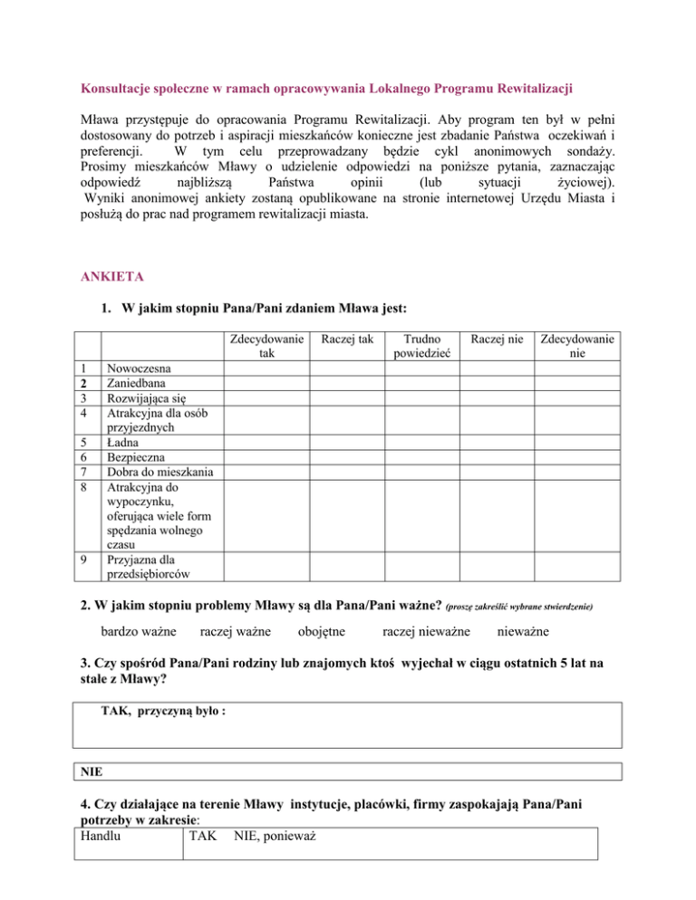 Konsultacje społeczne w ramach opracowywania Lokalnego Programu Rewitalizacji Mława przystępuje do opracowania Programu Rewitalizacji. Aby program ten był w pełni dostosowany do potrzeb i aspiracji mieszkańców konieczne jest zbadanie Państwa oczekiwań i preferencji. W tym celu przeprowadzany będzie cykl anonimowych sondaży. Prosimy mieszkańców Mławy o udzielenie odpowiedzi na poniższe pytania, zaznaczając odpowiedź najbliższą Państwa opinii (lub sytuacji życiowej). Wyniki anonimowej ankiety zostaną opublikowane na stronie internetowej Urzędu Miasta i posłużą do prac nad programem rewitalizacji miasta. ANKIETA 1. W jakim stopniu Pana/Pani zdaniem Mława jest: Zdecydowanie tak 1 2 3 4 Raczej tak Trudno powiedzieć Raczej nie Zdecydowanie nie Nowoczesna Zaniedbana Rozwijająca się Atrakcyjna dla osób przyjezdnych Ładna Bezpieczna Dobra do mieszkania Atrakcyjna do wypoczynku, oferująca wiele form spędzania wolnego czasu Przyjazna dla przedsiębiorców 5 6 7 8 9 2. W jakim stopniu problemy Mławy są dla Pana/Pani ważne? (proszę zakreślić wybrane stwierdzenie) bardzo ważne raczej ważne obojętne raczej nieważne nieważne 3. Czy spośród Pana/Pani rodziny lub znajomych ktoś wyjechał w ciągu ostatnich 5 lat na stałe z Mławy? TAK, przyczyną było : NIE 4. Czy działające na terenie Mławy instytucje, placówki, firmy zaspokajają Pana/Pani potrzeby w zakresie: Handlu TAK NIE, ponieważ Usług TAK NIE, ponieważ Opieki zdrowotnej Rozrywki TAK NIE, ponieważ TAK NIE, ponieważ Pomocy społecznej Bezpieczeństwa TAK NIE, ponieważ TAK NIE, ponieważ 5. Czy Pana/Pani zdaniem w Mławie jest za mało/brakuje (zaznacz odpowiedź TAK lub NIE przy każdym stwierdzeniu): 1 nowych dróg 2 ścieżek rowerowych 3 parkingów 4 obiektów sportowych 5 wielofunkcyjnego centrum handlowo-usługowego Rekreacyjnych terenów zielonych Różnorodnej oferty kulturalnej Restauracji lub kawiarni 6 7 8 9 10 11 12 Miejsc noclegowych (hotele, motele, ośrodki wypoczynkowe) Lokalnych połączeń komunikacyjnych Terenów inwestycyjnych Brak atrakcyjnych miejsc pracy 15 Zajęć dodatkowych dla dzieci i młodzieży Oferty różnych zajęć dla dorosłych Przedszkoli 16 Żłobków 17 Placów zabaw 18 Świetlic dla dzieci 19 Możliwości zdobycia nowych kwalifikacji dostępu do Internetu TAK NIE TAK NIE TAK NIE TAK NIE TAK NIE TAK NIE TAK NIE TAK NIE TAK NIE 13 21 Obiektów przyciągających turystów TAK NIE TAK NIE TAK NIE 22 Oświetlenia ulic 23 Systemu wsparcia dla MŚP Promocji miasta 14 20 24 6. Jakich jeszcze (niewymienionych wyżej) obiektów/usług lub brakuje w Mławie? TAK NIE TAK NIE TAK NIE TAK NIE TAK NIE TAK NIE TAK NIE TAK NIE TAK NIE TAK NIE TAK NIE TAK NIE 7. Jakie są najpoważniejsze w Pana/Pani ocenie problemy społeczne w Mławie? 1 2 3 4 5 6 7 8 9 Odpływ ludzi młodych i dobrze wykształconych Niewystarczające zasoby mieszkaniowe Patologie społeczne Niska aktywność społeczna ludzi młodych Niska aktywność społeczna ludzi starszych Rozpad więzi społecznych (np. sąsiedzkich) Słaba integracja lokalnej społeczności w sprawach dotyczących miasta Duże rozwarstwienie społeczne (duże dysproporcje w zarobkach, warunkach życia, dostępie do dóbr) Inne (jakie) TAK TAK TAK TAK TAK TAK TAK NIE NIE NIE NIE NIE NIE NIE TAK NIE 8. Gdyby od Pana/Pani zależało dokonanie zmian w Mławie bez względu na koszty, to co by Pan/Pani zrobił/ła najpierw? 9. W każdym mieście występują różnorakie problemy. Jaki rozmiar mają poniższe problemy w Mławie? Bardzo duże Korki uliczne Zaśmiecenie miasta Zanieczyszczenie środowiska 4 Brak nowych mieszkań 5 Problemy z komunikacją miejską 6 Bieda 7 Uzależnienia 8 Trudności ze znalezieniem pracy 9 Przestępczość 10 Brzydka zabudowa 11 Niska jakość edukacji 12 Brak możliwości spędzania czasu w atrakcyjny sposób 1 2 3 Dość duże Trudno powiedzieć Dość małe Bardzo małe 10. Jakie jeszcze (niewymienione wyżej ) problemy występują w Mławie? 11. Jakie obszary Mławy (osiedla, dzielnice, ulice) Pana/Pani zdaniem : Są najbiedniejsze Są najbardziej niebezpieczne Wymagają odnowienia Potrzebują nowych połączeń komunikacyjnych Są najbrzydsze Są najmniej atrakcyjne do założenia własnego biznesu Są najmniej atrakcyjne do mieszkania 12. Gdyby powstała nowa społeczna organizacja ( np. stowarzyszenie) zajmująca się sprawami mieszkańców Mławy to powinna się ona zajmować przede wszystkim 13. Czy uczestniczy Pan/Pani osobiście lub ktoś z najbliższej rodziny (mąż, żona, dzieci) w następujących imprezach/korzysta z nw. oferty usługowej/ kulturalnej dla mieszkańców: 1 Dni Mławy TAK 13 Dodatkowe zajęcia TAK NIE sportowe NIE dla dorosłych 2 Uroczystości związane z TAK 14 Dodatkowe zajęcia TAK obchodami Bitwy o Mławę NIE sportowe NIE dla młodzieży 3 Imprezy organizowane przez TAK 15 Spędzanie czasu w TAK Miejski Dom Kultury NIE przestrzeni publicznej NIE (konkursy, występy miasta (np. Park Miejski) artystyczne, przedstawienia) 4 Festyny miejskie TAK 16 Wyścig Tour de Pologne TAK NIE NIE 5 Zajęcia pozaszkolne lub TAK 17 Sylwester przy Ratuszu TAK pozalekcyjne dla młodzieży NIE NIE 6 Zajęcia dodatkowe dla TAK 18 Wycieczki rowerowe i TAK dorosłych w ramach NIE korzystanie z istniejących NIE realizacji własnych ścieżek rowerowych zainteresowań 14. Czy działa Pan/Pani w organizacjach społecznych? Tak (proszę krótko opisać profil działania) Nie Prosimy o podanie Państwa podstawowych informacji demograficznych (wyłącznie do celów statystycznych) 1. Płeć: Kobieta Mężczyzna 2. Wiek Do 18 lat 18-25 lat 26- 45 lat 46-64 lata Powyżej 65 lat 3. Wykształcenie: Podstawowe Zasadnicze zawodowe Średnie Policealne i niepełne wyższe Wyższe zawodowe (licencjat) Wyższe (magisterskie) 4. Status zawodowy Uczeń/ student (nauka w trybie dziennym) Student uczący się w trybie innym niż dzienny i niepracujący Pracujący (także wolne zawody) Przedsiębiorca Osoba po