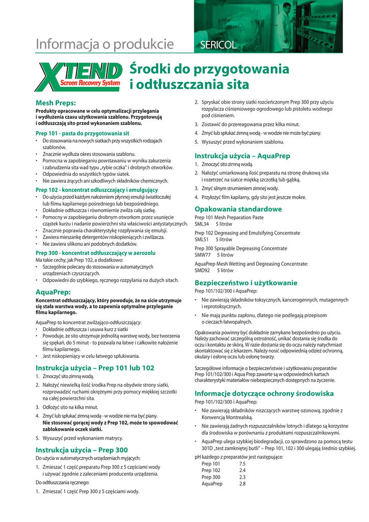 Informacja o produkcie SERICOL Środki do przygotowania i odtłuszczania sita Mesh Preps: Produkty opracowane w celu optymalizacji przylegania i wydłużenia czasu użytkowania szablonu. Przygotowują i odtłuszczają sito przed wykonaniem szablonu. 2. Spryskać obie strony siatki rozcieńczonym Prep 300 przy użyciu rozpylacza ciśnieniowego ogrodowego lub pistoletu wodnego pod ciśnieniem. 3. Zostawić do przereagowania przez kilka minut. Prep 101 - pasta do przygotowania sit 4. Zmyć lub spłukać zimną wodą - w wodzie nie może być piany. • Do stosowania na nowych siatkach przy wszystkich rodzajach szablonów. • Znacznie wydłuża okres stosowania szablonu. • Pomocna w zapobieganiu powstawaniu w wyniku zakurzenia i zabrudzenia sita wad typu „rybie oczka” i drobnych otworków. • Odpowiednia do wszystkich typów siatek. • Nie zawiera żrących ani szkodliwych składników chemicznych. 5. Wysuszyć przed wykonaniem szablonu. Prep 102 - koncentrat odłuszczający i emulgujący 3. Zmyć silnym strumieniem zimnej wody. • Do użycia przed każdym nałożeniem płynnej emulsji światłoczułej lub filmu kapilarnego pośredniego lub bezpośredniego. • Dokładnie odtłuszcza i równomiernie zwilża całą siatkę. • Pomocny w zapobieganiu drobnym otworkom przez usunięcie cząstek kurzu i nadanie powierzchni sita właściwości antystatycznych. • Znacznie poprawia charakterystykę rozpływania się emulsji. • Zawiera mieszankę detergentów niskopieniących i zwilżacza. • Nie zawiera silikonu ani podobnych dodatków. 4. Przyłożyć film kapilarny, gdy sito jest jeszcze mokre. Prep 300 - koncentrat odtłuszczający w aerozolu Ma takie cechy, jak Prep 102, a dodatkowo: • Szczególnie polecany do stosowania w automatycznych urządzeniach czyszczących. • Odpowiedni do szybkiego, ręcznego rozpylania na dużych sitach. AquaPrep: Koncentrat odtłuszczający, który powoduje, że na sicie utrzymuje się stała warstwa wody, a to zapewnia optymalne przyleganie filmu kapilarnego. AquaPrep to koncentrat zwilżająco-odtłuszczający: • Dokładnie odtłuszcza i usuwa kurz z siatki • Powoduje, że sito utrzymuje jednolitą warstwę wody, bez tworzenia się spękań, do 5 minut - to pozwala na łatwe i całkowite nałożenie filmu kapilarnego. • Jest niskopieniący w celu łatwego spłukiwania. Instrukcja użycia – Prep 101 lub 102 1. Zmoczyć sito zimną wodą. 2. Nałożyć niewielką ilość środka Prep na obydwie strony siatki, rozprowadzić ruchami okrężnymi przy pomocy miękkiej szczotki na całej powierzchni sita. 3. Odłożyć sito na kilka minut. 4. Zmyć lub spłukać zimną wodą - w wodzie nie ma być piany. Nie stosować gorącej wody z Prep 102, może to spowodować zablokowanie oczek siatki. 5. Wysuszyć przed wykonaniem matrycy. Instrukcja użycia – Prep 300 Do użycia w automatycznych urządzeniach myjących: 1. Zmieszać 1 część preparatu Prep 300 z 5 częściami wody i używać zgodnie z zaleceniami producenta urządzenia. Do odtłuszczania ręcznego: 1. Zmieszać 1 część Prep 300 z 5 częściami wody. Instrukcja użycia – AquaPrep 1. Zmoczyć sito zimną wodą. 2. Nałożyć umiarkowaną ilość preparatu na stronę drukową sita i rozetrzeć na siatce miękką szczotką lub gąbką. Opakowania standardowe Prep 101 Mesh Preparation Paste SML34 5 litrów Prep 102 Degreasing and Emulsifying Concentrate SML51 5 litrów Prep 300 Sprayable Degreasing Concentrate SMW77 5 litrów AquaPrep Mesh Wetting and Degreasing Concentrate: SMD92 5 litrów Bezpieczeństwo i użytkowanie Prep 101/102/300 i AquaPrep: • Nie zawierają składników toksycznych, kancerogennych, mutagennych i reprotoksycznych. • Nie mają punktu zapłonu, dlatego nie podlegają przepisom o cieczach łatwopalnych. Opakowania powinny być dokładnie zamykane bezpośrednio po użyciu. Należy zachować szczególną ostrożność, unikać dostania się środka do oczu i kontaktu ze skórą. W razie dostania się do oczu należy natychmiast skontaktować się z lekarzem. Należy nosić odpowiednią odzież ochronną, okulary i osłonę oczu lub osłonę twarzy. Szczegółowe informacje o bezpieczeństwie i użytkowaniu preparatów Prep 101/102/300 i Aqua Prep zawarte są w odpowiednich kartach charakterystyki materiałów niebezpiecznych dostępnych na życzenie. Informacje dotyczące ochrony środowiska Prep 101/102/300 i AquaPrep: • Nie zawierają składników niszczących warstwę ozonową, zgodnie z Konwencją Montrealską. • Nie zawierają żadnych rozpuszczalników lotnych i dlatego są korzystne dla środowiska w porównaniu z produktami rozpuszczalnikowymi. • AquaPrep ulega szybkiej biodegradacji, co sprawdzono za pomocą testu 301D „test zamkniętej butli” – Prep 101, 102 i 300 ulegają średnio szybkiej. pH każdego z preparatów jest następujące: Prep 101 7.5 Prep 102 2.4 Prep 300 2.3 AquaPrep 2.8 Informacje i zalecenia zawarte w ulotce informacyjnej o produkcie, jak również pisemne lub ustne porady techniczne udzielone przez pracowników naszej firmy są oparte na obecnym stanie wiedzy i wydają się być odpowiednie. Niemniej jednak ze względu na duże zróżnicowanie powszechnie stosowanych technologii, podłoży i innych materiałów nie możemy zagwarantować przydatności naszych produktów do wszystkich zastosowań. Z tego powodu nasze produkty sprzedawane są bez gwarancji i z zaleceniem przeprowadzenia przez klienta indywidualnych testów sprawdzających zgodność produktu z wymaganiami. Polityką naszej firmy jest ciągłe udoskonalanie produktów przez nas wytwarzanych i dlatego niektóre informacje zawarte w ulotkach informacyjnych mogą być już nieaktualne. W związku z tym prosimy o upewnienie się, że posiadacie Państwo aktualne informacje i zalecenia. FUJIFILM SERICOL Polska Sp. z o.o. ul. Muszkieterów 15A, 02-273 Warszawa Tel: +48 22 868 6322, 24 lub 28 Fax: +48 22 868 6325 Dział sprzedaży: +48 22 868 6322, email: [email