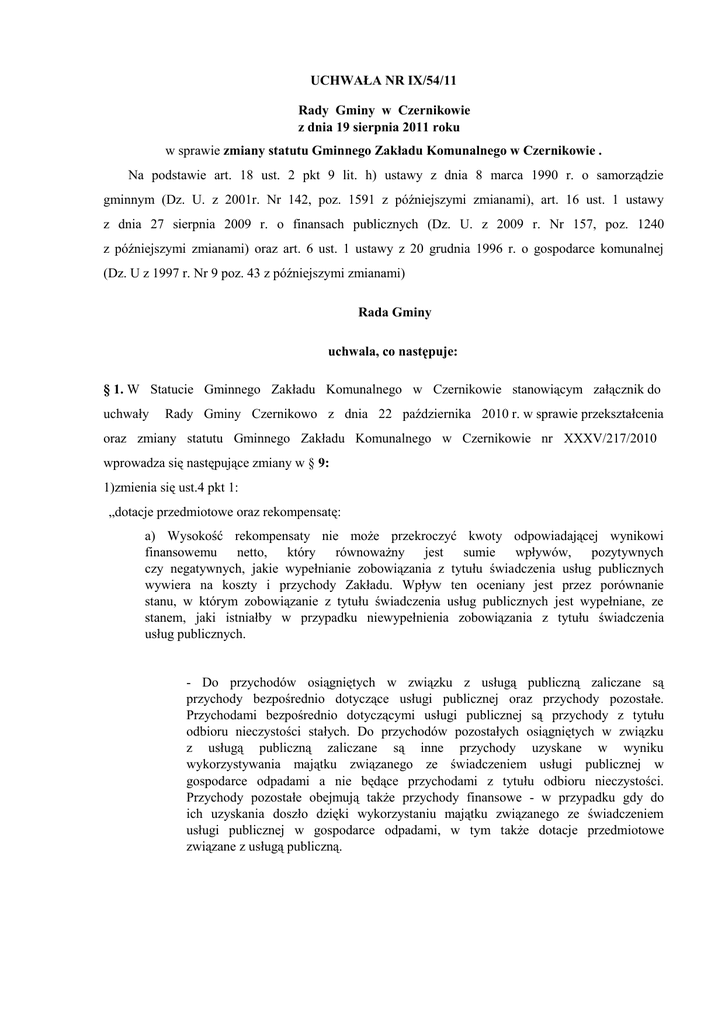 UCHWAŁA NR IX/54/11 Rady Gminy w Czernikowie z dnia 19 sierpnia 2011 roku w sprawie zmiany statutu Gminnego Zakładu Komunalnego w Czernikowie . Na podstawie art. 18 ust. 2 pkt 9 lit. h) ustawy z dnia 8 marca 1990 r. o samorządzie gminnym (Dz. U. z 2001r. Nr 142, poz. 1591 z późniejszymi zmianami), art. 16 ust. 1 ustawy z dnia 27 sierpnia 2009 r. o finansach publicznych (Dz. U. z 2009 r. Nr 157, poz. 1240 z późniejszymi zmianami) oraz art. 6 ust. 1 ustawy z 20 grudnia 1996 r. o gospodarce komunalnej (Dz. U z 1997 r. Nr 9 poz. 43 z późniejszymi zmianami) Rada Gminy uchwala, co następuje: § 1. W Statucie Gminnego Zakładu Komunalnego w Czernikowie stanowiącym załącznik do uchwały Rady Gminy Czernikowo z dnia 22 października 2010 r. w sprawie przekształcenia oraz zmiany statutu Gminnego Zakładu Komunalnego w Czernikowie nr XXXV/217/2010 wprowadza się następujące zmiany w § 9: 1)zmienia się ust.4 pkt 1: „dotacje przedmiotowe oraz rekompensatę: a) Wysokość rekompensaty nie może przekroczyć kwoty odpowiadającej wynikowi finansowemu netto, który równoważny jest sumie wpływów, pozytywnych czy negatywnych, jakie wypełnianie zobowiązania z tytułu świadczenia usług publicznych wywiera na koszty i przychody Zakładu. Wpływ ten oceniany jest przez porównanie stanu, w którym zobowiązanie z tytułu świadczenia usług publicznych jest wypełniane, ze stanem, jaki istniałby w przypadku niewypełnienia zobowiązania z tytułu świadczenia usług publicznych. - Do przychodów osiągniętych w związku z usługą publiczną zaliczane są przychody bezpośrednio dotyczące usługi publicznej oraz przychody pozostałe. Przychodami bezpośrednio dotyczącymi usługi publicznej są przychody z tytułu odbioru nieczystości stałych. Do przychodów pozostałych osiągniętych w związku z usługą publiczną zaliczane są inne przychody uzyskane w wyniku wykorzystywania majątku związanego ze świadczeniem usługi publicznej w gospodarce odpadami a nie będące przychodami z tytułu odbioru nieczystości. Przychody pozostałe obejmują także przychody finansowe - w przypadku gdy do ich uzyskania doszło dzięki wykorzystaniu majątku związanego ze świadczeniem usługi publicznej w gospodarce odpadami, w tym także dotacje przedmiotowe związane z usługą publiczną. - Do przychodów pozostałych osiągniętych w związku z usługą publiczną zaliczane są także przychody wspólne dla działalności publicznej oraz pozostałej działalności gospodarczej Zakładu uzyskane w wyniku gospodarowania majątkiem służącym do ogólnego zarządzania Zakładem w części proporcjonalnej do udziału przychodów uzyskanych w związku z usługą publiczną w sumie przychodów związanych bezpośrednio z usługami świadczonymi przez Zakład. - Dokumentami źródłowymi identyfikującymi uzyskane przychody są wystawione i uzyskane przez Zakład faktury VAT, noty księgowe oraz wyciągi bankowe w przypadku uzyskania przychodów finansowych. - Do kosztów związanych z realizacją usługi publicznej zaliczane są koszty bezpośrednio dotyczące usługi publicznej oraz koszty pozostałe. Do kosztów bezpośrednich dotyczących usługi publicznej są wszelkie koszty dotyczące gospodarowania majątkiem bezpośrednio związanym ze świadczeniem usługi publicznej, w szczególności koszty amortyzacji majątku, zużycia materiałów i energii oraz paliw, usług napraw i konserwacji majątku, opłat i podatków oraz wynagrodzeń wraz z narzutami pracowników Zakładu związanych bezpośrednio ze świadczeniem usługi publicznej, koszty finansowe bezpośrednio związane z majątkiem wykorzystywanym ze świadczeniem usługi publicznej. Z kosztów amortyzacji majątku wyłączone są koszty amortyzacji majątku przekazanego w związku z realizacją usługi publicznej. -Do kosztów pozostałych związanych z realizacją usługi publicznej zaliczane są koszty ogólne zarządzania Zakładem, w szczególności koszty amortyzacji majątku służącego do zarządzania zakładem, zużycia materiałów i energii, usług, opłat i podatków, wynagrodzeń wraz z narzutami pracowników w sposób ogólny zarządzających przedsiębiorstwem oraz pozostałe koszty. Koszty ogólne zwiększają koszty pozostałe świadczenia usługi publicznej w części proporcjonalnej do udziału przychodów uzyskanych w związku z usługą publiczną w sumie przychodów związanych bezpośrednio z usługami świadczonymi przez Zakład. -Dokumentami źródłowymi identyfikującymi poniesione koszty bezpośrednie są otrzymane oraz wystawione przez Zakład faktury VAT, rachunki, noty księgowe, listy płac oraz wyciągi bankowe - w przypadku poniesienia kosztów finansowych. b) Koszty świadczenia usługi publicznej poniesione przez Zakład i wykazane w wyliczeniu rekompensaty porównywane są z kosztami świadczenia tej usługi jakie poniosłoby przedsiębiorstwo średniej wielkości, prawidłowo zarządzane i odpowiednio wyposażone w majątek pozwalający na spełnienie nałożonych wymogów usługi użyteczności publicznej, z uwzględnieniem przychodów związanych z świadczeniem tych usług i rozsądnego zysku wynikającego z wykonywania zobowiązania. W przypadku, gdy sumaryczne koszty świadczenia usługi publicznej poniesione przez Zakład przekraczają wyliczone sumaryczne koszty świadczenia tej usługi jakie poniosłoby przedsiębiorstwo średniej wielkości, wówczas w wyliczeniu wartości rekompensaty uwzględniane są sumaryczne koszty świadczenia tej usługi jakie poniosłoby przedsiębiorstwo średniej wielkości. c) Aby obliczyć wynik finansowy netto, Gmina obliczania: 1 Koszty poniesione w związku z usługą publiczną (+) 1.1. Koszty operacyjne (bez amortyzacji) 1.2. Amortyzacja 1.3. Odsetki zapłacone kieruje się następującym systemem 1.4. Pozostałe koszty 1.5. Podatek dochodowy 2 Przychody uzyskane w związku z usługą publiczną (-) 2.1. Przychody bezpośrednio dotyczące usługi