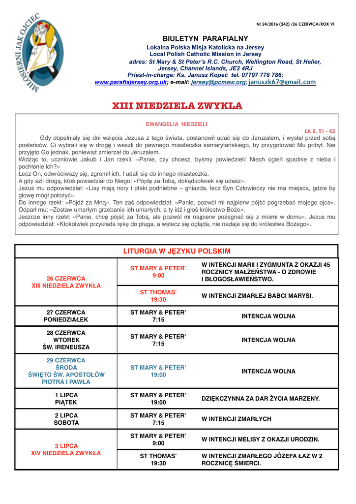 Nr 24/2016 (242) /26 CZERWCA/ROK VI BIULETYN PARAFIALNY Lokalna Polska Misja Katolicka na Jersey Local Polish Catholic Mission in Jersey adres: St Mary & St Peter’s R.C. Church, Wellington Road, St Helier, Jersey, Channel Islands, JE2 4RJ Priest-in-charge: Ks. Janusz Kopeć tel. 07797 778 786; www.parafiajersey.org.uk; e-mail: [email protected];[email protected] XIII NIEDZIELA ZWYKðA EWANGELIA NIEDZIELI Łk 9, 51 - 62 Gdy dopełniały się dni wzięcia Jezusa z tego świata, postanowił udać się do Jeruzalem, i wysłał przed sobą posłańców. Ci wybrali się w drogę i weszli do pewnego miasteczka samarytańskiego, by przygotować Mu pobyt. Nie przyjęto Go jednak, ponieważ zmierzał do Jeruzalem. Widząc to, uczniowie Jakub i Jan rzekli: «Panie, czy chcesz, byśmy powiedzieli: Niech ogień spadnie z nieba i pochłonie ich?» Lecz On, odwróciwszy się, zgromił ich. I udali się do innego miasteczka. A gdy szli drogą, ktoś powiedział do Niego: «Pójdę za Tobą, dokądkolwiek się udasz». Jezus mu odpowiedział: «Lisy mają nory i ptaki podniebne – gniazda, lecz Syn Człowieczy nie ma miejsca, gdzie by głowę mógł położyć». Do innego rzekł: «Pójdź za Mną». Ten zaś odpowiedział: «Panie, pozwól mi najpierw pójść pogrzebać mojego ojca». Odparł mu: «Zostaw umarłym grzebanie ich umarłych, a ty idź i głoś królestwo Boże». Jeszcze inny rzekł: «Panie, chcę pójść za Tobą, ale pozwól mi najpierw pożegnać się z moimi w domu». Jezus mu odpowiedział: «Ktokolwiek przykłada rękę do pługa, a wstecz się ogląda, nie nadaje się do królestwa Bożego». LITURGIA W JĘZYKU POLSKIM 26 CZERWCA XIII NIEDZIELA ZWYKŁA ST MARY & PETER’ 9:00 ST THOMAS’ 19:30 W INTENCJI MARII I ZYGMUNTA Z OKAZJI 45 ROCZNICY MAŁŻEŃSTWA - O ZDROWIE I BŁOGOSŁAWIEŃSTWO. W INTENCJI ZMARŁEJ BABCI MARYSI. 27 CZERWCA PONIEDZIAŁEK ST MARY & PETER’ 7:15 INTENCJA WOLNA 28 CZERWCA WTOREK ŚW. IRENEUSZA ST MARY & PETER’ 7:15 INTENCJA WOLNA 29 CZERWCA ŚRODA ŚWIĘTO ŚW. APOSTOŁÓW PIOTRA I PAWŁA ST MARY & PETER’ 19:00 INTENCJA WOLNA 1 LIPCA PIĄTEK ST MARY & PETER’ 19:00 DZIĘKCZYNNA ZA DAR ŻYCIA MARZENY. 2 LIPCA SOBOTA ST MARY & PETER’ 7:15 W INTENCJI ZMARŁYCH ST MARY & PETER’ 9:00 W INTENCJI MELISY Z OKAZJI URODZIN. ST THOMAS’ 19:30 W INTENCJI ZMARŁEGO JÓZEFA ŁAZ W 2 ROCZNICĘ ŚMIERCI. 3 LIPCA XIV NIEDZIELA ZWYKŁA INFORMACJE Nr 24/2016 (242) /26 CZERWCA/ROK VI Dziś kończy się trzydniowa wizyta apostolska papieża Franciszka w Armenii. W naszej modlitwie powierzamy Panu Bogu owoce tej pielgrzymki. W tym tygodniu: we wtorek, 28 czerwca – wspomnienie św. Ireneusza, biskupa i męczennika. W środę, 29 czerwca – uroczystość świętych Apostołów Piotra i Pawła, dzień szczególnej modlitwy w intencji papieża. Zapraszam do udziału we mszy św. o godz. 19:00 w St Mary & Peter’s. W tym tygodniu także pierwszy piątek i pierwsza sobota. W piątek okazja do spowiedzi od godz.18:30 oraz w trakcie adoracji. Radę Administracyjna Mary & Peter’s. naszej parafii zapraszam na spotkanie w sobotę 2 lipca o godz. 19:30 do St SAKRAMENTY LITURGIA MSZY ŚWIĘTEJ W JĘZYKU POLSKIM WEDŁUG PODANEGO NA PIERWSZEJ STRONIE PORZĄDKU. CHRZEST Proszę o osobisty kontakt co najmniej miesiąc przed planowanym chrztem. Podczas spotkania będzie wręczona aplikacja oraz ustalony termin katechezy chrzcielnej i samego chrztu. SPOWIEDŹ Okazja do spowiedzi: w niedzielę 15 minut przed Mszą św. w piątek: 18.45 i po Mszy podczas adoracji lub przez indywidualne umówienie. MAŁŻEŃSTWO Narzeczeni, którzy mieszkają na Jersey ponad 6 miesięcy, należą do parafii Polskiej Misji Katolickiej i pragną zawrzeć sakramentalny związek małżeński powinni skontaktować się ze swoim duszpasterzem ok. 6 miesięcy przed planowaną datą ślubu w celu rozpoczęcia procedur. BIERZMOWANIE Młodzież, która pragnie w przyszłym roku przyjąć sakrament bierzmowania zaproszona jest do udziału w programie formacyjnym. Spotkanie informacyjne dla tej młodzieży i jej rodziców będzie miało miejsce w St Thomas Hall w lipcu. Data i informacja na temat zapisów będzie w biuletynie parafii angielskiej oraz na stronie facebook ‘Like the Jersey Association of Catholic Youth’. SPOTKANIA MODLITEWNE I GRUPY APOSTOLSKIE MODLITWA RÓŻAŃCOWA W najbliższą środę nie będzie modlitwy różańcowej o 20:00. O 19:00 Msza św. w St Mary & Peter’s a po Mszy o 20:00 medytacja karmelitańska. RÓŻE RÓŻAŃCOWE Zainteresowanych włączeniem się do Róż Różańcowych (mamy ich dwie) proszę o osobisty kontakt. Zmiana Róży w każdą I niedzielę miesiąca po Mszy św. wieczornej (o 19:30). GRUPA MODLITEWNA Spotkanie we środę, 6 lipca o 20:45 w St Mary & Peter’ - po modlitwie różańcowej. KORONKA DO MIŁOSIERDZIA W każdy piątek przed Mszą św. o 19:00 w St Mary’s & Peter’s. DUCHOWOŚĆ KARMELITAŃSKA Zainteresowanych duchowością karmelitańską zapraszam na spotkanie w środę 29 czerwca ok.20:00. POLSKA PRAY & PLAY GRUPA Spotkania odbywają się w poniedziałki w godzinach od 10:00 do 12:00 w St.Thomas’ Hall. Najbliższe spotkanie będzie miało miejsce w poniedziałek 20 czerwca. Jednoczenie warto nadmienić, że tego dnia z okazji Dzień Dziecka przygotowane będą dodatkowe atrakcje. Kontakt: Ewelina: 07700776600 Ile razy mówimy sobie: „muszę się zmienić, nie mogę tak dalej żyć, jeśli będę w życiu szedł tą drogą, to będzie ono bezowocne, bezużyteczne, nie będę szczęśliwy”. Ileż to razy nachodzą nas takie myśli. Nie stawiajmy oporu; tylko gdy otworzymy się na Jego miłosierdzie, znajdziemy prawdziwe życie i prawdziwą radość. Trzeba tylko otworzyć drzwi na oścież. N a w r a c a j c i e s i ę i wierzcie w Ewangelię. To poważne wezwanie, zobowiązujące, dotyczy każdego. Niech wzbudzi w nas pragnienie przemiany życia. Odnowieni w duchu bądźmy dla świata ewangelicznym zaczynem prawdy, przebaczenia, miłosi