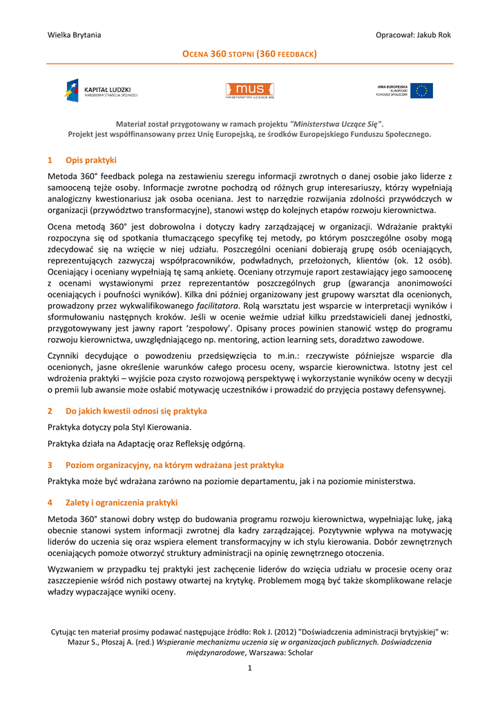 Wielka Brytania Opracował: Jakub Rok OCENA 360 STOPNI (360 FEEDBACK) Materiał został przygotowany w ramach projektu "Ministerstwa Uczące Się". Projekt jest współfinansowany przez Unię Europejską, ze środków Europejskiego Funduszu Społecznego. 1 Opis praktyki Metoda 360° feedback polega na zestawieniu szeregu informacji zwrotnych o danej osobie jako liderze z samooceną tejże osoby. Informacje zwrotne pochodzą od różnych grup interesariuszy, którzy wypełniają analogiczny kwestionariusz jak osoba oceniana. Jest to narzędzie rozwijania zdolności przywódczych w organizacji (przywództwo transformacyjne), stanowi wstęp do kolejnych etapów rozwoju kierownictwa. Ocena metodą 360° jest dobrowolna i dotyczy kadry zarządzającej w organizacji. Wdrażanie praktyki rozpoczyna się od spotkania tłumaczącego specyfikę tej metody, po którym poszczególne osoby mogą zdecydować się na wzięcie w niej udziału. Poszczególni oceniani dobierają grupę osób oceniających, reprezentujących zazwyczaj współpracowników, podwładnych, przełożonych, klientów (ok. 12 osób). Oceniający i oceniany wypełniają tę samą ankietę. Oceniany otrzymuje raport zestawiający jego samoocenę z ocenami wystawionymi przez reprezentantów poszczególnych grup (gwarancja anonimowości oceniających i poufności wyników). Kilka dni później organizowany jest grupowy warsztat dla ocenionych, prowadzony przez wykwalifikowanego facilitatora. Rolą warsztatu jest wsparcie w interpretacji wyników i sformułowaniu następnych kroków. Jeśli w ocenie weźmie udział kilku przedstawicieli danej jednostki, przygotowywany jest jawny raport ‘zespołowy’. Opisany proces powinien stanowić wstęp do programu rozwoju kierownictwa, uwzględniającego np. mentoring, action learning sets, doradztwo zawodowe. Czynniki decydujące o powodzeniu przedsięwzięcia to m.in.: rzeczywiste późniejsze wsparcie dla ocenionych, jasne określenie warunków całego procesu oceny, wsparcie kierownictwa. Istotny jest cel wdrożenia praktyki – wyjście poza czysto rozwojową perspektywę i wykorzystanie wyników oceny w decyzji o premii lub awansie może osłabić motywację uczestników i prowadzić do przyjęcia postawy defensywnej. 2 Do jakich kwestii odnosi się praktyka Praktyka dotyczy pola Styl Kierowania. Praktyka działa na Adaptację oraz Refleksję odgórną. 3 Poziom organizacyjny, na którym wdrażana jest praktyka Praktyka może być wdrażana zarówno na poziomie departamentu, jak i na poziomie ministerstwa. 4 Zalety i ograniczenia praktyki Metoda 360° stanowi dobry wstęp do budowania programu rozwoju kierownictwa, wypełniając lukę, jaką obecnie stanowi system informacji zwrotnej dla kadry zarządzającej. Pozytywnie wpływa na motywację liderów do uczenia się oraz wspiera element transformacyjny w ich stylu kierowania. Dobór zewnętrznych oceniających pomoże otworzyć struktury administracji na opinię zewnętrznego otoczenia. Wyzwaniem w przypadku tej praktyki jest zachęcenie liderów do wzięcia udziału w procesie oceny oraz zaszczepienie wśród nich postawy otwartej na krytykę. Problemem mogą być także skomplikowane relacje władzy wypaczające wyniki oceny. Cytując ten materiał prosimy podawać następujące źródło: Rok J. (2012) "Doświadczenia administracji brytyjskiej" w: Mazur S., Płoszaj A. (red.) Wspieranie mechanizmu uczenia się w organizacjach publicznych. Doświadczenia międzynarodowe, Warszawa: Scholar 1 Wielka Brytania Opracował: Jakub Rok Niemniej, opisywana praktyka powinna zostać wdrożona w Polsce, szczególnie wobec niedoboru mechanizmów pozyskiwania informacji zwrotnej. Istotne jest także uwzględnienie szerokiego grona interesariuszy. Źródła Wywiady MUS – Londyn 2012 Załączniki brak Cytując ten materiał prosimy podawać następujące źródło: Rok J. (2012) "Doświadczenia administracji brytyjskiej" w: Mazur S., Płoszaj A. (red.) Wspieranie mechanizmu uczenia się w organizacjach publicznych. Doświadczenia międzynarodowe, Warszawa: Scholar 2