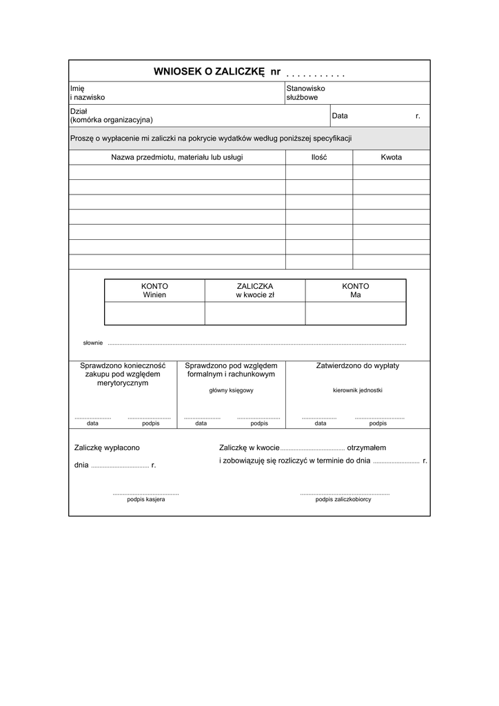 WNIOSEK O ZALICZKĘ nr . . . . . . . . . . . Imię i nazwisko Stanowisko służbowe Dział (komórka organizacyjna) Data r. Proszę o wypłacenie mi zaliczki na pokrycie wydatków według poniższej specyfikacji Nazwa przedmiotu, materiału lub usługi KONTO Winien Ilość Kwota ZALICZKA w kwocie zł KONTO Ma słownie .................................................................................................................................................................................... Sprawdzono konieczność zakupu pod względem merytorycznym ...................... data .......................... podpis ................................... Zatwierdzono do wypłaty główny księgowy kierownik jednostki ...................... data .......................... podpis ..................... data .............................. podpis Zaliczkę w kwocie ....................................... otrzymałem Zaliczkę wypłacono dnia Sprawdzono pod względem formalnym i rachunkowym r. ........................................ podpis kasjera i zobowiązuję się rozliczyć w terminie do dnia ............................ ...................................................... podpis zaliczkobiorcy r.