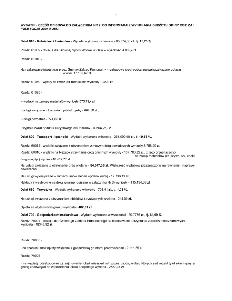 1 WYDATKI - CZĘŚĆ OPISOWA DO ZAŁĄCZNIKA NR 2 DO INFORMACJI Z WYKONANIA BUDŻETU GMINY OSIE ZA I PÓŁREOCZE 2007 ROKU Dział 010 - Rolnictwo i łowiectwo - Wydatki wykonano w kwocie - 65.074,88 zł., tj. 47,25 %. Rozdz. 01009 - dotacja dla Gminnej Spółki Wodnej w Osiu w wysokości 4.000,- zł. Rozdz. 01010 Na realizowane inwestycje przez Gminny Zakład Komunalny - rozbudowę sieci wodociągowej przekazano dotację w wys. 17.136,67 zł. Rozdz. 01030 - wpłaty na rzecz Izb Rolniczych wyniosły 1.382- zł. Rozdz. 01095 - wydatki na zakupy materiałów wyniosły 575,79,- zł. - usługi związane z badaniem próbek gleby - 697,50 zł., - usługi pozostałe - 774,67 zł. - wypłata-zwrot podatku akcyzowego dla rolników - 40508,25,- zł. Dział 600 - Transport i łączność - Wydatki wykonano w kwocie - 261.599,00 zł., tj. 19,58 %. Rozdz. 60014 - wydatki związane z utrzymaniem zimowym dróg powiatowych wyniosły 8.758,00 zł. Rozdz. 60016 - wydatki na bieżące utrzymanie dróg gminnych wyniosły - 137.706,32 zł., z tego przeznaczono na zakup materiałów (kruszywo, sól, znaki drogowe, itp.) wydano 40.422,77 zł. Na usługi związane z utrzymanie dróg wydano - 84.547,36 zł. Większość wydatków przeznaczono na równanie i naprawy nawierzchni. Na usługi wykonywane w ramach umów zleceń wydano kwotę - 12.736,19 zł. Nakłady inwestycyjne na drogi gminne (opisane w załączniku Nr 3) wyniosły - 115.134,68 zł. Dział 630 - Turystyka - Wydatki wykonano w kwocie - 726,51 zł., tj. 1,33 %. Na usługi związane z utrzymaniem obiektów turystycznych wydano - 244,00 zł. Opłata za użytkowanie gruntu wyniosła - 482,51 zł. Dział 700 - Gospodarka mieszkaniowa - Wydatki wykonano w wysokości - 39.7736 zł., tj. 61,99 %. Rozdz. 70004 - dotacja dla Gminnego Zakładu Komunalnego na finansowanie utrzymania zasobów mieszkaniowych wyniosła - 18346,92 zł. Rozdz. 70005 - na szacunki oraz opłaty związane z gospodarką gruntami przeznaczono - 2.111,55 zł. Rozdz. 70095 - na wypłatę odszkodowań za zajmowanie lokali mieszkalnych przez osoby, wobec których sąd orzekł tytuł eksmisyjny a gminę zobowiązał do zapewnienia lokalu socjalnego wydano - 2787,37 zł. 2 - wydatki inwestycyjne na zakup pieców CO do budynków komunalnych wyniosły- 16.490,74 zł. Dział 710 - Działalność usługowa - Wydatki wykonano w kwocie - 22.996,80 zł., tj. 21,90 %. Na usługi związane z planowaniem przestrzennym oraz zmianami w planie zagospodarowania przestrzennego wydano 12968,40 zł. Na opracowanie kartograficzne i pomiary geodezyjne dot. gruntów gminnych wydano - 7.027,20 zł. Na renowację mogiły z okresu wojny wydano 3.001,20 zł. Dział 750 - Administracja publiczna - Wydatki wykonano w kwocie - 989.588,62 zł., tj. 64,87 %. Rozdz. 75011 Na realizację zadań z zakresu administracji rządowej wydano kwotę 28.250,00,- zł. Rozdz. 75022 Wydatki związane z funkcjonowanie Rady Gminy wyniosły - 21.694,77 zł., w tym diety radnych - 20.203,00- zł., wydatki rzeczowe: zakup i koszty delegacji oraz usługi wyniosły - 1.491,77 zł. Rozdz. 75023 Wydatki na utrzymanie Urzędu Gminy wyniosły - 881.490,52 zł.: Wynagrodzenia i pochodne od wynagrodzeń - 518.889.53 zł. Na umowy zlecenie - 13436,28 zł. Na usługi remontowe wydano 38.482,98 Wydatki inwestycyjne - docieplenie i wykonanie elewacji budynku UG- 126.139,97 zł.. Na Zakładowy Fundusz Świadczeń Socjalnych przekazano kwotę - 12.800,00,- zł. Wydatki rzeczowe Urzędu Gminy wyniosły - 171.742,76 zł., w tym na zakup materiałów i wyposażenia - 76.184,99 zł., usługi (telekomunikacyjne, pocztowe, itp.) - 61.389,78 zł., energia - 6.843,34 zł., podróże służbowe - 15.305,75 zł., ubezpieczenie - 5.730,50 zł., ekwiwalenty - 1.757,40,- zł.szkolenia - 4530,00 zł. Rozdz. 75075 Wydatki związane z promocją gminy wyniosły - 9.383,29 zł. W tej kwocie finansowane były miedzy innymi - programy telewizyjne promujące gminę, wydawnictwa reklamowe, konkursy itp.. Rozdz. 75095 Na finansowanie działalności w tym rozdziale wydano - 48.770,04 zł., w tym diety dla sołtysów 10.120,00,- zł., na wynagrodzenia i pochodne od wynagrodzeń dla członków OSP - kierowców i konserwatorów sprzętu - 22.410,54 zł., Na prace wykonywane w ramach umów zleceń - 1386,- zł.,składki na rzecz związku Gmin - 797,30 zł. Odpis na ZFŚS - 2.500,- zł. Pozostałe wydatki rzeczowe związane z działalnością sołectw wyniosły - 11.556,22 zł. Dział 751 - Urzędy naczelnych organów władzy państwowej ... - Wydatki wykonano w kwocie - 265,75 zł.,tj.17,80 % Wydatki na prowadzenie rejestru wyborczego wyniosły - 265,75 zł. Dział 754 - Bezpieczeństwo publiczne i ochrona przeciwpożarowa - Wydatki wykonano w kwocie - 38.438,57 zł., tj. 35,59 %. 3 Rozdz. 75405 Wpłaty na fundusz specjalny dla Policji - 3.500 zł. Rozdz.75412 Na działalność OSP przeznaczono kwotę - 32.605,93 zł. Wydatki bieżące: zakupy sprzętu, usługi, remonty sprzętu, itp. wydano - 32.605,93 zł. Rozdz.75495 Zakup wyposazenia - 2.332,64 Dział 756 - Dochody od osób prawnych, od osób fizycznych... - Wydatki wykonano w kwocie - 22.554,88 zł., tj. 61,96 %. Wydatki na prowizje i pochodne od zainkasowanych kwot podatków i opłat lokalnych wyniosły - 8.401,35 zł. Na zakupy materiałów związanych z poborem podatków przeznaczono - 485,00 zł. Na opłaty komornicze i pozostałe usługi związane z poborem podatków wydano - 13.668,53 zł. Dział 757 - Obsługa długu publicznego - Wydatki wykonano w wysokości - 26.823,90 zł., tj. 47,39 %. Koszty zaciągniętych pożyczek z WFOŚiGW w 2006 roku wyniosły - 26.823,90 zł. Dział 801 - Oświata i wychowanie - Wydatki wykonano w wysokości - 3.024.135,15 zł., tj.57,11 %. Rozdz. 80101 - Na funkcjonowanie szkół podstawowych w I półroczu 2007 roku wydano - 1.723.790,41 zł., - płace i pochodne - 1.253.246,58 zł. - ekwiwalenty - 59.445,27 zł. - odpis na ZFŚS - 69.787,00,- zł. - wydatki rzeczowe - 237.947,82,- zł. - 