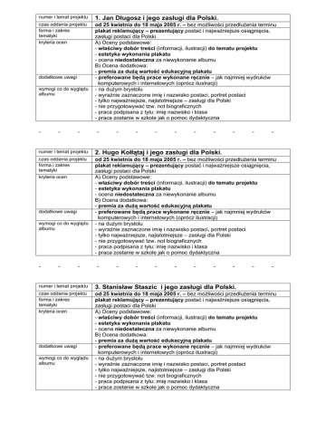 numer i temat projektu 1. Jan Długosz i jego zasługi dla Polski. czas oddania projektu forma i zakres tematyki kryteria ocen od 25 kwietnia do 18 maja 2005 r. – bez możliwości przedłużenia terminu plakat reklamujący – prezentujący postać i najważniejsze osiągnięcia, zasługi postaci dla Polski A) Oceny podstawowe: - właściwy dobór treści (informacji, ilustracji) do tematu projektu - estetyka wykonania plakatu - ocena niedostateczna za niewykonanie albumu B) Ocena dodatkowa: - premia za dużą wartość edukacyjną plakatu - preferowane będą prace wykonane ręcznie – jak najmniej wydruków komputerowych i internetowych (oprócz ilustracji) - na dużym brystolu - wyraźnie zaznaczone imię i nazwisko postaci, portret postaci - tylko najważniejsze, najistotniejsze – zasługi dla Polski - nie przygotowywać tzw. not biograficznych - praca podpisana z tyłu: imię nazwisko i klasa - praca zostanie w szkole jak o pomoc dydaktyczna dodatkowe uwagi wymogi co do wyglądu albumu - - - - - - - - - - - - - numer i temat projektu 2. Hugo Kołłątaj i jego zasługi dla Polski. czas oddania projektu forma i zakres tematyki kryteria ocen od 25 kwietnia do 18 maja 2005 r. – bez możliwości przedłużenia terminu plakat reklamujący – prezentujący postać i najważniejsze osiągnięcia, zasługi postaci dla Polski A) Oceny podstawowe: - właściwy dobór treści (informacji, ilustracji) do tematu projektu - estetyka wykonania plakatu - ocena niedostateczna za niewykonanie albumu B) Ocena dodatkowa: - premia za dużą wartość edukacyjną plakatu - preferowane będą prace wykonane ręcznie – jak najmniej wydruków komputerowych i internetowych (oprócz ilustracji) - na dużym brystolu - wyraźnie zaznaczone imię i nazwisko postaci, portret postaci - tylko najważniejsze, najistotniejsze – zasługi dla Polski - nie przygotowywać tzw. not biograficznych - praca podpisana z tyłu: imię nazwisko i klasa - praca zostanie w szkole jak o pomoc dydaktyczna dodatkowe uwagi wymogi co do wyglądu albumu - - - - - - - - - - - - - numer i temat projektu 3. Stanisław Staszic i jego zasługi dla Polski. czas oddania projektu forma i zakres tematyki kryteria ocen od 25 kwietnia do 18 maja 2005 r. – bez możliwości przedłużenia terminu plakat reklamujący – prezentujący postać i najważniejsze osiągnięcia, zasługi postaci dla Polski A) Oceny podstawowe: - właściwy dobór treści (informacji, ilustracji) do tematu projektu - estetyka wykonania plakatu - ocena niedostateczna za niewykonanie albumu B) Ocena dodatkowa: - premia za dużą wartość edukacyjną plakatu - preferowane będą prace wykonane ręcznie – jak najmniej wydruków komputerowych i internetowych (oprócz ilustracji) - na dużym brystolu - wyraźnie zaznaczone imię i nazwisko postaci, portret postaci - tylko najważniejsze, najistotniejsze – zasługi dla Polski - nie przygotowywać tzw. not biograficznych - praca podpisana z tyłu: imię nazwisko i klasa - praca zostanie w szkole jak o pomoc dydaktyczna dodatkowe uwagi wymogi co do wyglądu albumu numer i temat projektu 4. Eugeniusz Kwiatkowski i jego zasługi dla Polski. czas oddania projektu forma i zakres tematyki kryteria ocen od 25 kwietnia do 18 maja 2005 r. – bez możliwości przedłużenia terminu plakat reklamujący – prezentujący postać i najważniejsze osiągnięcia, zasługi postaci dla Polski A) Oceny podstawowe: - właściwy dobór treści (informacji, ilustracji) do tematu projektu - estetyka wykonania plakatu - ocena niedostateczna za niewykonanie albumu B) Ocena dodatkowa: - premia za dużą wartość edukacyjną plakatu - preferowane będą prace wykonane ręcznie – jak najmniej wydruków komputerowych i internetowych (oprócz ilustracji) - na dużym brystolu - wyraźnie zaznaczone imię i nazwisko postaci, portret postaci - tylko najważniejsze, najistotniejsze – zasługi dla Polski - nie przygotowywać tzw. not biograficznych - praca podpisana z tyłu: imię nazwisko i klasa - praca zostanie w szkole jak o pomoc dydaktyczna dodatkowe uwagi wymogi co do wyglądu albumu - - - - - - - - - - - - - numer i temat projektu 5. Stanisław Małachowski i jego zasługi dla Polski. czas oddania projektu forma i zakres tematyki kryteria ocen od 25 kwietnia do 18 maja 2005 r. – bez możliwości przedłużenia terminu plakat reklamujący – prezentujący postać i najważniejsze osiągnięcia, zasługi postaci dla Polski A) Oceny podstawowe: - właściwy dobór treści (informacji, ilustracji) do tematu projektu - estetyka wykonania plakatu - ocena niedostateczna za niewykonanie albumu B) Ocena dodatkowa: - premia za dużą wartość edukacyjną plakatu - preferowane będą prace wykonane ręcznie – jak najmniej wydruków komputerowych i internetowych (oprócz ilustracji) - na dużym brystolu - wyraźnie zaznaczone imię i nazwisko postaci, portret postaci - tylko najważniejsze, najistotniejsze – zasługi dla Polski - nie przygotowywać tzw. not biograficznych - praca podpisana z tyłu: imię nazwisko i klasa - praca zostanie w szkole jak o pomoc dydaktyczna dodatkowe uwagi wymogi co do wyglądu albumu - - - - - - - - - - - - - numer i temat projektu 6. Ignacy Krasicki i jego zasługi dla Polski. czas oddania projektu forma i zakres tematyki kryteria ocen od 25 kwietnia do 18 maja 2005 r. – bez możliwości przedłużenia terminu plakat reklamujący – prezentujący postać i najważniejsze osiągnięcia, zasługi postaci dla Polski A) Oceny podstawowe: - właściwy dobór treści (informacji, ilustracji) do tematu projektu - estetyka wykonania plakatu - ocena niedostateczna za niewykonanie albumu B) Ocena dodatkowa: - premia za dużą wartość edukacyjną plakatu - preferowane będą prace wykonane ręcznie – jak najmniej wydruków komputerowych i internetowych (oprócz ilustracji) - na dużym brystolu - wyraźnie zaznaczone imię i nazwisko postaci, portret postaci - tylko najważniejsze, najistotniejsze – zasług