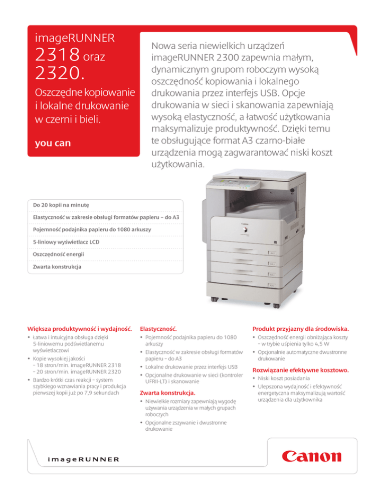 imageRUNNER Nowa seria niewielkich urządzeń imageRUNNER 2300 zapewnia małym, dynamicznym grupom roboczym wysoką oszczędność kopiowania i lokalnego drukowania przez interfejs USB. Opcje drukowania w sieci i skanowania zapewniają wysoką elastyczność, a łatwość użytkowania maksymalizuje produktywność. Dzięki temu te obsługujące format A3 czarno-białe urządzenia mogą zagwarantować niski koszt użytkowania. 2318 oraz 2320. Oszczędne kopiowanie i lokalne drukowanie w czerni i bieli. you can Do 20 kopii na minutę Elastyczność w zakresie obsługi formatów papieru – do A3 Pojemność podajnika papieru do 1080 arkuszy 5-liniowy wyświetlacz LCD Oszczędność energii Zwarta konstrukcja Większa produktywność i wydajność. • Łatwa i intuicyjna obsługa dzięki 5-liniowemu podświetlanemu wyświetlaczowi • Kopie wysokiej jakości – 18 stron/min. imageRUNNER 2318 – 20 stron/min. imageRUNNER 2320 • Bardzo krótki czas reakcji – system szybkiego wznawiania pracy i produkcja pierwszej kopii już po 7,9 sekundach Elastyczność. • Pojemność podajnika papieru do 1080 arkuszy Produkt przyjazny dla środowiska. • Oszczędność energii obniżająca koszty – w trybie uśpienia tylko 4,5 W • Elastyczność w zakresie obsługi formatów • Opcjonalnie automatyczne dwustronne • Lokalne drukowanie przez interfejs USB • Opcjonalne drukowanie w sieci (kontroler Rozwiązanie efektywne kosztowo. papieru – do A3 UFRII-LT) i skanowanie Zwarta konstrukcja. • Niewielkie rozmiary zapewniają wygodę używania urządzenia w małych grupach roboczych • Opcjonalne zszywanie i dwustronne drukowanie drukowanie • Niski koszt posiadania • Ulepszona wydajność i efektywność energetyczna maksymalizują wartość urządzenia dla użytkownika Specyfikacja: imageRUNNER 2318 oraz 2320 Typ Biurkowa lub wolnostojąca Maksymalny rozmiar A3, 297 x 432mm oryginału Rozmiar kopii Kaseta: A5 do A3 Podajnik ręczny: A5R do A3, koperty Rozdzielczość Kopiowanie: 600 dpi x 600 dpi Drukowanie: 600 dpi x 600 dpi (UFRII-LT) 256 odcieni Szybkość kopiowania / drukowania A4 imageRUNNER 2320: 20 kopii na min, imageRUNNER 2318: 18 kopii na min. A3 imageRUNNER 2320: 10 kopii na min, imageRUNNER 2318: 10 kopii na min. Powiększenie Zoom: 25-400% Stałe: 50%,70%,100%,141%, 200%, kopiowanie dowodów tożsamości Czas uzyskania pierwszej kopii 7,9 sekund Czas nagrzewania Około 13 sekund Wielokrotne kopie/ wydruki 1 do 99 arkuszy Drukowanie dwustronne Opcjonalne automatyczne bezstosowe Gramatura papieru Kaseta: 64 do 90 g/m2 Podajnik ręczny: 64 do 128 g/m2 Drukowanie dwustronne: 64 do 90 g/m2 Kaseta Uniwersalna: A5 do A3 Pojemność podajnika Standardowa: 250 arkuszy x 1 kaseta (80 g/m2) Podajnik ręczny: 80 arkuszy (80 g/m2) dla A5R do A4, 50 arkuszy dla A3 (80 g/m2) Opcjonalnie: 250 arkuszy x 3 kasety (750 arkuszy) Całkowita pojemność podajników papieru: 1080 arkuszy Procesor Canon Custom Processor, 150MHz Pamięć 64 MB (współużytkowana) Interfejs USB 2.0, opcjonalnie Ethernet (100Base-TX / 10Base-T) Zasilanie 220V AC do 240V AC ±10% (50 / 60Hz) Pobór mocy Maksymalnie 1,55kW Wymiary (szer./dł./wys.) 622 x 638 x 580,4mm Waga Około 39,6kg Specyfikacja drukowania PDL UFRII-LT (drukowanie lokalne za pośrednictwem złącza USB, drukowanie sieciowe wymaga opcjonalnego adaptera NW IF – IN-E14) Rozdzielczość 600dpi x 600dpi Pamięć Standardowo 64MB (współużytkowana) Procesor Canon Custom Processor 150MHz (współużytkowany) Obsługiwane systemy operacyjne UFRII-LT: Windows 2000 / XP / Vista / Server 2003 / Server 2008 / Windows 7 / Mac OS X 10.4 lub nowszy Interfejs USB 2.0, opcjonalnie Ethernet (100Base-TX / 10Base-T) TCP/IP (LPD, HTTP), obsługa protokołu IPv4 / IPv6 Specyfikacja skanowania Pull Scan (skanowanie z komputera) Wymaga opcjonalnego adaptera NW – IN-E14 Sieciowy sterownik TWAIN (tryb czarno-biały/kolorowy: 75 / 100 / 150 / 200 / 300 dpi) DADF-P2 (Standardowo korpus główny wyposażony jest w pokrywę dociskową) Rozmiar papieru A3 do A5R Gramatura papieru 37 g/m2 do 128 g/m2, druk dwustronny: tylko 52 g/m2 do 105 g/m2 Maks. liczba oryginałów A5R do A4: 50 arkuszy (80 g/m2) A3: 25 arkuszy (80 g/m2) Skanowanie dokumentu Szybkość skanowania (maks.) Kopiowanie Wymiary (szer./dł./wys.) Waga Kasetowy moduł podawania J1/K1 (w przypadku K1 wymagany zasilacz Q1) Typ Gramatura papieru Pojemność podajnika A4 20 obrazów na minutę 565 x 489,4 x 122mm Około 7,0kg Regulowane szuflady ładowane od przodu 64 do 90 g/m2 J1: 250 arkuszy (80 g/m2) x 1 kaseta K1: 250 arkuszy (80 g/m2) x 2 kasety J1 i K1: 250 arkuszy (80 g/m2) x 3 kasety Wymiary (szer./dł./wys.) J1: 580,3 x 569,3 x 116,8mm K1: 580,3 x 569,3 x 201,8mm Waga J1: Około 6,0kg K1: Około 12,0kg Finisher U2 (wymagany zasilacz Q1) Liczba tac Jeden podajnik + podajnik opcjonalny (wewnętrzny) Pojemność tacy Standardowo A4 / A5 / A5R: 770 arkuszy lub 100mm A4R / A3: 380 arkuszy lub 50mm Z tacą dostępną w opcji Tray A: A4 / A5 / A5R 200 arkuszy, A4R / A3: 150 arkuszy Tray B: A4 / A5 / A5R 200 arkuszy, A4R / A3: 150 arkuszy Pozycja zszywania W rogu Wydajność zszywacza A4: 50 arkuszy A3 / A4R: 30 arkuszy Waga Około 10,0kg Taca Inner 2-Way E2 (wymagany zasilacz Q1) Pojemność tacy Tray A: A4 100 arkuszy, A3 50 arkuszy Tray B: A4 250 arkuszy, A3 100 arkuszy Waga Około 1,5kg Inne akcesoria Moduł druku dwustronnego A1: umożliwia drukowanie dwustronne. Wymagany zasilacz Q1. Adapter NW IF – IN-E14: umożliwia drukowanie i skanowanie sieciowe. Kaseta FL -AC1: zapasowy podajnik na 250 arkuszy dla wszystkich kaset. Podstawa wysoka dla modelu iR2016/20: zwiększa wysokość urządzenia na potrzeby kombinacji urządzenia imageRUNNER 2318/2320 wyłącznie z kasetowym modułem podajnika papieru J1. Podstawa niska dla modelu iR2016/20: zwiększa wysokość urządzenia na potrzeby kombinacji urządzenia imageRUNNER 2318/2320 z kasetowym modułem podajnika papieru J1+K1. Dodatkowy podajnik modułu wyk
