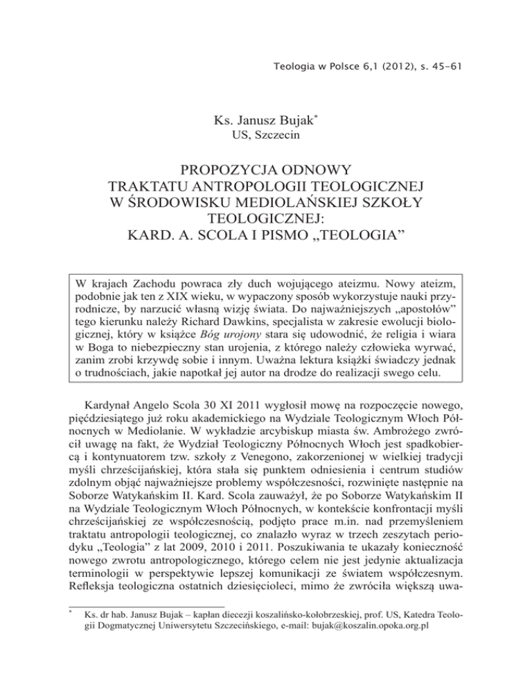 Teologia w Polsce 6,1 (2012), s. 45-61 Ks. Janusz Bujak* US, Szczecin PROPOZYCJA ODNOWY TRAKTATU ANTROPOLOGII TEOLOGICZNEJ W ŚRODOWISKU MEDIOLAŃSKIEJ SZKOŁY TEOLOGICZNEJ: KARD. A. SCOLA I PISMO „TEOLOGIA” W krajach Zachodu powraca zły duch wojującego ateizmu. Nowy ateizm, podobnie jak ten z XIX wieku, w wypaczony sposób wykorzystuje nauki przyrodnicze, by narzucić własną wizję świata. Do najważniejszych „apostołów” tego kierunku należy Richard Dawkins, specjalista w zakresie ewolucji biologicznej, który w książce Bóg urojony stara się udowodnić, że religia i wiara w Boga to niebezpieczny stan urojenia, z którego należy człowieka wyrwać, zanim zrobi krzywdę sobie i innym. Uważna lektura książki świadczy jednak o trudnościach, jakie napotkał jej autor na drodze do realizacji swego celu. Kardynał Angelo Scola 30 XI 2011 wygłosił mowę na rozpoczęcie nowego, pięćdziesiątego już roku akademickiego na Wydziale Teologicznym Włoch Północnych w Mediolanie. W wykładzie arcybiskup miasta św. Ambrożego zwrócił uwagę na fakt, że Wydział Teologiczny Północnych Włoch jest spadkobiercą i kontynuatorem tzw. szkoły z Venegono, zakorzenionej w wielkiej tradycji myśli chrześcijańskiej, która stała się punktem odniesienia i centrum studiów zdolnym objąć najważniejsze problemy współczesności, rozwinięte następnie na Soborze Watykańskim II. Kard. Scola zauważył, że po Soborze Watykańskim II na Wydziale Teologicznym Włoch Północnych, w kontekście konfrontacji myśli chrześcijańskiej ze współczesnością, podjęto prace m.in. nad przemyśleniem traktatu antropologii teologicznej, co znalazło wyraz w trzech zeszytach periodyku „Teologia” z lat 2009, 2010 i 2011. Poszukiwania te ukazały konieczność nowego zwrotu antropologicznego, którego celem nie jest jedynie aktualizacja terminologii w perspektywie lepszej komunikacji ze światem współczesnym. Refleksja teologiczna ostatnich dziesięcioleci, mimo że zwróciła większą uwa* Ks. dr hab. Janusz Bujak – kapłan diecezji koszalińsko-kołobrzeskiej, prof. US, Katedra Teologii Dogmatycznej Uniwersytetu Szczecińskiego, e-mail: [email protected] Ks. Janusz Bujak gę na kwestię antropologiczną, nie zawsze potrafiła ukazać wyjątkowość Jezusa Chrystusa, który jest kluczem antropologii teologicznej. W tej perspektywie idea przemyślenia traktatu z zakresu antropologii teologicznej łączy się z przekonaniem, że antropologia adekwatna będzie zawsze „antropologią dramatyczną”, podkreślił kard. Angelo Scola1. Temat antropologii dramatycznej i konieczności przemyślenia na nowo struktury traktatu antropologii teologicznej został podjęty przez uczestników XX Kongresu Stowarzyszenia Teologów Włoskich w 2007 roku, którego temat brzmiał Tożsamość i jej miejsca. Doświadczenie chrześcijańskie stawania się człowiekiem. Kongres otworzył bp F.G. Brambilla wykładem Tożsamość przejściowa. O antropologii dramatycznej. Brambilla skrytykował obecne w teologii okresu modernizmu rozdzielenie myślenia o człowieku od myślenia o Bogu. Według tego modelu, zakorzenionego w „antropologii (duchowych) władz człowieka” (antropologia delle facoltà, czyli rozumu, woli, pożądania), władzą, która pozwala poznać człowieka, jest rozum, wiara zaś pozwala poznać Boga. Takie spojrzenie jest jednak nie do pogodzenia z antropologią biblijną, dla której pytanie o człowieka jest możliwe jedynie jako odpowiedź na wezwanie, obietnicę, powołanie, wzbudzone w sercu człowieka przez Boga: człowiek istnieje, ponieważ jest wezwany. Poznanie człowieka jest możliwe tylko wtedy, gdy uznamy jego tożsamość za „przejściową i dramatyczną”. Jest to tożsamość przejściowa, ponieważ jest świadoma, że otrzymała siebie samą w darze (i nie jest całkowicie autonomiczna); dramatyczna, ponieważ „ja” uświadamia sobie siebie nie tylko dzięki relacji z innymi (i Innym), ale także dzięki działaniu, dzięki zgodzeniu się na obietnicę, która otwiera na relację z innymi. To zgoda jest ostatecznie aktem wiary2. Antropologia dramatyczna według kard. Angelo Scoli Nowe spojrzenie na antropologię teologiczną, całkowicie chrystocentryczne, kard. Scola przedstawił w traktacie antropologii teologicznej Persona umana. Antropologia teologica, wydanym w Poznaniu w roku 2005 pod tytułem Osoba ludzka. Antropologia teologiczna. Jak podkreśla autor książki, inspiracją była dla niego antropologia dramatyczna H.U. von Balthasara3. Por. Per un’antropologia drammatica. Lectio magistralis del cardinale Angelo Scola, tenuta il 30 novembre scorso a Milano, http://www.zenit.org/article-28875?l=italian [data odczytu: 5 I 2012]; L’Osservatore Romano [edycja włoska] 1 grudnia 2011: Anche il teologo di professione ha bisogno della parrocchia, s. 4. 2 Por. http://teologia.it/index.php?option=com_content&view=article&id=177:comunicato-xx-congresso-2&catid=4:congressi-nazionali [data odczytu: 5 I 2012]. 3 O wpływie szwajcarskiego teologa na myśl kard. A. Scoli możemy przeczytać w recenzji przygotowanej z okazji nadania kard. Scoli doktoratu honoris causa przez Katolicki Uniwersy1 46 TwP 6,1 (2012) Propozycja odnowy traktatu antropologii teologicznej Scola podkreśla, że antropologia teologiczna musi opierać się na fundamencie, którym jest osoba Jezusa Chrystusa, ponieważ w Nim „prawda relacji pomiędzy Bogiem a człowiekiem zyskuje swoją konkretną formę historyczną w postaci Jezusa Chrystusa”4. W Chrystusie mamy wyjaśnienie dramatu ludzkiej wolności, ponieważ od momentu objawienia się Chrystusa i Jego posłuszeństwa „wolność ludzka jawi się jako zawarta bezpośrednio w objawieniu prawdy transcendentalnej”. Wolność dotyczy różnicy, jaką odczuwa człowiek w sobie, pomiędzy wolnością, jaka jest, a jaka powinna być. Wypełnienie ludzkiej wolności dokonuje się w Jezusie Chrystusie5. Kard. Scola odwołuje się 