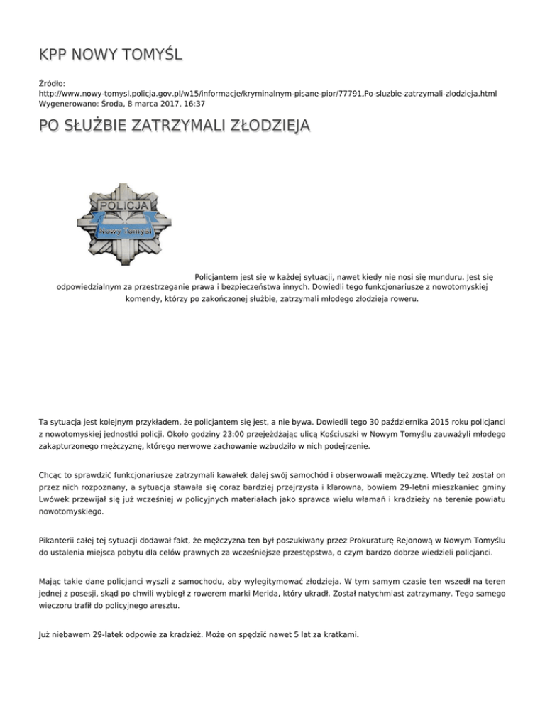 KPP NOWY TOMYŚL Źródło: http://www.nowy-tomysl.policja.gov.pl/w15/informacje/kryminalnym-pisane-pior/77791,Po-sluzbie-zatrzymali-zlodzieja.html Wygenerowano: Środa, 8 marca 2017, 16:37 PO SŁUŻBIE ZATRZYMALI ZŁODZIEJA Policjantem jest się w każdej sytuacji, nawet kiedy nie nosi się munduru. Jest się odpowiedzialnym za przestrzeganie prawa i bezpieczeństwa innych. Dowiedli tego funkcjonariusze z nowotomyskiej komendy, którzy po zakończonej służbie, zatrzymali młodego złodzieja roweru. Ta sytuacja jest kolejnym przykładem, że policjantem się jest, a nie bywa. Dowiedli tego 30 października 2015 roku policjanci z nowotomyskiej jednostki policji. Około godziny 23:00 przejeżdżając ulicą Kościuszki w Nowym Tomyślu zauważyli młodego zakapturzonego mężczyznę, którego nerwowe zachowanie wzbudziło w nich podejrzenie. Chcąc to sprawdzić funkcjonariusze zatrzymali kawałek dalej swój samochód i obserwowali mężczyznę. Wtedy też został on przez nich rozpoznany, a sytuacja stawała się coraz bardziej przejrzysta i klarowna, bowiem 29-letni mieszkaniec gminy Lwówek przewijał się już wcześniej w policyjnych materiałach jako sprawca wielu włamań i kradzieży na terenie powiatu nowotomyskiego. Pikanterii całej tej sytuacji dodawał fakt, że mężczyzna ten był poszukiwany przez Prokuraturę Rejonową w Nowym Tomyślu do ustalenia miejsca pobytu dla celów prawnych za wcześniejsze przestępstwa, o czym bardzo dobrze wiedzieli policjanci. Mając takie dane policjanci wyszli z samochodu, aby wylegitymować złodzieja. W tym samym czasie ten wszedł na teren jednej z posesji, skąd po chwili wybiegł z rowerem marki Merida, który ukradł. Został natychmiast zatrzymany. Tego samego wieczoru trafił do policyjnego aresztu. Już niebawem 29-latek odpowie za kradzież. Może on spędzić nawet 5 lat za kratkami. Ocena: 0/5 (0) Tweetnij