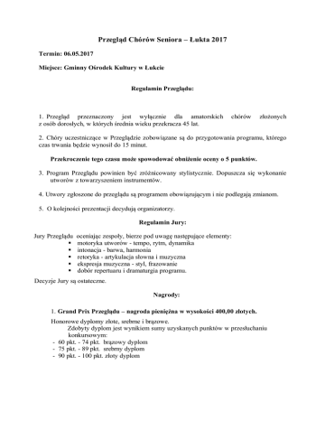 Przegląd Chórów Seniora – Łukta 2017 Termin: 06.05.2017 Miejsce: Gminny Ośrodek Kultury w Łukcie Regulamin Przeglądu: 1. Przegląd przeznaczony jest wyłącznie dla amatorskich z osób dorosłych, w których średnia wieku przekracza 45 lat. chórów złożonych 2. Chóry uczestniczące w Przeglądzie zobowiązane są do przygotowania programu, którego czas trwania będzie wynosił do 15 minut. Przekroczenie tego czasu może spowodować obniżenie oceny o 5 punktów. 3. Program Przeglądu powinien być zróżnicowany stylistycznie. Dopuszcza się wykonanie utworów z towarzyszeniem instrumentów. 4. Utwory zgłoszone do przeglądu są programem obowiązującym i nie podlegają zmianom. 5. O kolejności prezentacji decydują organizatorzy. Regulamin Jury: Jury Przeglądu oceniając zespoły, bierze pod uwagę następujące elementy: motoryka utworów - tempo, rytm, dynamika intonacja - barwa, harmonia retoryka - artykulacja słowna i muzyczna ekspresja muzyczna - styl, frazowanie dobór repertuaru i dramaturgia programu. Decyzje Jury są ostateczne. Nagrody: 1. Grand Prix Przeglądu – nagroda pieniężna w wysokości 400,00 złotych. Honorowe dyplomy złote, srebrne i brązowe. Zdobyty dyplom jest wynikiem sumy uzyskanych punktów w przesłuchaniu konkursowym: - 60 pkt. - 74 pkt. brązowy dyplom - 75 pkt. - 89 pkt. srebrny dyplom - 90 pkt. - 100 pkt. złoty dyplom 2. W porozumieniu z organizatorem Przeglądu Jury może dokonać innego podziału nagród i wprowadzić nagrody dodatkowe. Werdykt Jury jest ostateczny Organizacja Przeglądu Chórów Seniora: Przegląd odbędzie się w dniu 06.05.2017 r. w Gminnym Ośrodku Kultury w Łukcie, Chóry, które chcą wziąć udział w Przeglądzie winne przesłać czytelnie wypełnioną kartę zgłoszenia i materiały dodatkowe. Powyższe dokumenty należy przysłać do 31 marca 2017 roku. 1. Decyzję o zakwalifikowaniu zespołu Artystyczna do 3 kwietnia 2016 r. do Przeglądu podejmuje Rada 2. Lista chórów zakwalifikowanych do Przeglądu Chórów Seniora będzie ogłoszona na stronie internetowej Festiwalu. 3. Przegląd rozpocznie się 6 maja 2017 roku, o godzinie 16.00 w Gminnym Ośrodku Kultury w Łukcie. Po prezentacji zespołów, zostanie odczytany werdykt Jury i wręczenie nagród i dyplomów. 4. Chóry uczestniczące w przeglądzie mogą wziąć udział w imprezie integracyjnej (ognisko nad jeziorem). Koszt – 35 złotych od uczestnika. (kwota musi być wpłacona na konto Gminnego Ośrodka Kultury w Łukcie, najpóźniej do 21 kwietnia 2017 roku. 5. Zgłoszenie chóru do Przeglądu jest jednoznaczne z wyrażeniem zgody na nieodpłatne prawo rejestracji artystycznego wykonania utworów dowolną techniką zapisu i jego rozpowszechniania oraz na wykorzystanie nadesłanych materiałów chóru do promocji Przeglądu. 6. W porozumieniu z organizatorem Przeglądu Jury może dokonać innego podziału nagród i wprowadzić nagrody dodatkowe. Werdykt Jury jest ostateczny. Informacje i adres kontaktowy: adres kontaktowy: Gminny Ośrodek Kultury w Łukcie Kościelna 2B, 14-105 Łukta tel.: +48 89 646 64 64 adres e-mail: [email protected] adres internetowy: www.goklukta.pl (zakładka turniej chórów) szczegółowych informacji o Festiwalu udziela: Daniel Kaczmarczik – dyrektor artystyczny (tel. 506 149 441) Postanowienia końcowe: 1. Organizatorzy nie ponoszą odpowiedzialności za nielegalne wykonywanie muzyki (prawa autorskie) i związane z tym działania prawne. 2. Organizator zastrzega sobie ewentualną zmianę szczegółów regulaminu. 3. Wszystkie kwestie nie ujęte w regulaminie rozstrzyga organizator. 4. Zgłoszenie do udziału w Przeglądzie jest równoznaczne z akceptacją niniejszego regulaminu