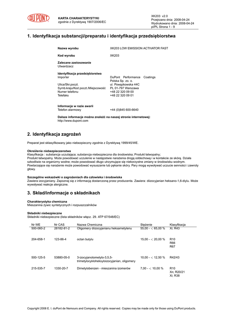 XK203 v2.0 Przejrzano dnia: 2008-04-24 Wydrukowano dnia: 2008-04-24 pl/PL Strona 1 - 9 KARTA CHARAKTERYSTYKI zgodnie z Dyrektywa˛ 1907/2006/EC 1. Identyfikacja substancji/preparatu i identyfikacja przedsiebiorstwa ˛ Nazwa wyrobu XK203 LOW EMISSION ACTIVATOR FAST Kod wyrobu XK203 Zalecane zastosowanie Utwardzacz Identyfikacja przedsiebiorstwa ˛ Importer Ulica/Skr.poczt. Symb.kraju/Kod poczt./Miejscowość Numer telefonu Telefaks DuPont Performance Polska Sp. zo. o. ul. Powazkowska ˛ 44C PL 01-797 Warszawa +48 22 320 09 00 +48 22 320 09 01 Informacje w razie awarii Telefon alarmowy +44 (0)845 600-6640 Coatings Dalsze informacje można znaleźć na naszej stronie internetowej: http://www.dupont.com 2. Identyfikacja zagrożeń Preparat jest sklasyfikowany jako niebezpieczny zgodnie z Dyrektywa˛ 1999/45/WE. Określenie niebezpieczenstwa Klasyfikacja : substancja uczulajaca; ˛ substancja niebezpieczna dla środowiska; Produkt łatwopalny; Produkt łatwopalny. Może powodować uczulenie w nastepstwie ˛ narażenia droga˛ oddechowa˛ i w kontakcie ze skóra. ˛ Działa szkodliwie na organizmy wodne; może powodować długo utrzymujace ˛ sie˛ niekorzystne zmiany w środowisku wodnym. Powtarzajace ˛ sie˛ narażenie może powodować wysuszanie lub pekanie ˛ skóry. Pary moga˛ wywoływać uczucie senności i zawroty głowy. Szczególne wskazówki o zagrożeniach dla człowieka i środowiska Zawiera izocyjaniany. Zapoznaj sie˛ z informacja˛ dostarczona˛ przez producenta. Zawiera: diizocyjanian heksano-1,6-diylu. Może wywoływać reakcje alergiczne. 3. Skład/informacje o składnikach Charakterystyka chemiczna Mieszanina żywic syntetycznych i rozpuszczalników Składniki niebezpieczne Składniki niebezpieczne (lista składników włacz. ˛ 29. ATP 67/548/EC) Nr WE 500-060-2 Nr CAS 28182-81-2 Nazwa Chemiczna Oligomery diizocyjanianu heksametylenu Steżenie ˛ 55,00 - < 65,00 % Klasyfikacja Xi; R43 204-658-1 123-86-4 octan butylu 15,00 - < 20,00 % R10 R66 R67 500-125-5 53880-05-0 3-izocyjanotometylo-3,5,5trimetylocykloheksyloizocyjanian, oligomery 10,00 - < 12,50 % R42/43 215-535-7 1330-20-7 Dimetylobenzen - mieszanina izomerów 7,00 - < 10,00 % R10 Xn; R20/21 Xi; R38 Copyright 2008 E. I. duPont de Nemours and Company. All rights reserved. Copies may be made only for those using DuPont products. KARTA CHARAKTERYSTYKI zgodnie z Dyrektywa˛ 1907/2006/EC XK203 v2.0 Przejrzano dnia: 2008-04-24 Wydrukowano dnia: 2008-04-24 pl/PL Strona 2 - 9 Nr WE 265-199-0 Nr CAS 64742-95-6 Nazwa Chemiczna Solwent nafta (ropa naftowa), weglowodory lekkie aromatyczne (< 0,1% benzene) Steżenie ˛ 3,00 - < 5,00 % Klasyfikacja R10 Xi; R37 N; R51/53 Xn; R65 R66 R67 NotaH NotaP 202-849-4 100-41-4 etylobenzen 1,00 - < 2,00 % F; R11 Xn; R20 212-485-8 822-06-0 diizocyjanian heksano-1,6-diylu 0,10 - < 0,20 % R42/43 Xi; R36/37/38 T; R23 Porady dodatkowe Teksty zdań R patrz rozdział 16. 4. Pierwsza pomoc Porady ogólne W przypadku utrzymujacych ˛ sie˛ objawów lub jakichkolwiek watpliwości ˛ zasiegn ˛ ać ˛ porady medycznej. Nigdy nie podawać niczego doustnie osobie nieprzytomnej. Wdychanie Unikać wdychania par lub mgieł. Przenieść na świeże powietrze w przypadku wdychania oparów. W przypadku nieregularnego lub zatrzymanego oddechu zastosować sztuczne oddychanie. Osobie nieprzytomnej zapewnić wygodna˛ pozycje˛ i zasiegn ˛ ać ˛ porady medycznej. Jeśli objawy utrzymuja˛ sie, ˛ wezwać lekarza. Kontakt przez skóre˛ Nie należy stosować rozpuszczalników lub rozrzedzaczy! Natychmiast zdjać ˛ skażone ubranie. Zmyć starannie skóre˛ woda˛ z mydłem lub zastosować znane środki zmywajace. ˛ Jeśli utrzymuja˛ sie˛ podrażnienia skóry, wezwać lekarza. Kontakt z oczami Usunać ˛ szkła (szkło) kontaktowe. Przepłukiwać otwarte oczy obficie czysta, ˛ świeża˛ woda˛ przynajmniej przez 10 minut. Zasiegn ˛ ać ˛ porady medycznej. Połkniecie ˛ W razie spożycia, natychmiast zasiegn ˛ ać ˛ porady lekarza i pokazać opakowanie lub etykiete. ˛ NIE prowokować wymiotów. Pozostawić. 5. Postepowanie ˛ w przypadku pożaru Niebezpieczne produkty spalania Ogień wytwarza gesty, ˛ czarny dym zawierajacy ˛ niebezpieczne produkty spalania (zobacz dział 10). Narażenie na działanie produktów rozkładu może zagrażać zdrowiu. Zagrożenia pożarem i wybuchem Materiał ciekły, zapalny. Pary moga˛ tworzyć z powietrzem mieszaniny wybuchowe. Usunać ˛ źródła zapłonu. Stosownych środków gaśniczych Uniwersalna piana tworzaca ˛ film wodny, Dwutlenek wegla ˛ (CO2), Suche proszki gaśnicze, Aerozol wodny. Srodków gaśniczych, które nie sa˛ używane ze wzgledów ˛ bezpieczeństwa Silny strumień wody Specjalne wyposażenie ochronne i procedury ratowniczo-gaśnicze Nosić zgodnie z przeznaczeniem: Zapewniajacy ˛ całkowita˛ ochrone˛ strój ognioodporny. W razie konieczności w trakcie akcji gaśniczej założyć aparat oddechowy z zamknietym ˛ obiegiem. W przypadku pożaru, chłodzić pojemniki rozproszonym strumieniem wodnym. Nie dopuścić do przedostania sie˛ wody z gaszenia pożaru do sieci wodnej lub kanalizacji. Porady dodatkowe Chłodzić zamkniete ˛ zbiorniki narażone na ogień poprzez zraszanie woda. ˛ Copyright 2008 E. I. duPont de Nemours and Company. All rights reserved. Copies may be made only for those using DuPont products. KARTA CHARAKTERYSTYKI zgodnie z Dyrektywa˛ 1907/2006/EC XK203 v2.0 Przejrzano dnia: 2008-04-24 Wydrukowano dnia: 2008-04-24 pl/PL Strona 3 - 9 6. Postepowanie ˛ w przypadku niezamierzonego uwolnienia do środowiska Indywidualnych środków ostrożności Przechowywać w dobrze wentylowanym miejscu. Trzymać z dala od źródeł zapłonu. Przestrzegać przepisów bezpieczeństwa (patrz rozdział 7 i 8). Nie wdychać oparów. Środków ostrożności w odniesieniu do środowiska Nie dopuścić do przedostania sie˛ do kanalizacji. W przypadku zanieczyszczenia rzek, jezior lub instalacji kanalizacyjnych należy odpowiednio do obowiazuj 