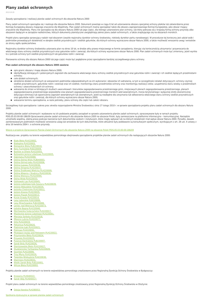 Plany zadań ochronnych 2013-10-29 Zasady sporządzania i realizacji planów zadań ochronnych dla obszarów Natura 2000 Plany zadań ochronnych sporządza się i realizuje dla obszarów Natura 2000. Dokument powstaje w ciągu 6 lat od ustanowienia obszaru specjalnej ochrony ptaków lub zatwierdzenia przez Komisję Europejską obszaru mającego znaczenie dla Wspólnoty. Plan zadań ochronnych można sporządzać także dla obszaru zaproponowanego Komisji Europejskiej, jako obszar mający znaczenie dla Wspólnoty. Planu nie sporządza się dla obszaru Natura 2000 lub jego części, dla którego ustanowiono plan ochrony, lub który pokrywa się z krajową formą ochrony przyrody albo obszarem będącym w zarządzie nadleśnictwa, których dokumenty planistyczne uwzględniają zakres planu zadań ochronnych, a także znajdującego się na obszarach morskich. Projekt planu sporządza sprawujący nadzór nad obszarem (zwykle regionalny dyrektor ochrony środowiska, niekiedy dyrektor parku narodowego). W procedurze tej konieczny jest udział osób i podmiotów prowadzących działalność w obrębie siedlisk przyrodniczych i siedlisk gatunków, dla których ochrony wyznaczono obszar Natura 2000, a także możliwość wnoszenia uwag i wniosków ze strony ogółu społeczeństwa. Regionalny dyrektor ochrony środowiska ustanawia plan na okres 10 lat, w drodze aktu prawa miejscowego w formie zarządzenia, kierując się koniecznością utrzymania i przywracania do właściwego stanu ochrony siedlisk przyrodniczych oraz gatunków roślin i zwierząt, dla których ochrony wyznaczono obszar Natura 2000. Plan zadań ochronnych może być zmieniony, jeżeli wynika to z potrzeb ochrony tych siedlisk przyrodniczych lub gatunków roślin i zwierząt. Planowanie ochrony dla obszaru Natura 2000 lub jego części może być pogłębione przez sporządzenie bardziej szczegółowego planu ochrony. Plan zadań ochronnych dla obszaru Natura 2000 zawiera: opis granic obszaru i mapę obszaru Natura 2000; identyfikację istniejących i potencjalnych zagrożeń dla zachowania właściwego stanu ochrony siedlisk przyrodniczych oraz gatunków roślin i zwierząt i ich siedlisk będących przedmiotami ochrony; cele działań ochronnych; określenie działań ochronnych ze wskazaniem podmiotów odpowiedzialnych za ich wykonanie i obszarów ich wdrażania, w tym w szczególności działań dotyczących: ochrony czynnej siedlisk przyrodniczych, gatunków roślin i zwierząt oraz ich siedlisk; monitoringu stanu przedmiotów ochrony oraz monitoringu realizacji celów; uzupełnienia stanu wiedzy o przedmiotach ochrony i uwarunkowaniach ich ochrony; wskazania do zmian w istniejących studiach uwarunkowań i kierunków zagospodarowania przestrzennego gmin, miejscowych planach zagospodarowania przestrzennego, planach zagospodarowania przestrzennego województw oraz planach zagospodarowania przestrzennego morskich wód wewnętrznych, morza terytorialnego i wyłącznej strefy ekonomicznej dotyczące eliminacji lub ograniczenia zagrożeń wewnętrznych lub zewnętrznych, jeżeli są niezbędne dla utrzymania lub odtworzenia właściwego stanu ochrony siedlisk przyrodniczych oraz gatunków roślin i zwierząt, dla których ochrony wyznaczono obszar Natura 2000; wskazanie terminu sporządzenia, w razie potrzeby, planu ochrony dla części lub całości obszaru. Szczegółowy tryb sporządzania i zakres prac określa rozporządzenie Ministra Środowiska z dnia 17 lutego 2010 r. w sprawie sporządzania projektu planu zadań ochronnych dla obszaru Natura 2000. Projekty planów zadań ochronnych i wydawane na ich podstawie projekty zarządzeń w sprawie ustanowienia planów zadań ochronnych, opracowywane były w ramach projektu POIS.05.03.00-00-186/09 Opracowanie planów zadań ochronnych dla obszarów Natura 2000 na obszarze Polski, były zamieszczane na platformie informacyjno – komunikacyjnej. Narzędzie umożliwiło wspólną, zdalną pracę podczas tworzenia tych dokumentów osobom i instytucjom, które mogły wpływać lub na których działalność miał wpływ obszar Natura 2000. Ponadto, dawało zainteresowanym podmiotom możliwość wniesienia uwag lub wniosków do tych dokumentów, które aktualnie były poddawane są konsultacjom społecznym, wynikającym z art. 28 ust. 4 ustawy z dnia 16 kwietnia 2004 r. o ochronie przyrody. Więcej o projekcie Opracowanie Planów Zadań Ochronnych dla obszarów Natura 2000 na obszarze Polski POIS.05.03.00-00-186/09 Realizacja ww. projektu na terenie województwa pomorskiego obejmowała sporządzenie projektów planów zadań ochronnych dla następujących obszarów Natura 2000: Białe Błoto PLH220002, Białogóra PLH220003, Bielawskie Błota PLB220010, Bory Tucholskie PLB220009, Bunkier w Oliwie PLH220055, Bytowskie Jeziora Lobeliowe PLH220005, Dąbrówka PLH220088, Dolina Dolnej Wisły PLB040003, Dolina Górnej Łeby PLH220006, Dolina Łupawy PLH220036, Dolina Stropnej PLH220037, Dolina Środkowej Wietcisy PLH220009, Dolina Wieprzy i Studnicy PLH220038, Dolina Wierzycy PLH220094, Dolna Wisła PLH220033, Górkowski Las PLH220045, Jeziora Lobeliowe koło Soszycy PLH220039, Jeziora Wdzydzkie PLH220034, Jeziorka Chośnickie PLH220012, Jezioro Krasne PLH220035, Jezioro Piasek PLH220013, Kurze Grzędy PLH220014, Lasy Lęborskie PLB220006, Lasy Mirachowskie PLB220008, Leniec nad Wierzycą PLH220073, Łebskie Bagna PLH220040, Mechowiska Sulęczyńskie PLH220017, Miasteckie Jeziora Lobeliowe PLH220041, Mierzeja Sarbska PLH220018, Młosino Lubnia PLH220077, Orle PLH220019, Pełcznica PLH220020, Piaśnickie Łąki PLH220021, Piotrowo PLH220091, Pływające wyspy pod Rekowem PLH220022, Przymorskie Błota PLH220024, Przywidz PLH220025, Puszcza Darżlubska PLB220007, Sandr Brdy PLH220026, Staniszewskie Błoto PLH220027, Studzienickie Torfowiska PLH220028, Szumleś PLH220086, Trzy Młyny PLH220029, Twierdza Wisłoujście PLH220030, Waćmierz PLH220031, Wielki Sandr Brdy PLB220001, Wilcze Błota PLH