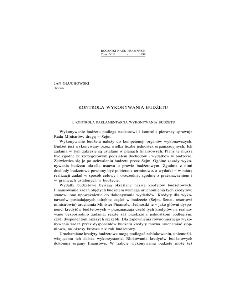 ROCZNIKI NAUK PRAWNYCH Tom VIII − 1998 JAN GŁUCHOWSKI Toruń KONTROLA WYKONYWANIA BUDŻETU 1. KONTROLA PARLAMENTARNA WYKONYWANIA BUDŻETU Wykonywanie budżetu podlega nadzorowi i kontroli; pierwszy sprawuje Rada Ministrów, druga˛ − Sejm. Wykonywanie budżetu należy do kompetencji organów wykonawczych. Budżet jest wykonywany przez wielka˛ liczbe˛ jednostek organizacyjnych. Ich zadania w tym zakresie sa˛ ustalane w planach finansowych. Plany te musza˛ być zgodne ze szczegółowym podziałem dochodów i wydatków w budżecie. Zatwierdza sie˛ je po uchwaleniu budżetu przez Sejm. Ogólne zasady wykonywania budżetu określa ustawa o prawie budżetowym. Zgodnie z nimi dochody budżetowe powinny być pobierane terminowo, a wydatki − w miare˛ realizacji zadań w sposób celowy i oszcze˛dny, zgodnie z przeznaczeniem i w granicach ustalonych w budżecie. Wydatki budżetowe bywaja˛ określane nazwa˛ kredytów budżetowych. Finansowanie zadań obje˛tych budżetem wymaga uruchomienia tych kredytów; stanowi ono upoważnienie do dokonywania wydatków. Kredyty dla wykonawców posiadajacych ˛ odre˛bne cze˛ści w budżecie (Sejm, Senat, resortowi ministrowie) uruchamia Minister Finansów. Jednostki te − jako główni dysponenci kredytów budżetowych − przeznaczaja˛ cze˛ść tych kredytów na realizowane bezpośrednio zadania, reszte˛ zaś przekazuja˛ jednostkom podległym, czyli dysponentom niższych szczebli. Dla zapewnienia równomiernego wykonywania zadań przez dysponentów budżetu kredyty można uruchamiać stopniowo, na okresy krótsze niż rok budżetowy. Uruchamiane kredyty budżetowe moga˛ podlegać zablokowaniu, uniemożliwiajacemu ˛ ich dalsze wykorzystanie. Blokowania kredytów budżetowych dokonuja˛ organy finansowe. W trakcie wykonywania budżetu może też 40 JAN GŁUCHOWSKI wystapić ˛ konieczność przeprowadzenia w nim zmian. Zmianami tymi moga˛ być obje˛te w zasadzie tylko wydatki. Pobieranie dochodów i dokonywanie wydatków budżetowych zwiazane ˛ jest z przyjmowaniem i wypłacaniem środków pienie˛żnych. Te operacje pienie˛żne, zarówno gotówkowe jak i bezgotówkowe, stanowia˛ treść obsługi kasowej budżetu. Obsługe˛ kasowa˛ budżetu sprawuja˛ specjalne organy. Chodzi tu o rozdzielenie podmiotowe dyspozycji pobrania dochodu i dokonania wydatku. Ma to na celu zapewnienie kontroli i zapobiegania nadużyciom. Obsługe˛ kasowa˛ budżetu moga˛ sprawować specjalnie do tego celu powołane jednostki organizacyjne w ramach systemu budżetowego (kasy skarbowe) lub można ja˛ też powierzyć aparatowi bankowemu, co ma miejsce w Polsce. Wykonywanie budżetu jest na bieżaco ˛ rejestrowane. Celowi temu służy rachunkowość budżetowa. Rachunkowość prowadza˛ wszystkie jednostki budżetowe (wykonawcy budżetu) oraz organy kasowej obsługi budżetu. Rachunkowość budżetowa stanowi podstawe˛ do opracowania sprawozdawczości budżetowej. Sprawozdania okresowe stanowia˛ dla organów finansowych państwa podstawe˛ do bieżacej ˛ oceny przebiegu wykonania budżetu. Na podstawie rocznych sprawozdań jednostek budżetowych sprawozdania zbiorcze opracowuja˛ poszczególne resorty. Służa˛ one jako podstawa do sporza˛ dzenia rocznego sprawozdania z wykonania budżetu państwa. Sprawozdanie to sporzadza ˛ resort finansów. Artykuł 39 obowiazuj ˛ acego ˛ prawa budżetowego stanowi, że Rada Ministrów sprawuje ogólny nadzór nad wykonaniem budżetu państwa i może wydawać wytyczne w sprawie realizacji tegoż budżetu. Minister Finansów sprawuje natomiast − zgodnie z treścia˛ ust. 2 tego artykułu − ogólna˛ kontrole˛ realizacji dochodów i wydatków budżetu państwa oraz utrzymania równowagi budżetowej, określanych corocznie ustawa˛ budżetowa. ˛ Nadzór sprawowany jest w stosunku do czynności wykonywanych przez podmioty znajdujace ˛ sie˛ w określonym stosunku zależności funkcjonalnej od organu sprawujacego ˛ nadzór. W tej sytuacji, na gruncie przepisów prawa budżetowego, nadzór ogólny realizowany przez Rade˛ Ministrów nad wykonaniem budżetu państwa oznacza w istocie rzeczy nadzór nad czynnościami wykonywanymi przez organy realizujace ˛ dany budżet. W odróżnieniu od nadzoru ogólnego sprawowanie nadzoru w jego zwykłej postaci stanowi kompetencje˛ organów wykonujacych ˛ budżet, a wie˛c pobierajacych ˛ dochody budżetowe i dokonujacych ˛ wydatków budżetowych. W tej sytuacji niektóre organy wyste˛puja˛ w podwójnej roli, a mianowicie wykonawcy własnego budżetu i nadzorcy innego budżetu. Syntetyczne uje˛cie środków nadzoru, sprawowanego nad wykonaniem budżetu oraz realizacje˛ poszczegól- KONTROLA WYKONYWANIA BUDŻETU 41 nych zadań budżetowych, pozwala stwierdzić, że istnieja˛ środki nadzoru, które swoim zakresem obejmuja˛ zarówno pobieranie dochodów i dokonywanie wydatków budżetowych, jak i środki nadzoru, które odnosza˛ sie˛ wyłacznie ˛ do dokonywania wydatków. Artykuł 146 Konstytucji stanowi, że R a d a M i n i s t r ó w o b ow i a˛ z a n a j e s t p r z e d ł o ż y ć S e j m o w i s p r a w oz d a n i e z w y k o n a n i a b u d ż e t u. Rada Ministrów ma również obowiazek ˛ skierować do Sejmu sprawozdania z wykonania innych, uchwalanych przez Sejm planów finansowych. Z przepisami konstytucyjnymi wiaż ˛ a˛ sie˛ postanowienia prawa budżetowego mówiace ˛ o tym, że wykonanie b u d ż e t u p a ń s t w a p o d l e g a k o n t r o l i S e j m u (art. 204). Kontrola sejmowa ma głównie na celu stwierdzenie, czy przestrzegane sa˛ zasady gospodarki finansowej. Zasady te zostały sprecyzowane w prawie budżetowym. A to ich wykaz: − pełna realizacja zadań budżetowych naste˛puje w terminach określonych przepisami; − realizacja dochodów budżetowych naste˛puje na zasadach i w terminach wynikajacych ˛ z obowiazuj ˛ acych ˛ przepisów; − dokonywanie wydatków budżetowych naste˛puje w granicach kwot określonych w budżec