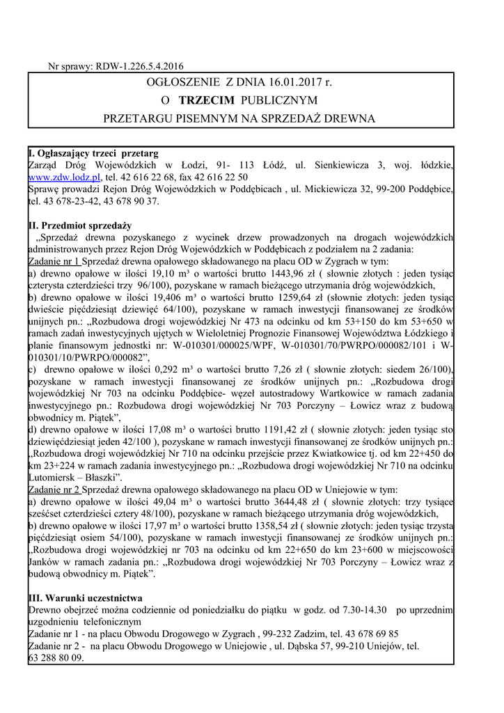 Nr sprawy: RDW-1.226.5.4.2016 OGŁOSZENIE Z DNIA 16.01.2017 r. O TRZECIM PUBLICZNYM PRZETARGU PISEMNYM NA SPRZEDAŻ DREWNA I. Ogłaszający trzeci przetarg Zarząd Dróg Wojewódzkich w Łodzi, 91- 113 Łódź, ul. Sienkiewicza 3, woj. łódzkie, www.zdw.lodz.pl, tel. 42 616 22 68, fax 42 616 22 50 Sprawę prowadzi Rejon Dróg Wojewódzkich w Poddębicach , ul. Mickiewicza 32, 99-200 Poddębice, tel. 43 678-23-42, 43 678 90 37. II. Przedmiot sprzedaży „Sprzedaż drewna pozyskanego z wycinek drzew prowadzonych na drogach wojewódzkich administrowanych przez Rejon Dróg Wojewódzkich w Poddębicach z podziałem na 2 zadania: Zadanie nr 1 Sprzedaż drewna opałowego składowanego na placu OD w Zygrach w tym: a) drewno opałowe w ilości 19,10 m³ o wartości brutto 1443,96 zł ( słownie złotych : jeden tysiąc czterysta czterdzieści trzy 96/100), pozyskane w ramach bieżącego utrzymania dróg wojewódzkich, b) drewno opałowe w ilości 19,406 m³ o wartości brutto 1259,64 zł (słownie złotych: jeden tysiąc dwieście pięćdziesiąt dziewięć 64/100), pozyskane w ramach inwestycji finansowanej ze środków unijnych pn.: „Rozbudowa drogi wojewódzkiej Nr 473 na odcinku od km 53+150 do km 53+650 w ramach zadań inwestycyjnych ujętych w Wieloletniej Prognozie Finansowej Województwa Łódzkiego i planie finansowym jednostki nr: W-010301/000025/WPF, W-010301/70/PWRPO/000082/101 i W010301/10/PWRPO/000082”, c) drewno opałowe w ilości 0,292 m³ o wartości brutto 7,26 zł ( słownie złotych: siedem 26/100), pozyskane w ramach inwestycji finansowanej ze środków unijnych pn.: „Rozbudowa drogi wojewódzkiej Nr 703 na odcinku Poddębice- węzeł autostradowy Wartkowice w ramach zadania inwestycyjnego pn.: Rozbudowa drogi wojewódzkiej Nr 703 Porczyny – Łowicz wraz z budową obwodnicy m. Piątek”, d) drewno opałowe w ilości 17,08 m³ o wartości brutto 1191,42 zł ( słownie złotych: jeden tysiąc sto dziewięćdziesiąt jeden 42/100 ), pozyskane w ramach inwestycji finansowanej ze środków unijnych pn.: „Rozbudowa drogi wojewódzkiej Nr 710 na odcinku przejście przez Kwiatkowice tj. od km 22+450 do km 23+224 w ramach zadania inwestycyjnego pn.: „Rozbudowa drogi wojewódzkiej Nr 710 na odcinku Lutomiersk – Błaszki”. Zadanie nr 2 Sprzedaż drewna opałowego składowanego na placu OD w Uniejowie w tym: a) drewno opałowe w ilości 49,04 m³ o wartości brutto 3644,48 zł ( słownie złotych: trzy tysiące sześćset czterdzieści cztery 48/100), pozyskane w ramach bieżącego utrzymania dróg wojewódzkich, b) drewno opałowe w ilości 17,97 m³ o wartości brutto 1358,54 zł ( słownie złotych: jeden tysiąc trzysta pięćdziesiąt osiem 54/100), pozyskane w ramach inwestycji finansowanej ze środków unijnych pn.: „Rozbudowa drogi wojewódzkiej nr 703 na odcinku od km 22+650 do km 23+600 w miejscowości Janków w ramach zadania pn.: „Rozbudowa drogi wojewódzkiej Nr 703 Porczyny – Łowicz wraz z budową obwodnicy m. Piątek”. III. Warunki uczestnictwa Drewno obejrzeć można codziennie od poniedziałku do piątku w godz. od 7.30-14.30 po uprzednim uzgodnieniu telefonicznym Zadanie nr 1 - na placu Obwodu Drogowego w Zygrach , 99-232 Zadzim, tel. 43 678 69 85 Zadanie nr 2 - na placu Obwodu Drogowego w Uniejowie , ul. Dąbska 57, 99-210 Uniejów, tel. 63 288 80 09. Nie dopuszcza się składania ofert wariantowych. Jeden oferent może złożyć po jednej ofercie na każde zadanie. Nie dopuszcza się składania ofert częściowych w ramach jednego zadania Warunkiem uczestnictwa w przetargu jest wpłacenie wadium. Wadium:10% ceny wywoławczej tj.: Zadanie nr 1 – 390,23 zł. Zadanie nr 2 – 500,30 zł należy wpłacić przelewem na rachunek bankowy Zarządu Dróg Wojewódzkich w Łodzi : Bank Pekao S.A. XI O/Łódź 40 1240 3073 1111 0010 0335 6288. Termin wniesienia wadium do dnia 06.02.2017 r. do godz. 10.00. W dniu 06.02.2017 r. o godz. 10.00 wadium musi znajdować się na w/w koncie .Oferty, których wadium wpłynie na podane konto po wyznaczonym terminie zostaną odrzucone. Uprawnionym do kontaktów z oferentami jest: p. Małgorzata Gajdecka – RDW w Poddębicach, tel. 43 678 23 42, 43 678 90 37. Dokumenty przetargowe i warunki uczestnictwa w przetargu można odebrać w siedzibie Rejonu Dróg Wojewódzkich w Poddębicach, ul. Mickiewicza 32 , na stronie internetowej www.zdw.lodz.plw zakładce „Sprzedaże” lub w Biuletynie Informacji Publicznej. Oferty w zaklejonych kopertach należy składać w sekretariacie siedziby Rejonu Dróg Wojewódzkich w Poddębicach, ul. Mickiewicza 32 ( I piętro) z dopiskiem „Oferta na zakup drewna, zadanie nr …............”. Oferta pisemna musi zawierać: imię, nazwisko i adres lub nazwę (firmę) i siedzibę oferenta, oferowaną cenę i warunki jej zapłaty, oświadczenie oferenta, że zapoznał się ze stanem przedmiotu przetargu lub, że ponosi odpowiedzialność za skutki wynikające z rezygnacji z oględzin, kserokopię wpłaty wadium, zaparafowany projekt umowy. Otwarcie ofert nastąpi dnia 06.02.2017 r. o godzinie 10:15 w siedzibie Rejonu Dróg Wojewódzkich w Poddębicach, ul. Mickiewicza 32, ( I piętro, sala konferencyjna ) Termin związania ofertą – 30 dni od ostatecznego terminu składania ofert. Organizatorowi przetargu przysługuje prawo zamknięcia przetargu bez wybrania którejkolwiek z ofert bez podania przyczyn. Umowa zostanie zawarta w terminie do 7 dni licząc od dnia , w której oferent , którego oferta została przyjęta otrzymał wiadomość o rozstrzygnięciu przetargu. Data umieszczenia ogłoszenia na stronie internetowej 16.01.2017 r. IV. Kryteria wyboru ofert Sprzedający wybierze dla każdego zadania ofertę przedstawiającą najkorzystniejszą (najwyższą) cenę brutto Rozdzielnik: tablica ogłoszeń ZDW w Łodzi , RDW Poddębice strona internetowa ZDW w Łodzi Biuletyn Informacji Publicznej prasa lokalna a/a Nr sprawy: RDW-1.226.5.4.2016 ZARZĄD DRÓG WOJEWÓDZKICH W ŁODZI DO