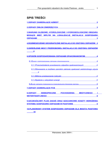 Plan gospodarki odpadami dla miasta Piastowa - aneks 1 SPIS TREŚCI 1.ODPADY ZAWIERAJĄCE AZBEST 2 2.ODPADY ZWŁOK ZWIERZĘCYCH 3 3.WARUNKI GLEBOWE, HYDROLOGICZNE I HYDROGEOLOGICZNE OBSZARU MOGĄCE MIEĆ WPŁYW NA LOKALIZACJĘ INSTALACJI GOSPODARKI ODPADAMI 3 4.ROZMIESZCZENIE GEOGRAFICZNE INSTALACJI DO ODZYSKU ODPADÓW 3 5.OKREŚLENIE MOCY PRZEROBOWEJ INSTALACJI DO ODZYSKU ODPADÓW 4 6.SPOSÓB GOSPODAROWANIA ODPADAMI OPAKOWANIOWYMI 6.1ZASADY GOSPODAROWANIA ODPADAMI OPAKOWANIOWYMI 4 4 6.1.1Przeciwdziałanie powstawaniu odpadów opakowaniowych 4 6.1.2Stosowanie w możliwie szerokim zakresie opakowań wielokrotnego użycia 4 6.1.3Wtórne przetwarzanie (odzysk) 4 6.1.4Spalanie z odzyskiem energii 5 6.2ILOŚĆ ODPADÓW PODDAWANYCH POSZCZEGÓLNYM PROCESOM ODZYSKU 5 7.ODPADY ZAWIERAJĄCE PCB 8.ODPADY NIEBEZPIECZNE 5 POCHODZENIA WETERYNARYJNEGO MEDYCZNEGO I 6 9.SZCZEGÓŁOWY PLAN ZADAŃ ORAZ SZACUNKOWE KOSZTY WDROŻENIA SYSTEMU GOSPODARKI ODPADAMI W PIASTOWIE 6 10.PLANOWANY SYSTEM GOSPODARKI ODPADAMI DLA MIASTA PIASTOWA 16 Warszawa, lipiec 2004 r. Plan gospodarki odpadami dla miasta Piastowa - aneks 1. 2 ODPADY ZAWIERAJĄCE AZBEST Do roku 2010 nie należy spodziewać się wzrostu ilości powstających rocznie odpadów zawierających azbest. Jest to związane z planowaną na skalę krajową w Programie usuwania azbestu inwentaryzacją ilości azbestu na terenie Kraju. Dopiero po przeprowadzeniu szczegółowej inwentaryzacji można spodziewać się znacznego wzrostu ilości odpadów tego rodzaju związanej z rozpoczęciem realizacji programu. Bezpieczne usunięcie odpadów zawierających azbest, powstających w wyniku prowadzenia remontów i demontażu urządzeń lub obiektów zawierających azbest, będzie możliwe po przeprowadzeniu inwentaryzacji urządzeń i obiektów. Wyroby zawierające azbest nie były w Polsce oznakowane lub nazwane w sposób ułatwiający identyfikację w nich azbestu. Skutkiem tego obecne prace remontowe mogą prowadzić do nieświadomego ich uszkodzenia i spowodowania niekontrolowanej emisji pyłu azbestowego. Warunkiem podjęcia działań specjalistycznych w celu zmniejszenia wpływu azbestu na środowisko jest jego identyfikacja i lokalizacja w obiekcie oraz ocena stanu technicznego wyrobu i ryzyka emisji pyłu. Na wstępie niezbędna jest inwentaryzacja wyrobów zawierających azbest oraz określenie rodzaju azbestu. Właściciele lub zarządcy obiektów i urządzeń budowlanych z wbudowanymi wyrobami zawierającymi azbest powinni dokonać przeglądu technicznego tych wyrobów przeprowadzonego zgodnie z wymogami Prawa budowlanego, czyli m.in. z udziałem osoby posiadającej uprawnienia budowlane (wskazane byłoby, żeby znała się ona też na problematyce azbestowej), na podstawie którego powinni sporządzić (w dwóch egzemplarzach) ocenę stanu i możliwości bezpiecznego ich użytkowania. Wypełniony formularz należy złożyć w biurze terenowego organu nadzoru budowlanego. Na tej podstawie możliwe będzie określenie, ile jest takich budynków, i które z nich są w najgorszym stanie technicznym. Istnieją strefy budynków o dużym prawdopodobieństwie występowania azbestu. Szczególną uwagę podczas inwentaryzacji należy zwracać na elementy instalacji wentylacyjnych, urządzeń wodno-kanalizacyjnych i grzewczych, zabezpieczenia ognioochronne konstrukcji stalowych w budynkach o konstrukcji niesztywnej, wyposażenie maszyn wymagających izolacji termicznej, ognioochronnej, elektrycznej. Pamiętać należy, że obecność materiałów zawierających azbest nie zawsze zaznaczona jest w dokumentacji technicznej. Możliwe też, że podczas wykonywania prac zastosowano materiały zastępcze (zawierające azbest), nie umieszczone w projekcie technicznym. Wszystkie wyroby zawierające azbest, które posiadają gęstość objętościową mniejszą niż 1 000 kg/m3 (zawierające azbest niezwiązany cementem) oraz wyroby zawierające azbest, które posiadają gęstość objętościową większą niż 1 000 kg/m3 (wyroby azbestocementowe) zakwalifikowane do wymiany na skutek nadmiernego zużycia powinny być usunięte na koszt właściciela obiektu lub urządzenia budowlanego. Rozporządzenie w/w zostało uchylone ustawą z dnia 27 lipca 2001r. o wprowadzeniu ustawy Prawo ochrony środowiska, ustawy o odpadach oraz o zmianie niektórych ustaw. Zgodnie z delegacją zawartą w nowej ustawie Prawo ochrony środowiska, Minister Gospodarki, Pracy i Polityki Społecznej wydał rozporządzenie z dnia 23 października 2003r. w sprawie wymagań w zakresie wykorzystywania i przemieszczania azbestu oraz wykorzystywania i oczyszczania instalacji lub urządzeń, w których był lub jest wykorzystywany azbest1. Rozporządzenie to zobowiązuje właścicieli, zarządców lub użytkowników miejsc na dokonanie inwentaryzacji zastosowanych wyrobów zawierających azbest do 29.05.2004r. Informację o przeprowadzonej inwentaryzacji przedsiębiorcy winni złożyć wojewodzie, a osoby fizyczne nie będące przedsiębiorcami odpowiednio wójtowi, burmistrzowi lub prezydentowi miasta. Wykorzystywanie azbestu lub wyrobów zawierających azbest dopuszcza się w użytkowanych instalacjach lub urządzeniach nie dłużej niż do dnia 31 grudnia 2032 r. Przemieszczanie azbestu lub wyrobów zawierających azbest po ich usunięciu powinno odbywać się na zasadach określonych przepisami ustawy o odpadach. 1 Dz. U. Nr 192, poz. 1876. Warszawa, lipiec 2004 r. Plan gospodarki odpadami dla miasta Piastowa - aneks 3 Określa się następujące wymagania techniczne dotyczące wykorzystywania azbestu lub wyrobów zawierających azbest: 1) w przypadku ujawnienia widocznych uszkodzeń lub zużycia wyrobu zawierającego azbest właściciel, zarządca lub użytkownik powinien usunąć taki wyrób; 2) dla każdego pomieszczenia, w którym znajdują się instalacje lub urządzenia zawierające azbest lub wyroby zawierające azbest, właściciel, zarządca lub użytkownik sporządza corocznie plan kontroli jako