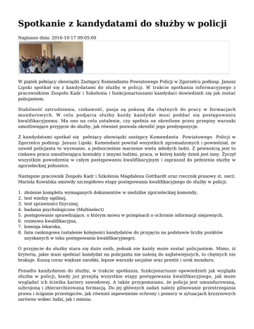 Spotkanie z kandydatami do służby w policji Napisano dnia: 2016-10-17 09:05:00 W piątek pełniący obowiązki Zastępcy Komendanta Powiatowego Policji w Zgorzelcu podinsp. Janusz Lipski spotkał się z kandydatami do służby w policji. W trakcie spotkania informacyjnego z pracownikiem Zespołu Kadr i Szkolenia i funkcjonariuszami kandydaci dowiedzieli się jak zostać policjantem. Stabilność zatrudnienia, ciekawość, pasja są pokusą dla chętnych do pracy w formacjach mundurowych. W celu podjęcia służby każdy kandydat musi poddać się postępowaniu kwalifikacyjnemu. Ma ono na celu ustalenie, czy spełnia on określone przez przepisy warunki umożliwiające przyjęcie do służby, jak również pozwala określić jego predyspozycje. Z kandydatami spotkał się pełniący obowiązki zastępcy Komendanta Powiatowego Policji w Zgorzelcu podinsp. Janusz Lipski. Komendant powitał wszystkich zgromadzonych i powiedział, że zawód policjanta to wyzwanie, a jednocześnie marzenie wielu młodych ludzi. Z pewnością jest to ciekawa praca umożliwiająca kontakty z innymi ludźmi, praca, w której każdy dzień jest inny. Życzył wszystkim powodzenia w całym postępowaniu kwalifikacyjnym i zapraszał do pełnienia służby w zgorzeleckiej jednostce. Następnie pracownik Zespołu Kadr i Szkolenia Magdalena Gotthardt oraz rzecznik prasowy st. sierż. Mariola Kowalska omówiły szczegółowo etapy postępowania kwalifikacyjnego do służby w policji: 1. 2. 3. 4. 5. 6. 7. 8. złożenie kompletu wymaganych dokumentów w siedzibie zgorzeleckiej komendy, test wiedzy ogólnej, test sprawności fizycznej, badania psychologiczne (Multiselect) postępowanie sprawdzające, o którym mowa w przepisach o ochronie informacji niejawnych, rozmowa kwalifikacyjna, komisja lekarska, lista rankingowa (ustalenie kolejności kandydatów do przyjęcia na podstawie liczby punktów uzyskanych w toku postępowania kwalifikacyjnego). O przyjęcie do służby stara się dużo osób, jednak nie każdy może zostać policjantem. Mimo, iż kryteria, jakie musi spełniać kandydat na policjanta nie należą do najłatwiejszych, to chętnych nie brakuje. Kuszą coraz większe zarobki, lepsze warunki socjalne oraz prestiż i urok munduru. Ponadto kandydatom do służby, w trakcie spotkania, funkcjonariusze opowiedzieli jak wygląda służba w policji, kiedy już przejdą wszystkie etapy postępowania kwalifikacyjnego, jak może wyglądać ich ścieżka kariery zawodowej. A także przypomniano, że policja jest umundurowaną, uzbrojoną i zhierarchizowaną formacją. Do jej głównych zadań należy pilnowanie przestrzegania prawa i ściganie przestępców, jak również zapewnienie ochrony i pomocy w sytuacjach kryzysowych zarówno wobec ludzi, jak i mienia. Na koniec spotkania osoby zainteresowane służbą w policji mogły zadawać pytania dotyczące szczegółów związanych z procedurą rekrutacyjną dla kandydatów do służby w policji oraz uzyskać na nie odpowiedzi. Zainteresowani pełnieniem służby w policji mogą uzyskać szczegółowe informacje w Zespole Kadr i Szkolenia Komendy Powiatowej Policji w Zgorzelcu, ul. Boh. II AWP 12G, tel. 75/6494306, 75/6494314 bądź na stronie internetowej www.zgorzelec.policja.gov.pl. Źródło: KPP Zgorzelec