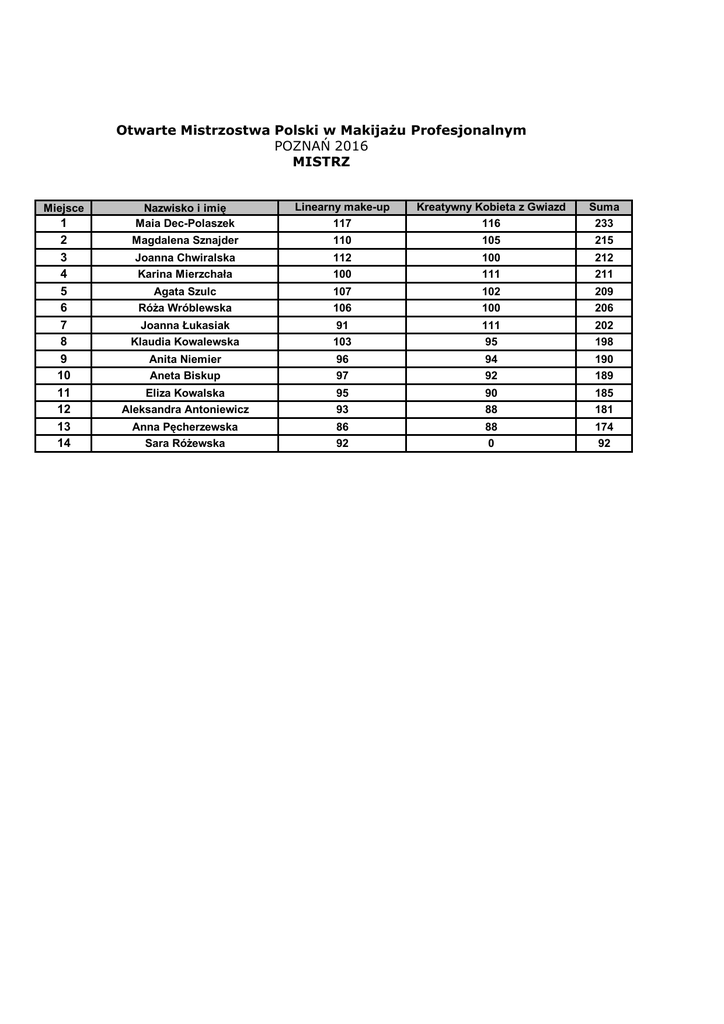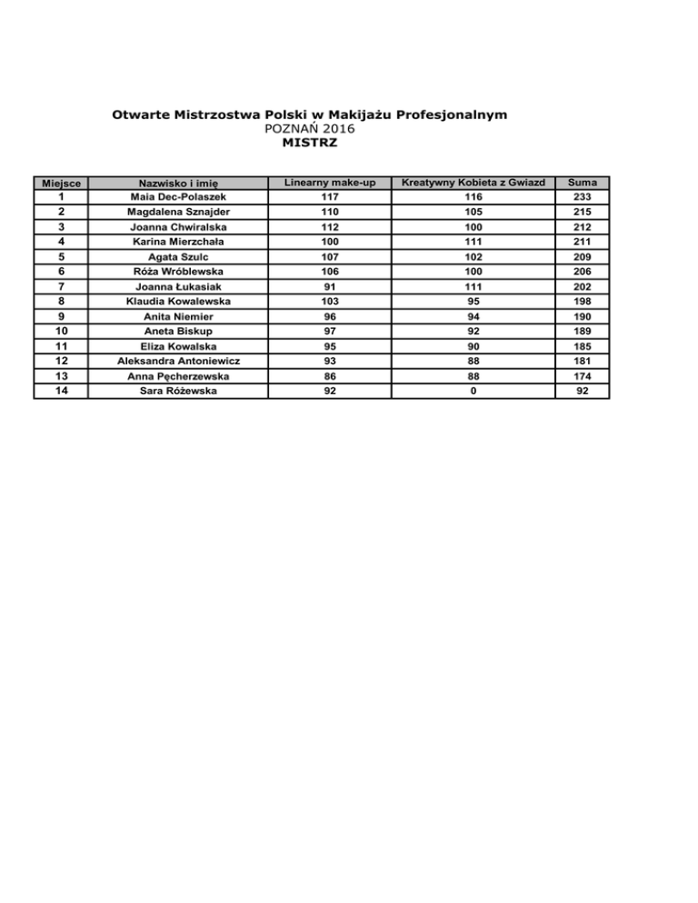 Otwarte Mistrzostwa Polski w Makijażu Profesjonalnym POZNAŃ 2016 MISTRZ Miejsce 1 2 3 4 5 6 7 8 9 10 11 12 13 14 Nazwisko i imię Maia Dec-Polaszek Linearny make-up 117 Kreatywny Kobieta z Gwiazd 116 Suma 233 Magdalena Sznajder 110 105 215 Joanna Chwiralska Karina Mierzchała 112 100 100 111 212 211 Agata Szulc Róża Wróblewska 107 106 102 100 209 206 Joanna Łukasiak Klaudia Kowalewska 91 103 111 95 202 198 Anita Niemier Aneta Biskup 96 97 94 92 190 189 Eliza Kowalska Aleksandra Antoniewicz 95 93 90 88 185 181 Anna Pęcherzewska Sara Różewska 86 92 88 0 174 92