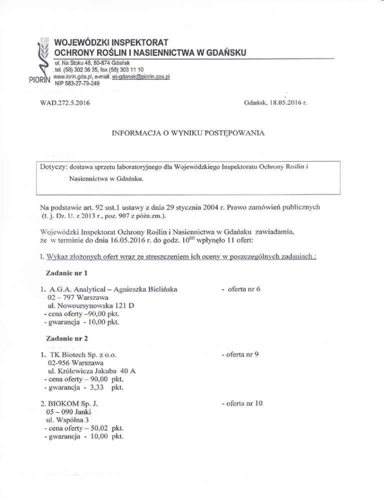 WOJEWODZKI INSPEKTORAT ocHRoNY RosLlN l NAslENNlcTWA W GDANSKU ul. Na Stoku 48, 80-874 Gdańsk :tel, (58) 302 36 35, fax (58) 303 11 10 www.iorin,gda.pl, e-mail: [email protected] ,§ NlP 583-27-79-249 GdŃsk, 18.05.201ó wAD.2,]2.5.20l6 r. INFORMACJA O WYNIKU POSTĘPOWANIA Dotyczy: dostawa sprzętu laboratoryjnego dla Wojewódzkiego Inspelr.loratu Ochrony Roślini Nasierurictwa w Gdańsku. Na podstawie art. 92 ust.l ustawy z dnia 29 stycz:ia2004 t. Prawo zamówień publicznych (t. j. Dz. U. zż013 r,,poz.9O7 z późn.zm.). Wojewódzki lnspektorat Ochrony Roślini Nasiennictwa w Gdańsku zaw,iadamia, że rv terminie do dnia 16.05.2076r. do godz.1000 wpĘnęło 11 ofert: 'Wl,kaz I. złożonychofert rłraz ze streszczeniem ich oceny w poszczególnych zadaniach Zadanie nr 1 1. A.G.A. Analłtical - Agnieszka Bielińska 02 - 797 Warczalva ul. Nowoursynowska 121 D - cena oferty -90,00 pkt. - gwarancja - 10,00 pkt. - oferta nr ó Zadan,ienr2 1. TK Biotech Sp. z o.o. 02-956 Warszawa ul. Królewicza Jakuba 40 - cena ofeńy - 90,00 pkt. - gwarancja - 3,33 pkt. 2, BIOKOM Sp. J. 05 - 090 Janki ' ul. Wspólna 3 - cena oferty - 50,02 pkt. - gwararrcja - 10,00 pkt. - ofelta nr 9 A - ofeńa nr l0 : Zadanie nr 3 Homik Sp.z o.o. 6I-61żPotań ul. Rubież 46 E . cena oferty - gwarancja - oferta nr 1 - oferta nr ż - oferta - oferta nr 3 90,00 pkt 10,00 pkt. - Z,adanie nr 4 o.o. ALAB Sp. z 00-739 Warszawa ul. Stępińska 22130 1ok.222 - cena oferty - 90,00 pkt. - gwmancja 10,00pk1. 1. - 2.VWR Intemational Sp. 80-175 Gdańsk u1. Limborva 5 - cena oferty - gwalancja - - zo.o. ff 4 83,1 1 pkt. 10,00 pkt. Zadanie nr 5 Mettler - Toledo Sp. z o.o. 0ż-82ż'\Narsza,vła ul. Poleczki 21 - cena oferty 90,00 pkt. - gwarancja 10,00 pkt. - żadanie nr 6 1.WITKO Sp. z o.o. 92-322Łódź Al. Piłsudzkiego l43 _ 90,00 pkt. _ .- gwamncja - 10,00 pkt. - oferta nr 4 2. Labsystem Sp. z o,o. - oferta nr 8 cena 31-416lGaków ul. Dobrego Pasterza l00 - 78,80 pkt. - 10,00 pkt. cena - gwarancja 3, Danlab 15-399 BiĄstok ul. Handlowa 6A - 82,30 pkt. - gwarancja - 10,00pkt. cena ,- ofefia nr 7 Zadanie nr 7 I.WITKO Sp. z o.o. 92-322Łódź AJ. Piłsudzkiego 143 - cena - gwarancja - - - ofeńa nr 4 90,00 pkt. 10,00 pkt. 2. Danlab - oferta7 15-399 Białystok - ul. Handlowa 6A 84,27 pkl. gwarancj1- 10,00 pkt. cena - 3. Labsystem Sp, z o.o. - ofeńa nr 8 31-416 Kraków ul. Dobrego Pasterza l00 80,18pkt. - gwarancja - l0,00 pkt. -cena - Zadanie nr 8 WITKO Sp. z o.o, 92-322Łódź Al. Piłsudzkiego 143 - cena -69,07 pkŁ - oferta nr 4 2. Labsystem Sp. z o.o, - oferta nr 8 1, - gwarancja - l0,00 pkt. 31-416l&aków ul. Dobrego Pasterza 100 90,00 pkt. - gwarancja - 10,00 pkt. -cena 3. Frost 05-092 ŁomiaŃi ul. Dobra 9 - cena - 78,77 pk1. - gwarancja - 10 pkt. - oferta nr 1 1 Zgodnie z decyzją komisji przetargowej z dńa16.05.2016 r. wyłoniono Zadanie nt 1 A.G.A. Analytical - Agnieszka Bielinska ' 0ż,- 797 Warszawa ul. Nowoursynowska 121 D z,adanie nr ż TK Biotech Sp. z o.o. 02-956 Warszawa ul. Królewicza Jakuba 40 A - ofeńa nr 6 - oferta nr 9 ofeĘ firm: Zadanie nr 3 Homik Sp.z o.o. 6I-612Poznń ul. Rubież 46 E Zadanie nr 4 ALAB Sp. z o.o. 00-739 Warszawa - ofeńa nr 1 - ofeńa nr 2 - oferta nr 3 uI. Stępińska 22130 lok.222 Zadanie nr 5 - Toledo Sp. z o.o. 02-822Wuszavła ul. Polęczki 2l Mettler Zadanie nr 6 WITKO Sp. z o,o. 92-322Łódź Al. Piłsudzkiego 143 Zadalie nr 7 WITKO Sp. z o,o, 92-322Łótż - oferta nr 4 - oferta nr 4 A1. Piłsudzkiego 143 Zadanie nr 8 Labsystem Sp. z o.o. 31-416 Knków ul. Dobrego Pasterza 100 - ofetla nr 8 Na realizację zadania nr 5 i 8 wystąpiono o dodatkowe środkifinansowe, gdyż wybrane oferty ptzewyższńy wutośćzńezpieczonych środków na dw wymienione zadalia - podstawa prawna art.93 ust.l pkt.4. uzasadnienie: Zostały wybrane oferty, które spełniĘ wymagarria opisane przez Zunańającego w SIWZ. !]a i.1(] l"] Wcjeu,-,,' o.hrony |(.,l ]i] l ] |'. i