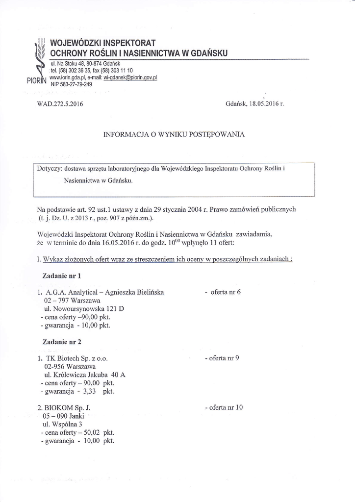 Informacja o wyniku postepowania - Państwowa Inspekcja Ochrony