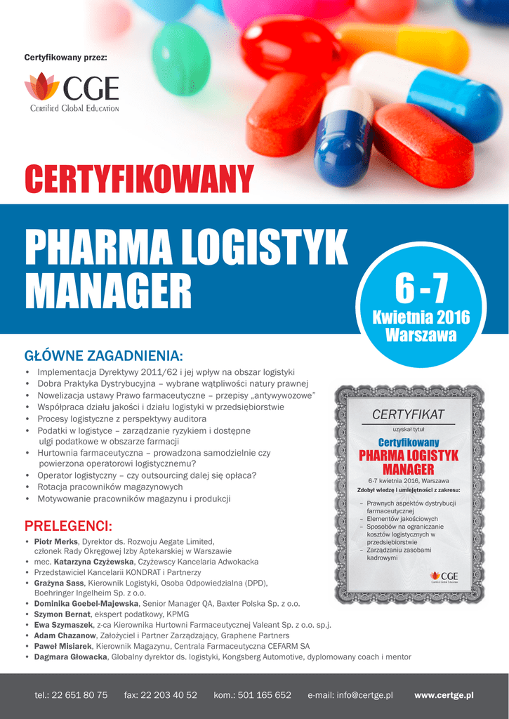 Certyfikowany przez: CERTYFIKOWANY PHARMA LOGISTYK MANAGER 6 -7 Kwietnia 2016 Warszawa GŁÓWNE ZAGADNIENIA: • • • • • • • • • • Implementacja Dyrektywy 2011/62 i jej wpływ na obszar logistyki Dobra Praktyka Dystrybucyjna – wybrane wątpliwości natury prawnej Nowelizacja ustawy Prawo farmaceutyczne – przepisy „antywywozowe” Współpraca działu jakości i działu logistyki w przedsiębiorstwie Procesy logistyczne z perspektywy auditora Podatki w logistyce – zarządzanie ryzykiem i dostępne ulgi podatkowe w obszarze farmacji Hurtownia farmaceutyczna – prowadzona samodzielnie czy powierzona operatorowi logistycznemu? Operator logistyczny – czy outsourcing dalej się opłaca? Rotacja pracowników magazynowych Motywowanie pracowników magazynu i produkcji PRELEGENCI: CERTYFIKAT uzyskał tytuł Certyfikowany PHARMA LOGISTYK MANAGER 6-7 kwietnia 2016, Warszawa Zdobył wiedzę i umiejętności z zakresu: – Prawnych aspektów dystrybucji farmaceutycznej – Elementów jakościowych – Sposobów na ograniczanie kosztów logistycznych w przedsiębiorstwie – Zarządzaniu zasobami kadrowymi • Piotr Merks, Dyrektor ds. Rozwoju Aegate Limited, członek Rady Okręgowej Izby Aptekarskiej w Warszawie • mec. Katarzyna Czyżewska, Czyżewscy Kancelaria Adwokacka • Przedstawiciel Kancelarii KONDRAT i Partnerzy • Grażyna Sass, Kierownik Logistyki, Osoba Odpowiedzialna (DPD), Boehringer Ingelheim Sp. z o.o. • Dominika Goebel-Majewska, Senior Manager QA, Baxter Polska Sp. z o.o. • Szymon Bernat, ekspert podatkowy, KPMG • Ewa Szymaszek, z-ca Kierownika Hurtowni Farmaceutycznej Valeant Sp. z o.o. sp.j. • Adam Chazanow, Założyciel i Partner Zarządzający, Graphene Partners • Paweł Misiarek, Kierownik Magazynu, Centrala Farmaceutyczna CEFARM SA • Dagmara Głowacka, Globalny dyrektor ds. logistyki, Kongsberg Automotive, dyplomowany coach i mentor tel.: 22 651 80 75 fax: 22 203 40 52 kom.: 501 165 652 e-mail: [email protected] www.certge.pl CERTYFIKOWANY PHARMA LOGISTYK MANAGER 6 -7 Kwietnia 2016 Warszawa Szanowni Państwo, Certified Global Education Sp. z o.o. ma zaszczyt i przyjemność zaprosić Państwa do udziału w warsztatach Certyfikowany Pharma Logistyk Manager, które odbędą się w dniach 6–7 kwietnia 2016 roku w Warszawie. Bogaty w interesujące prelekcje program wydarzenia gwarantuje spotkanie na najwyższym poziomie. Tematyka warsztatów koncentruje się wokół czterech głównych zagadnień: 1. Prawnych aspektów dystrybucji farmaceutycznej, 2. Elementów jakościowych, 3. Sposobów na ograniczanie kosztów logistycznych w przedsiębiorstwie 4. Zarządzaniu zasobami kadrowymi. Program spotkania oraz poruszana problematyka zapowiada się niezwykle ambitnie. W ciągu dwóch dni, dzięki obecności Państwa oraz zaproszonych prelegentów – praktyków może dojść do interesującej wymiany opinii na szerokie spectrum problemów. Warto jedynie nadmienić, iż wśród proponowanych zagadnień znajdą się te dotyczące najświeższych zmian w Prawie farmaceutycznym, najczęstszych uwag auditora wewnętrznego dotyczących procesów logistycznych dziejących się w Spółce, wskazówek i podpowiedzi, czym winniśmy się kierować powierzając procesy operatorowi logistycznemu, a wreszcie czy znany jest sposób na zarządzanie ryzykiem rotacji pracowników magazynowych. Na zakończenie spotkania odbędą się 1,5 godzinne ćwiczenia z Państwa udziałem, poświęcone próbie znalezienia rozwiązania na problemy rotacji i ewentualnej niskiej motywacji wśród pracowników produkcji i magazynu. Szanowni Państwo, zachęcamy do udziału w warsztatach Certyfikowany Pharma Logistyk Manager. Jesteśmy do Państwa dyspozycji, w przypadku jakichkolwiek pytań prosimy o kontakt. DLACZEGO WARTO WZIĄĆ UDZIAŁ W KURSIE: • Uzyskanie szerokiej wiedzy z zakresu aktualnych, prawnych aspektów dystrybucji farmaceutycznej • Poznanie ciekawych studiów przypadku z zakresu współpracy działu jakości i działu logistyki, doświadczeń auditora wewnętrznego czy też kierownika magazynu z zakresu rotacji pracowników • Próba znalezienia odpowiedzi na dylemat powierzenia operatorowi logistycznemu procesów magazynowodystrybucyjnych Spółki • Wymiana doświadczeń w obszarze przyczyn i możliwości zarządzania ryzykiem rotacji pracowników KONTAKT: Mariusz Kowalski Tel. 22 651 80 75, 501 165 652 e-mail: [email protected] tel.: 22 651 80 75 fax: 22 203 40 52 kom.: 501 165 652 e-mail: [email protected] www.certge.pl 6 -7 Kwietnia 2016 Warszawa CERTYFIKOWANY PHARMA LOGISTYK MANAGER PROGRAM Dzień I PRAWNE ASPEKTY PROCESÓW LOGISTYCZNYCH W BRANŻY FARMACEUTYCZNEJ 08.45 – 09.00 Rejestracja uczestników 09.00 Otwarcie warsztatów 09.10 Implementacja Dyrektywy 2011/62 i jej wpływ na obszar logistyki • omówienie aktów wykonawczych • proces implementacji dyrektywy w Polsce • czy jednostki obrotu hurtowego będą miały swój udział w realizacji przepisów dyrektywy? Prowadzący: Piotr Merks, Dyrektor ds. Rozwoju Aegate Limited, członek Rady Okręgowej Izby Aptekarskiej w Warszawie 10.10 Implementacja Dyrektywy 2011/62 na gruncie przedsiębiorstwa • jakie procedury? • jakie instrukcje? • jak wdrożyć? • zakresy odpowiedzialności uczestników procesu Prowadzący: Piotr Merks, Dyrektor ds. Rozwoju Aegate Limited, członek Rady Okręgowej Izby Aptekarskiej w Warszawie 11.10 Przerwa na kawę 11.25 Dobra Praktyka Dystrybucyjna – z perspektywy prawnika • wybrane wątpliwości natury prawnej • zakres zadań i odpowiedzialności Osoby Odpowiedzialnej – przypadek „stałej osiągalności” • w jaki sposób interpretować różnice pomiędzy Wytycznymi Komisji Europejskiej z dnia 5 listopada 2013 r. a Rozporządzeniem Ministra Zdrowia w sprawie wymagań Dobrej Praktyki Dystrybucyjnej z dnia 13 marca 2015 roku Prowadząca: mec. Katarzyna Czyżewska, Czyżewscy Kancelaria Adwokacka 12.25 Nowelizacja ustawy Prawo farmaceutyczne – p
