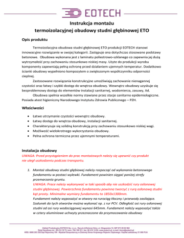 Instrukcja montażu termoizolacyjnej obudowy studni głębinowej ETO Opis produktu Termoizolacyjna obudowa studni głębinowej ETO produkcji EOTECH stanowi innowacyjne rozwiązanie w swojej kategorii. Zastępuje ona dotychczas stosowane podstawy betonowe. Obudowa wykonana jest z laminatu poliestrowo-szklanego co zapewnia jej dużą wytrzymałośd przy zachowaniu stosunkowo niskiej masy. Użyte do produkcji wyrobu komponenty zapewniają pełną ochronę przed działaniem ujemnych temperatur. Dodatkowo ścianki obudowy wypełniono kompozytem o zwiększonym współczynniku odporności cieplnej. Zastosowane rozwiązania konstrukcyjne umożliwiają zachowanie nienagannej czystości oraz łatwy i szybki dostęp do wnętrza obudowy. Wewnątrz obudowy uzyskuje się bezproblemowy dostęp do elementów instalacji sanitarnej, wodomierza, zasuwy, itd. Obudowa spełnia wszelkie normy stawiane przez stacje sanitarno epidemiologiczne. Posiada atest higieniczny Narodowego Instytutu Zdrowia Publicznego – PZH. Właściwości Łatwe utrzymanie czystości wewnątrz obudowy. Łatwy dostęp do wnętrza obudowy, instalacji sanitarnej. Charakteryzuje się solidną konstrukcją przy zachowaniu stosunkowo niskiej wagi. Możliwośd wielokrotnego wykorzystania obudowy. Pełna ochrona termiczna przez ujemnymi temperaturami. Instalacja obudowy UWAGA: Przed przystąpieniem do prac montażowych należy się upewnid czy produkt nie uległ uszkodzeniu podczas transportu. 1. Montaż obudowy studni głębiowej należy rozpocząd od wykonania betonowego fundamentu w postaci wylewki. Fundament powinien sięgad poniżej strefy przemarzania gruntu. UWAGA: Prace należy wykonywad w taki sposób aby nie uszkodzid rury osłonowej studni głębinowej. Powierzchnia fundamentu powinna tworzyd z rurą osłonową studni kąt prosty. Minimalne wymiary fundamentu to 1850x1300mm. Fundament należy wyposażyd w otwory na rurociąg tłoczny i przewody zasilające. Szalunek do tych otworów można wykonad np. z rur PCV. Odległośd osi rury osłonowej studni od osi rury wodociągowej wynosi 645mm. Fundament należy wyposażyd także w cztery aluminiowe uchwyty przeznaczone do przymocowania obudowy 2. 3. 4. 5. do fundamentu. Uchwyty znajdują się w zestawie. UWAGA: Montaż obudowy bez fundamentu jest niedopuszczalny. Prowadzid on może do uszkodzenia rury osłonowej studni. Sprawdzid kąt pomiędzy osią rury osłonowej studni a wylanym fundamentem. Kąt powinien wynosid 90 stopni. Przystąpid do montażu obudowy na fundamencie. Po ustawieniu obudowy na fundamencie należy wykręcid śruby służące do przenoszenia obudowy. Obudowę przykręcid do aluminiowych uchwytów. Szczelinę pomiędzy obudową, a fundamentem wypełnid masą uszczelniającą na bazie silikonu. Podłączyd instalację sanitarną i elektryczną. UWAGA: Montaż i odłączenie instalacji elektrycznej powinna wykonad osoba do tego uprawniona. Po zakooczeniu prac instalacyjnych należy zamknąd obudowę na zamek znajdujący się w pokrywie. Instalacja sanitarna Obudowa wyposażona jest w armaturę sanitarną o średnicy 80mm. Komponenty armatury sanitarnej: Wodomierz śrubowy MWN 80. Zawór zwrotny ZETKA VAG DN80 Przepustnica zaporowa DANFOSS SOCLA SYLAX DN80 Kran poboru próbek Manometr Instalacja sanitarna obudowy zawiera proste odcinki rurociągu potrzebne do montażu wodomierza. Instalacja elektryczna Wewnątrz obudowy znajduje się skrzynka elektryczna z tworzywa sztucznego. Pozwala ona na podłączenie przewodu pompy głębinowej z przewodem zasilającym obudowę. Ponadto skrzynka elektryczna wyposażona jest także w wejście dla jednofazowego przewodu do zasilania termostatu o mocy do 0,22W i gniazda serwisowego. Przewód termostatu powinien byd zabezpieczony wyłącznikiem różnico prądowym o prądzie upływu 30mA. Nastawa temperatury na termostacie powinna wynosid 3 stopnie Celsjusza. Wówczas termostat będzie utrzymywad temperaturę w przedziale od 2 do 4 stopni Celsjusza. Budowa Opis: 1 - Fundament 2 - Rura osłonowa studni 3 - Rura pompy głębinowej 4 - Podstawa obudowy termoizolacyjnej 5 - Zamek zamykany na klucz 6 - Głowica studni 7 - Podnoszona pokrywa 8 – Wodomierz 9 - Zawór zwrotny 10 - Manometr 11 - Przepustnica ręczna 12 - Skrzynka elektryczna 13 - Ocieplenie rury wodociągowej 14 - Rura wodociągowa 15 - Punkt stały 16 Otwory dla kabla zasilającego pompę i kabla termostatu 17 - Kotwy mocujące obudowę do fundamentu