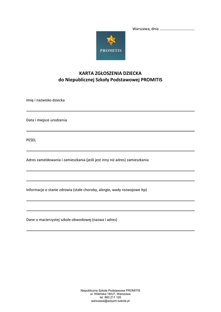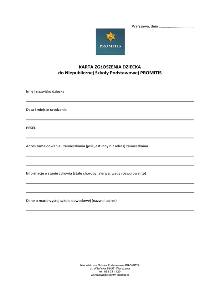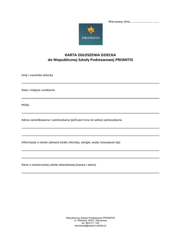 Warszawa, dnia .................................. KARTA ZGŁOSZENIA DZIECKA do Niepublicznej Szkoły Podstawowej PROMITIS Imię i nazwisko dziecka Data i miejsce urodzenia PESEL Adres zameldowania i zamieszkania (jeśli jest inny niż adres) zamieszkania Informacje o stanie zdrowia (stałe choroby, alergie, wady rozwojowe itp) Dane o macierzystej szkole obwodowej (nazwa i adres) Niepubliczna Szkoła Podstawowa PROMITIS ul. Wileńska 18/U7, Warszawa tel. 883 211 120 [email protected] RODZICE Imię i nazwisko matki/opiekunki prawnej, telefon Imię i nazwisko ojca/opiekuna prawnego, telefon Adres e-mail DZIECKO Samodzielność (proszę zaznaczyć te stwierdzenia, które charakteryzują Państwa dziecko): Potrafi samo się ubrać Ubiera się z niewielką pomocą osób dorosłych Wymaga pomocy przy ubieraniu Samo radzi sobie z jedzeniem Wymaga niewielkiej pomocy przy jedzeniu Trzeba je karmić Pamięta o potrzebach fizjologicznych i radzi sobie samo Zgłasza swoje potrzeby, ale wymaga pomocy przy pójściu do toalety Trzeba je pilnować, bo zapomina o zgłaszaniu potrzeb fizjologicznych Inne uwagi dotyczące samodzielności dziecka: Jedzenie (proszę zaznaczyć te stwierdzenia, które charakteryzują Państwa dziecko): Praktycznie je wszystko, nie ma specjalnych upodobań Jest po prostu niejadkiem Potrawy i/lub produkty, których dziecko nie chce jeść (proszę wymienić): Potrawy i/lub produkty, które dziecko uwielbia i które mu przeważnie smakują (proszę wymienić): Ulubione zabawy i zabawki dziecka: Niepubliczna Szkoła Podstawowa PROMITIS ul. Wileńska 18/U7, Warszawa tel. 883 211 120 [email protected] Ulubione książki dziecka: Szczególne uzdolnienia dziecka: Jak rodzice spędzają czas wolny z dzieckiem? Z kim dziecko najczęściej spędza czas wolny? W jaki sposób dziecko jest nagradzane? W jaki sposób dziecko jest karane? Czy są sytuacje (jakie?), w których dziecko czuje się zagrożone? Kiedy dziecko czuje się szczęśliwe? Jakie zachowania dziecka budzą niepokój rodziców? Jakie zachowania pozytywne obserwują rodzice u swojego dziecka? Niepubliczna Szkoła Podstawowa PROMITIS ul. Wileńska 18/U7, Warszawa tel. 883 211 120 [email protected] Czy dziecko ma koleżanki, kolegów? W jakim wieku? Czy dziecko jest zgodne w zabawie? Czy dziecko wykazuje reakcje agresywne? W jakich sytuacjach? W jakich sytuacjach dziecko się denerwuje? Inne uwagi Kiedy u dziecka został zdiagnozowany autyzm? Z jakich form wspomagania rozwoju dziecko aktualnie korzysta? Czy dziecko było wcześniej objęte pomocą terapeutyczną, z której aktualnie już nie korzysta? Jeśli tak, to w jakiej formie? Niepubliczna Szkoła Podstawowa PROMITIS ul. Wileńska 18/U7, Warszawa tel. 883 211 120 [email protected] Czy dziecko uczęszczało wcześniej do szkoły? Jeśli tak, to gdzie uczęszczało i przez jaki okres czasu? Oczekiwania rodziców wobec szkoły i nauczyciela: Oświadczamy, że przedłożone przez nas informacje są zgodne ze stanem faktycznym. Wyrażamy zgodę na przetwarzanie danych osobowych dla potrzeb niezbędnych do realizacji zadań opiekuńczo-wychowawczych szkoły (zgodnie z ustawa z dnia 29.08.1997 roku o Ochronie Danych Osobowych Dz. Ust Nr 133 poz.883). Wyrażamy zgodę / nie wyrażamy zgody na publikację zdjęć dziecka z imprez i uroczystości szkolnych na stronie internetowej promującej placówkę oraz w ramach przekazywania informacji o pracy dydaktyczno – wychowawczej szkoły. Data: Podpis matki (opiekunki prawnej): Podpis ojca (opiekuna prawnego): Niepubliczna Szkoła Podstawowa PROMITIS ul. Wileńska 18/U7, Warszawa tel. 883 211 120 [email protected]