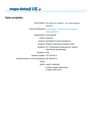Opis projektu tytuł projektu: Od dobrych praktyk - po nowoczesne zawody nazwa beneficjenta: Europejskie Towarzystwo Inicjatyw Obywatelskich województwo: mazowieckie powiat: sierpecki fundusz: Europejski Fundusz Społeczny program: Program Operacyjny Kapitał Ludzki działanie: 9.2. Podniesienie atrakcyjności i jakości szkolnictwa zawodowego dziedzina: brak wartość projektu: 770 100.00 zł dofinansowanie z Unii Europejskiej: 654 585.00 zł ocena: sektor: nauka i edukacja punktor projekt realizowany w latach 2007-2013