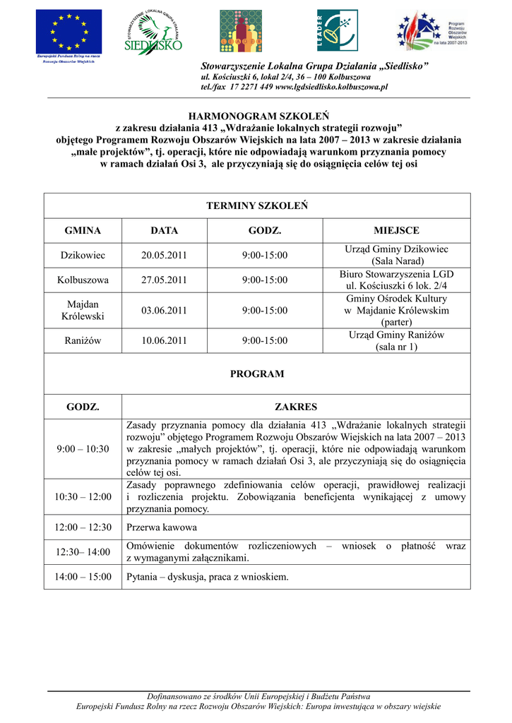 IAŁANIA DZ STOWARZ YS Z PA LOKALNA G IE RU EN Stowarzyszenie Lokalna Grupa Działania „Siedlisko” ul. Kościuszki 6, lokal 2/4, 36 – 100 Kolbuszowa tel./fax 17 2271 449 www.lgdsiedlisko.kolbuszowa.pl HARMONOGRAM SZKOLEŃ z zakresu działania 413 „Wdrażanie lokalnych strategii rozwoju” objętego Programem Rozwoju Obszarów Wiejskich na lata 2007 – 2013 w zakresie działania „małe projektów”, tj. operacji, które nie odpowiadają warunkom przyznania pomocy w ramach działań Osi 3, ale przyczyniają się do osiągnięcia celów tej osi TERMINY SZKOLEŃ GMINA DATA GODZ. Dzikowiec 20.05.2011 9:00-15:00 Kolbuszowa 27.05.2011 9:00-15:00 Majdan Królewski 03.06.2011 9:00-15:00 Raniżów 10.06.2011 9:00-15:00 MIEJSCE Urząd Gminy Dzikowiec (Sala Narad) Biuro Stowarzyszenia LGD ul. Kościuszki 6 lok. 2/4 Gminy Ośrodek Kultury w Majdanie Królewskim (parter) Urząd Gminy Raniżów (sala nr 1) PROGRAM GODZ. 9:00 – 10:30 10:30 – 12:00 ZAKRES Zasady przyznania pomocy dla działania 413 „Wdrażanie lokalnych strategii rozwoju” objętego Programem Rozwoju Obszarów Wiejskich na lata 2007 – 2013 w zakresie „małych projektów”, tj. operacji, które nie odpowiadają warunkom przyznania pomocy w ramach działań Osi 3, ale przyczyniają się do osiągnięcia celów tej osi. Zasady poprawnego zdefiniowania celów operacji, prawidłowej realizacji i rozliczenia projektu. Zobowiązania beneficjenta wynikającej z umowy przyznania pomocy. 12:00 – 12:30 Przerwa kawowa 12:30– 14:00 Omówienie dokumentów rozliczeniowych – wniosek o płatność wraz z wymaganymi załącznikami. 14:00 – 15:00 Pytania – dyskusja, praca z wnioskiem. Dofinansowano ze środków Unii Europejskiej i Budżetu Państwa Europejski Fundusz Rolny na rzecz Rozwoju Obszarów Wiejskich: Europa inwestująca w obszary wiejskie