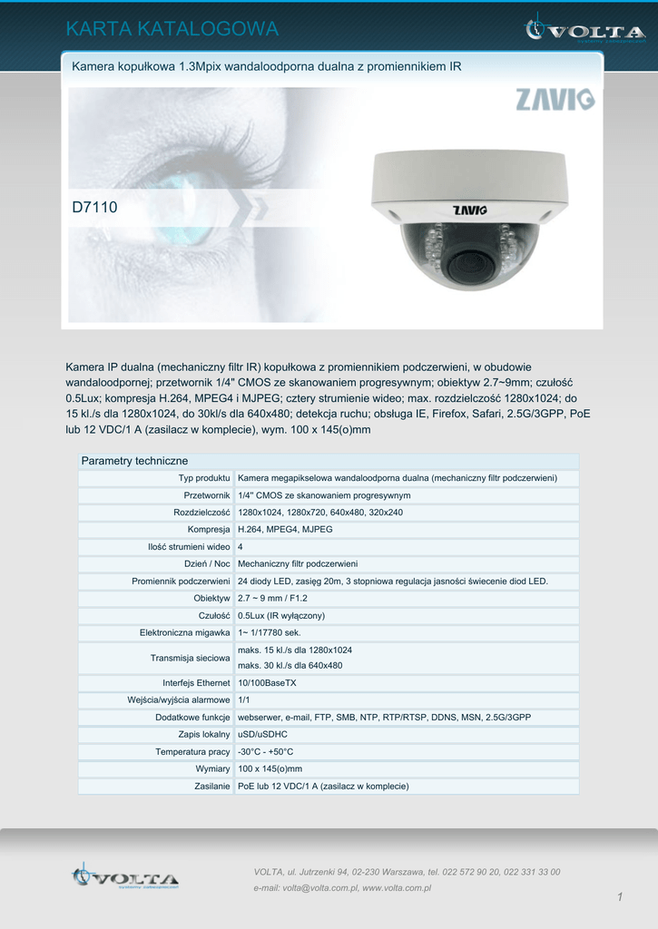KARTA KATALOGOWA Kamera kopułkowa 1.3Mpix wandaloodporna dualna z promiennikiem IR D7110 Kamera IP dualna (mechaniczny filtr IR) kopułkowa z promiennikiem podczerwieni, w obudowie wandaloodpornej; przetwornik 1/4" CMOS ze skanowaniem progresywnym; obiektyw 2.7~9mm; czułość 0.5Lux; kompresja H.264, MPEG4 i MJPEG; cztery strumienie wideo; max. rozdzielczość 1280x1024; do 15 kl./s dla 1280x1024, do 30kl/s dla 640x480; detekcja ruchu; obsługa IE, Firefox, Safari, 2.5G/3GPP, PoE lub 12 VDC/1 A (zasilacz w komplecie), wym. 100 x 145(o)mm Parametry techniczne Typ produktu Kamera megapikselowa wandaloodporna dualna (mechaniczny filtr podczerwieni) Przetwornik 1/4'' CMOS ze skanowaniem progresywnym Rozdzielczość 1280x1024, 1280x720, 640x480, 320x240 Kompresja H.264, MPEG4, MJPEG Ilość strumieni wideo 4 Dzień / Noc Mechaniczny filtr podczerwieni Promiennik podczerwieni 24 diody LED, zasięg 20m, 3 stopniowa regulacja jasności świecenie diod LED. Obiektyw 2.7 ~ 9 mm / F1.2 Czułość 0.5Lux (IR wyłączony) Elektroniczna migawka 1~ 1/17780 sek. Transmisja sieciowa maks. 15 kl./s dla 1280x1024 maks. 30 kl./s dla 640x480 Interfejs Ethernet 10/100BaseTX Wejścia/wyjścia alarmowe 1/1 Dodatkowe funkcje webserwer, e-mail, FTP, SMB, NTP, RTP/RTSP, DDNS, MSN, 2.5G/3GPP Zapis lokalny uSD/uSDHC Temperatura pracy -30°C - +50°C Wymiary 100 x 145(o)mm Zasilanie PoE lub 12 VDC/1 A (zasilacz w komplecie) VOLTA, ul. Jutrzenki 94, 02-230 Warszawa, tel. 022 572 90 20, 022 331 33 00 e-mail: [email protected], www.volta.com.pl 1