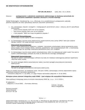 DO WSZYSTKICH WYKONAWCÓW FZP.281.58.2016.V Dotyczy: Łódź, dnia 10.11.2016r. postępowania o udzielenie zamówienia sektorowego na dostawę samochodu do czyszczenia osadników wpustów ulicznych w formie leasingu Zakład Wodociągów i Kanalizacji Sp. z o.o. informuje, że w przedmiotowym postępowaniu wpłynęły pisemne zapytania do treści specyfikacji istotnych warunków zamówienia : 1. Czy zamawiający dopuści wysięgnik o następujących parametrach pracy ( dotyczy pkt.44 specyfikacji technicznej): prawa strona pojazdu 4475 mm od osi pojazdu, lewa strona pojazdu 2875 mm od osi pojazdu, z tyłu pojazdu 3900 mm licząc od gabarytu pojazdu ? Odpowiedź Zamawiającego: Zamawiający wyraża zgodę na takie rozwiązania. 2. Co Zamawiający rozumie przez elektroniczny moduł kontroli pracy pomp (SPS)? Jakie jest zadanie takiego modułu? Od czego pochodzi nazwa SPS? Odpowiedź Zamawiającego: Jest to moduł elektroniczny połączony z układem sterowania umożliwiający odczyt parametrów pracy pomp między innymi bieżące obroty, ciśnienie, podciśnienie, ilość przepracowanych mth z możliwością automatycznego lub ręcznego ustawiania parametrów pracy w/w urządzeń. 3. Co Zamawiający rozumie przez system antyskażeniowy, który ma zabezpieczać pobór wody? Czy jest to system uniemożliwiający cofnięcie się wody ze zbiornika do rurociągu zasilającego? Odpowiedź Zamawiającego: Tak jest to system uniemożliwiający cofniecie się wody do instalacji wodociągowej podczas napełniania zbiornika wody czystej. 4. Czy przez sprzęgło elektro-pneumatyczne należy rozumieć sprzęgło pneumatyczne sterowane elektrycznie? Odpowiedź Zamawiającego: Tak jest to sprzęgło pneumatyczne sterowane elektrycznie. Mając na uwadze powyższe, na podstawie rozdz. VIII pkt.4 SIWZ, Zamawiający zmienia odpowiednie zapisy specyfikacji istotnych warunków zamówienia: - unieważnia załącznik nr 1 do SIWZ, a w jego miejsce wprowadza załączniki nr 1A do SIWZ. Niniejsze pismo stanowi integralną część SIWZ i jest wiążące dla wszystkich Wykonawców. Data publikacji niniejszego pisma na stronie internetowej ZWIK Sp. z o.o.: 14.11.2016 r. W załączeniu : - załącznik nr 1A do SIWZ - Formularz ofertowy Członek Zarządu Marcin Długoborski Sprawę prowadzi: Joanna Kmiecik tel.42 67 78 120 Strona 1 z 1 Zakład Wodociągów i Kanalizacji Sp. z o.o. 90-133 Łódź, ul. Wierzbowa 52, Sąd rejestrowy: Sąd Rejonowy dla Łodzi Śródmieścia w Łodzi, XX Wydział Krajowego Rejestru Sądowego Nr KRS 0000045146; NIP 725-18-01-126 Wysokość kapitału zakładowego 25.400.000,00 zł